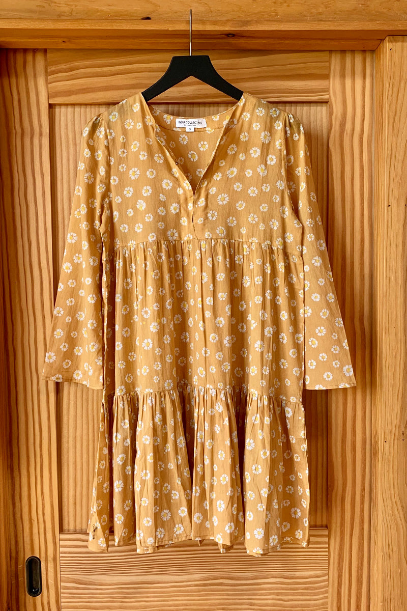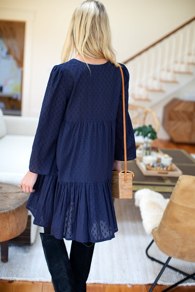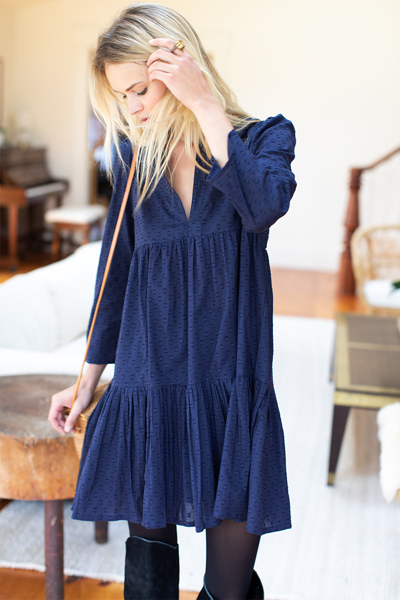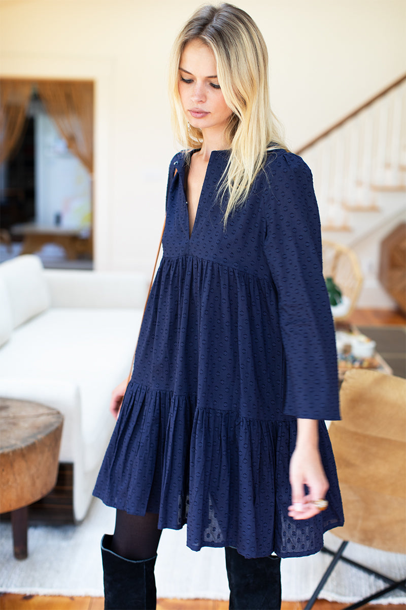 Cotton w/ swiss dots Low impact dye Slightly sheer, easy/breezy fit Models both wearing a size small Neckline opening 11" w/ hook + eye closures Made in Rajasthan, India Hand wash...