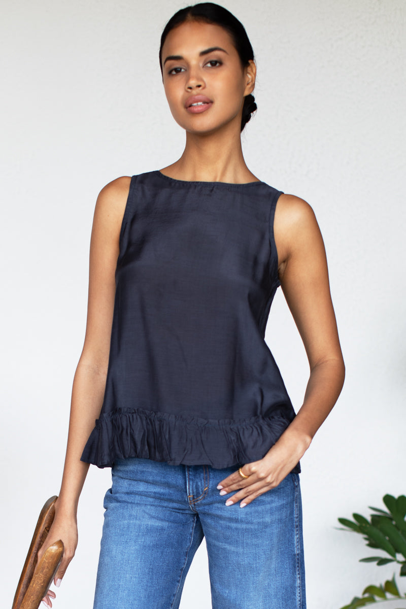 Modal High neckline Keyhole opening at back w/ button closure Sleeveless silhouette Gathered ruffle at hem Unlined Made in Rajasthan, India XS: Bust 34”, Length 20” S: Bust 36”, Length...