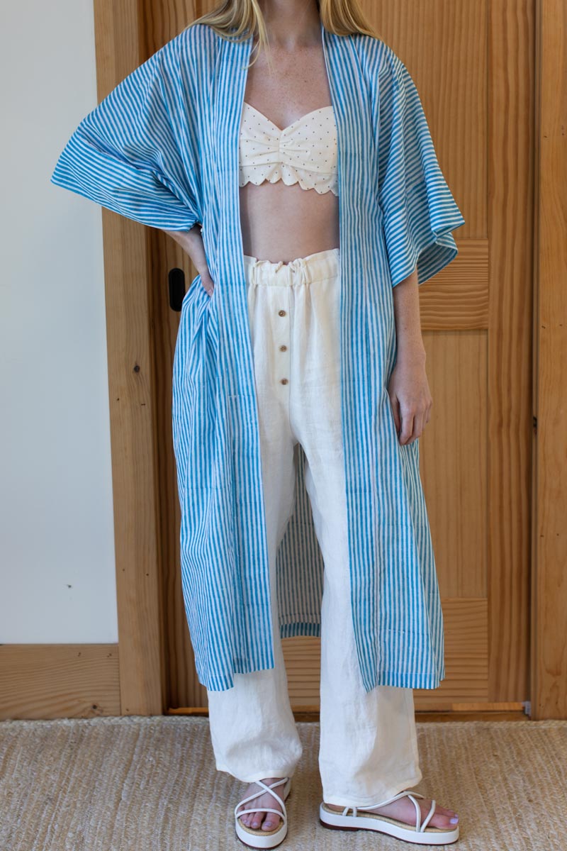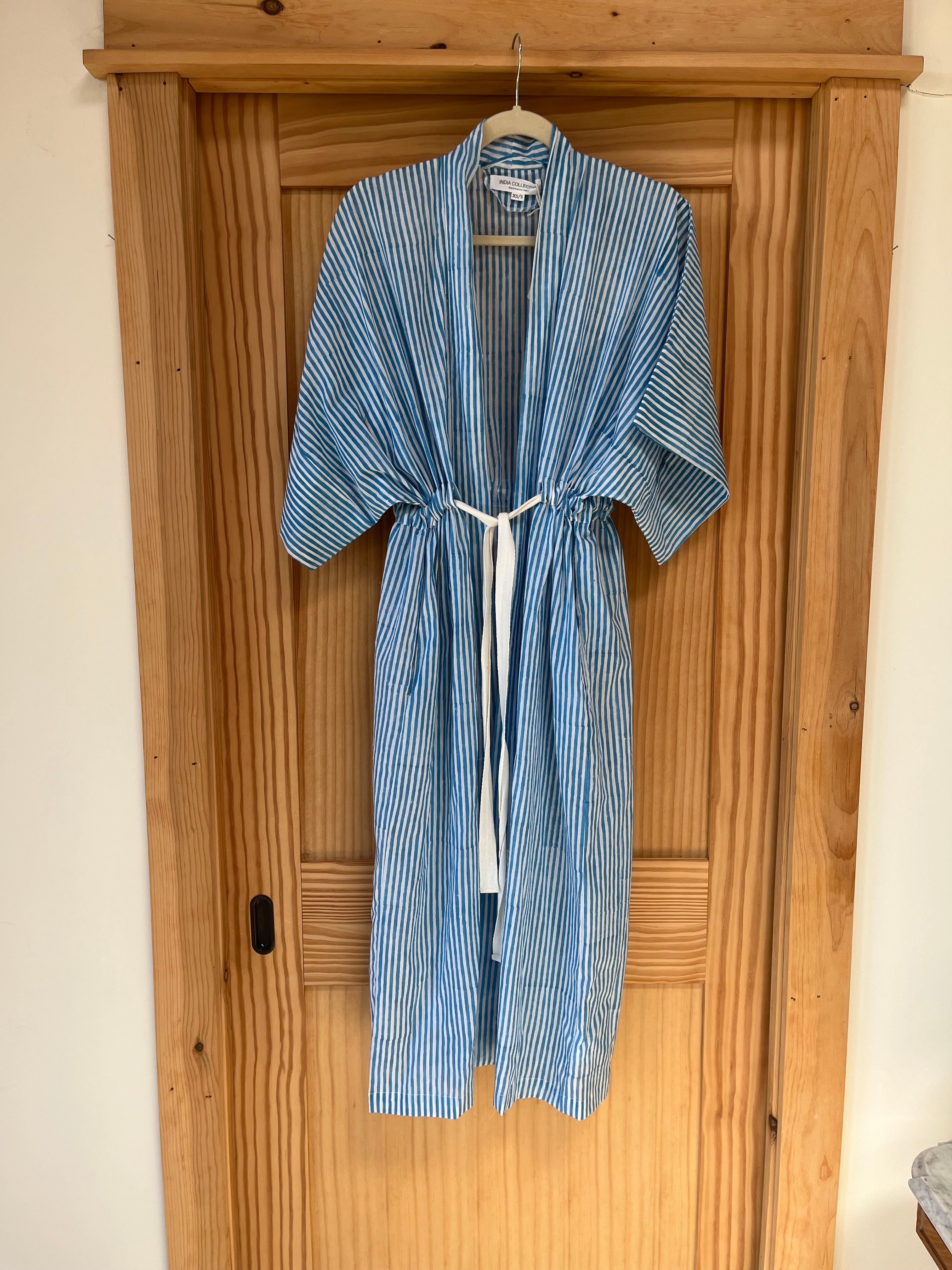 Organic Cotton Hand block printed using low impact dye Adjustable drawstring waist Kimono style sleeves Midi length Side seam pockets Unlined Made in Rajasthan, India Hand wash cool + line...