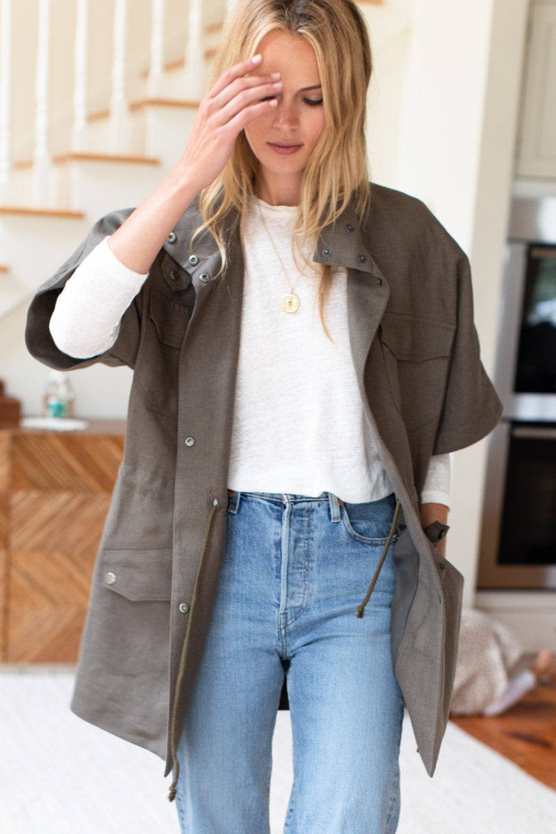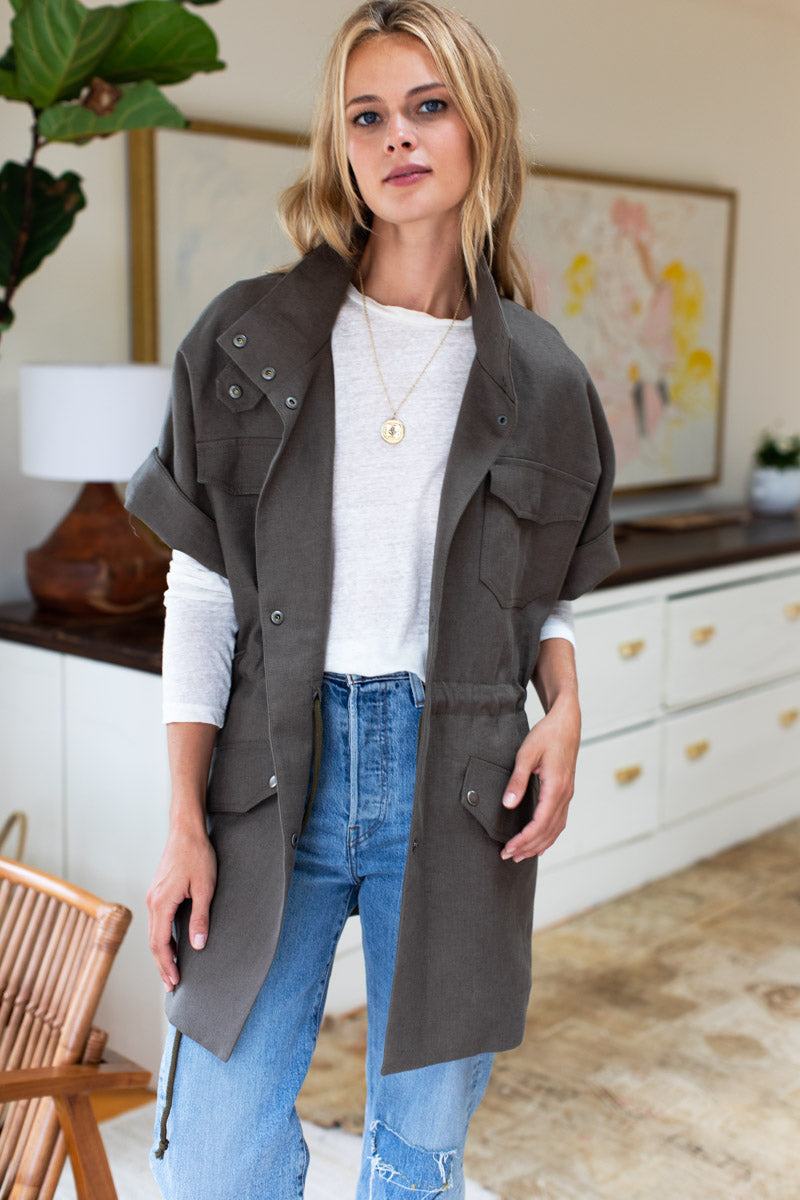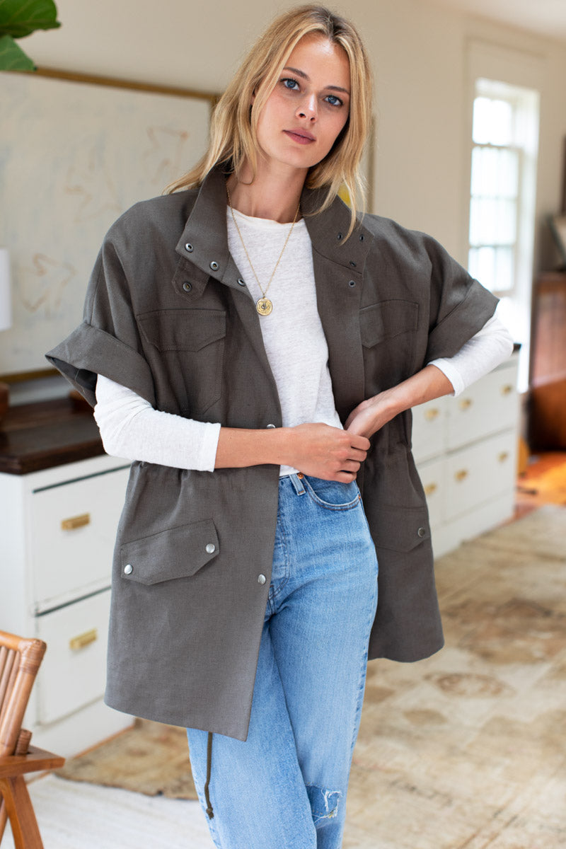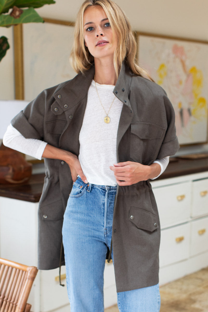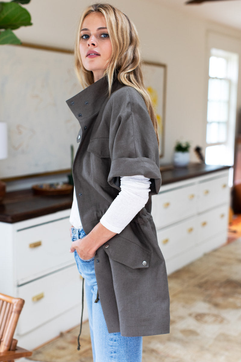 Made from Hemp and Certified Organic Cotton Canvas Military inspired styling Four flap pockets on front Brass snap closures High collar with snap tab Sleeves can be rolled or unrolled...