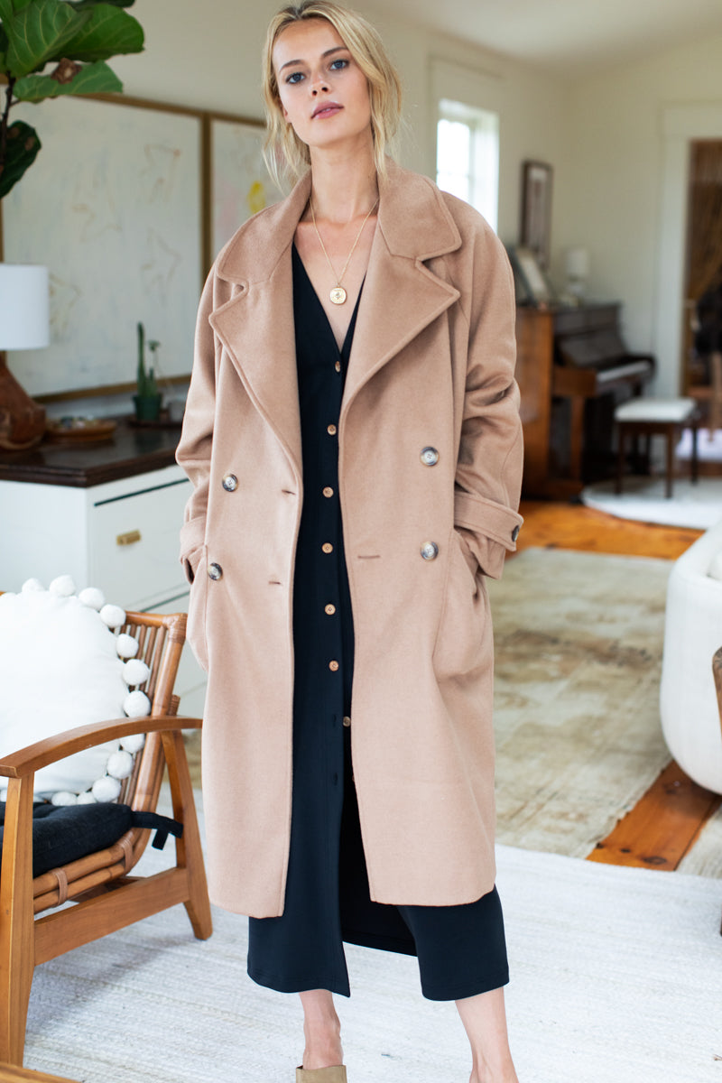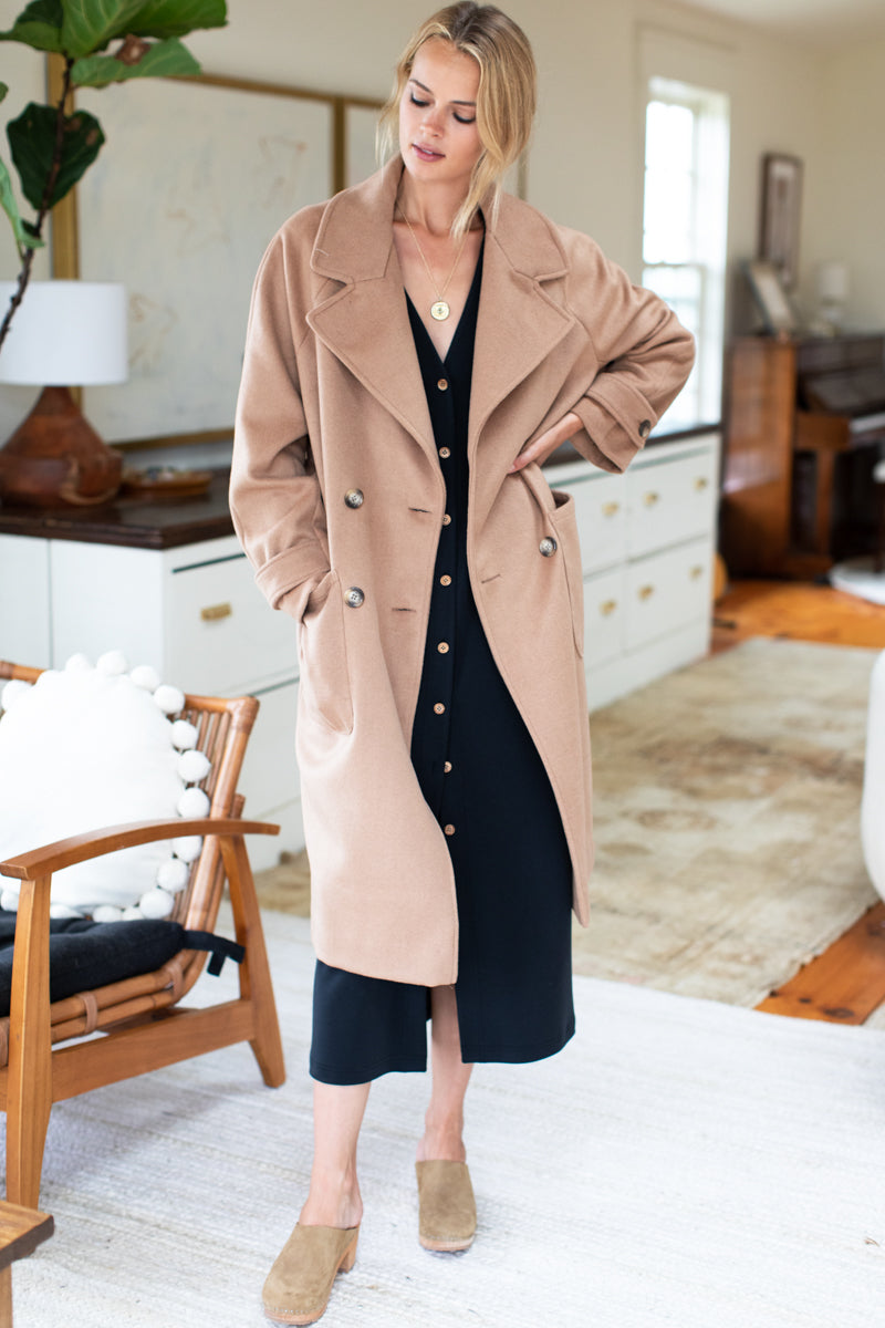 Wool cashmere Maxi length Button closures at front Notched lapel Raglan sleeves Adjustable cuff strap Angled welt pockets Lined Model is wearing a size large Made in NYC XXS: Bust...