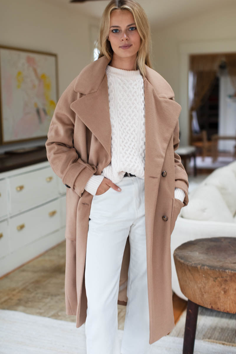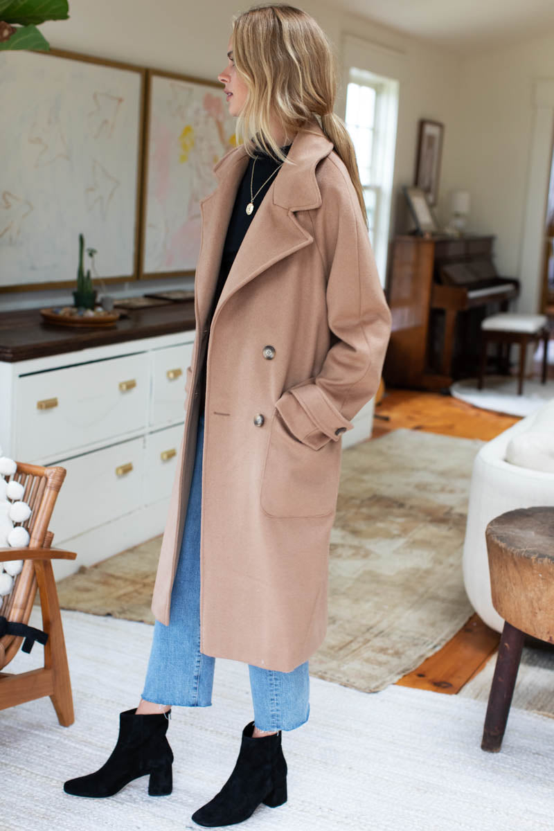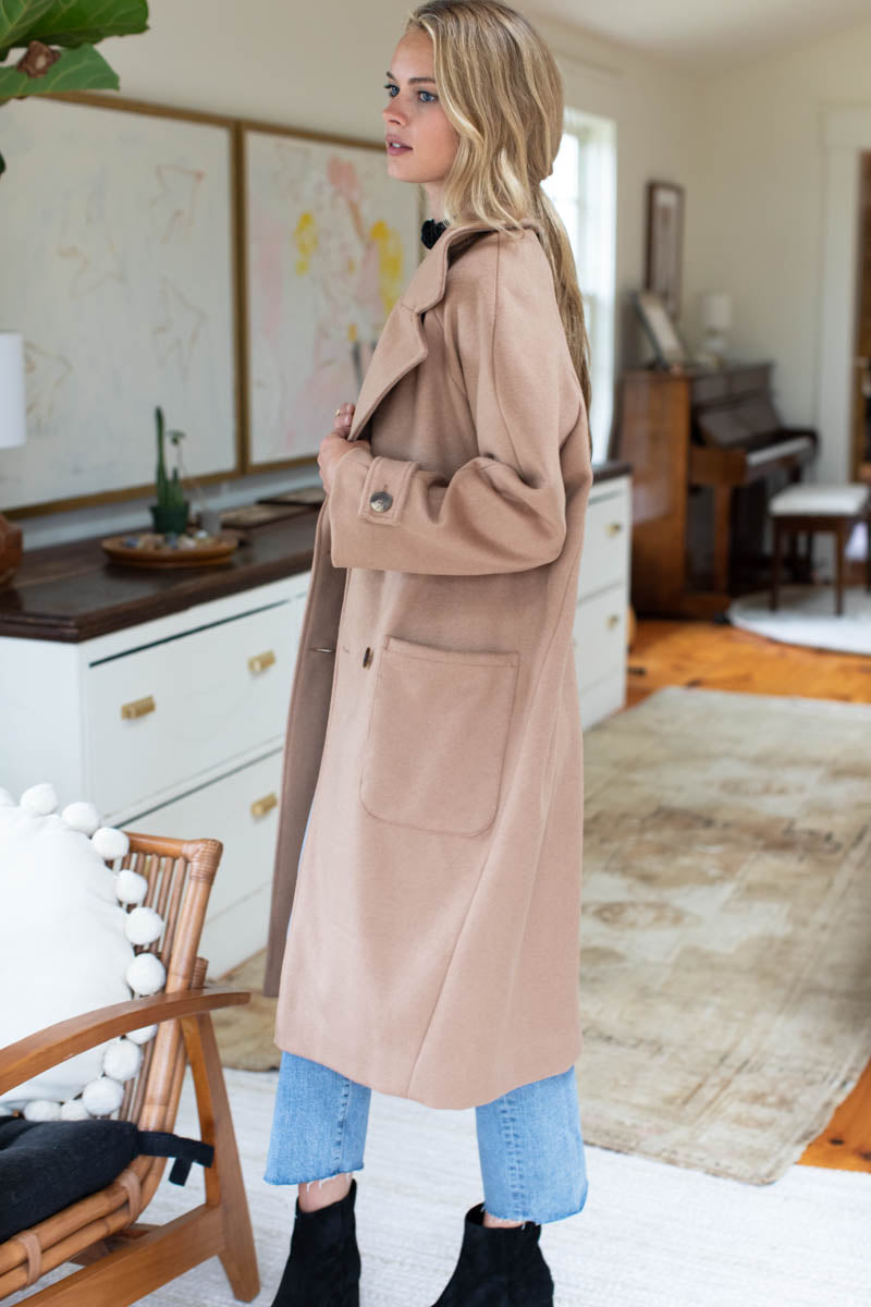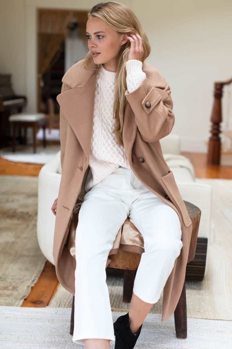 Cashmere wool blend Double breasted Raglan sleeve Patch Pockets on front Large lapel notched collar Fully Lined Green dry clean Relaxed fit through shoulder Slightly tapered, subtle cocoon fit through...