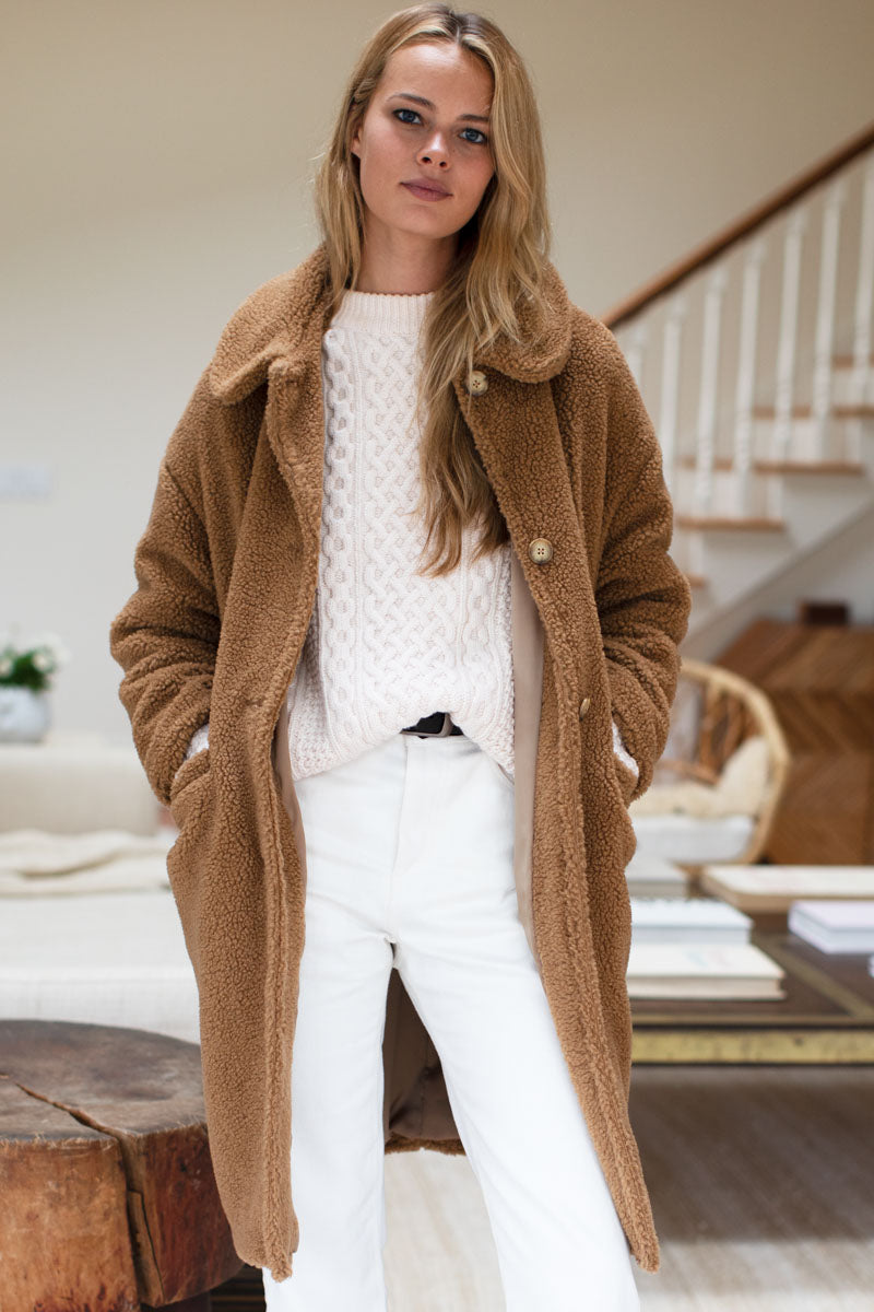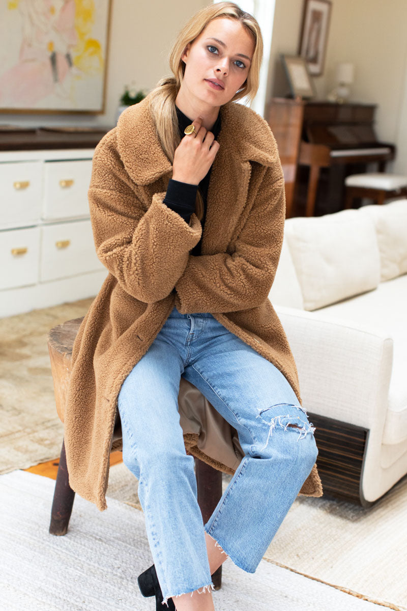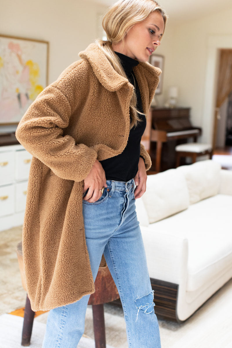 Italian Sherpa Fleece 52% acrylic and 48% Polyester Button front closure Front welt pockets Full length sleeves Flannel back liner - fully lined Model is wearing a size s Dry...