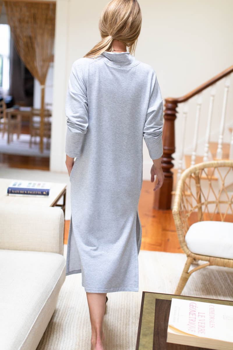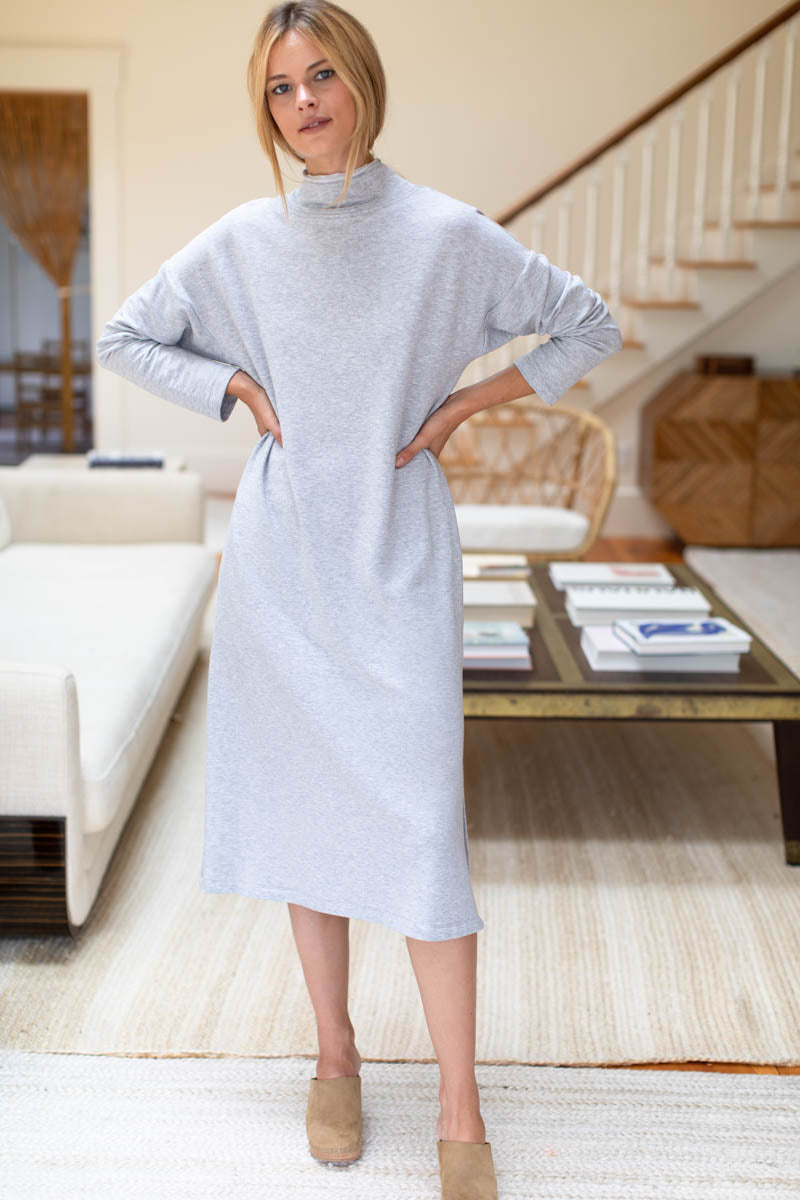 Tencel + Organic cotton french terry w/ 6% stretch Side seam pockets Bottom hem side openings Midi length dress Dropped shoulders Full length sleeves Model is 5'9 Gentle wash, air...