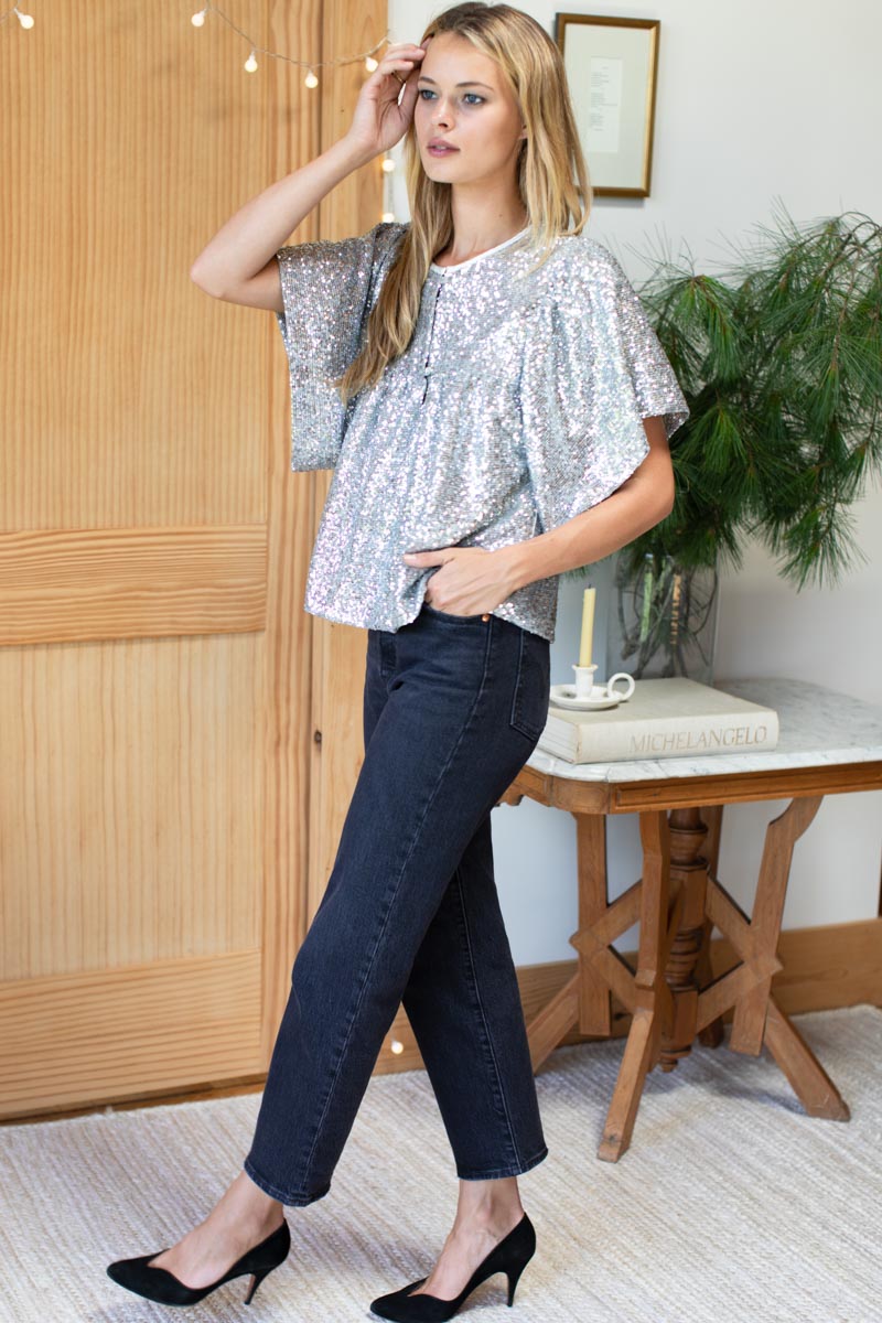 Signature EF Sequin Yoked, shirred neckline with button closure Fluttery butterfly style sleeves LIned Relaxed drape through body Green dry clean Made in NYC XXS: Bust 41", Length 21" XS:...