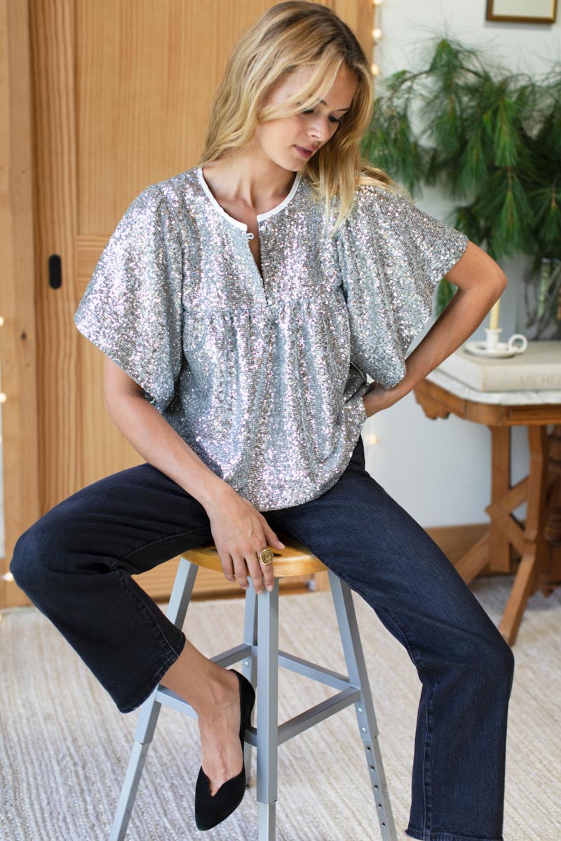 Signature EF sequin with beautiful drape Yoked, shirred neckline with button closure Fluttery sleeves make great shapes Lined Side seam pockets Removable tie Relaxed, easy fit Green Dry Clean Made...