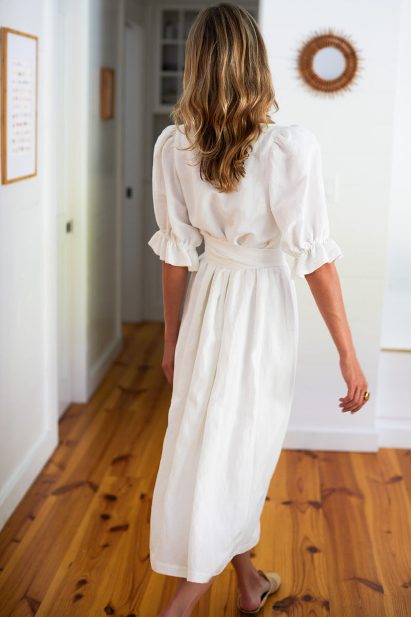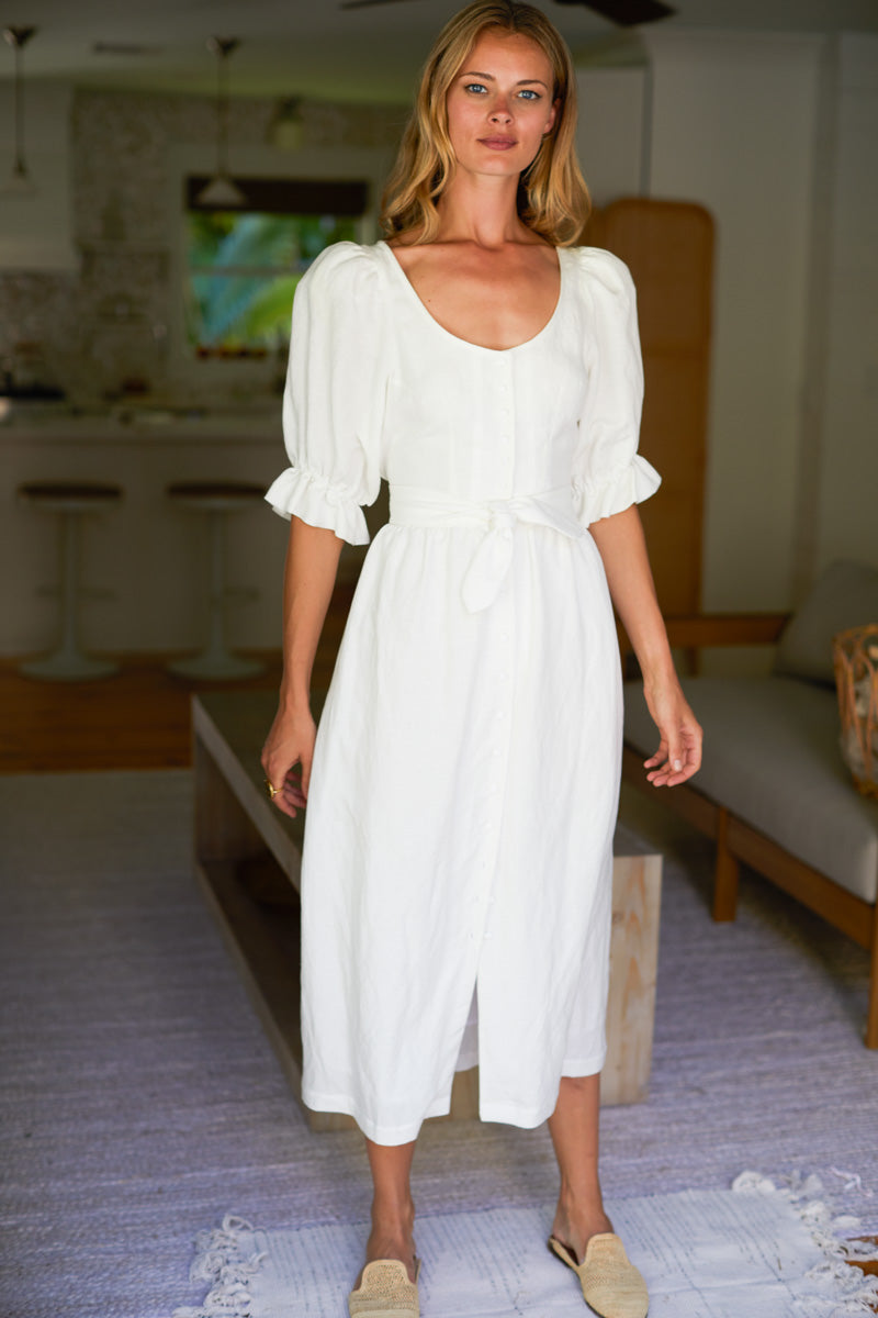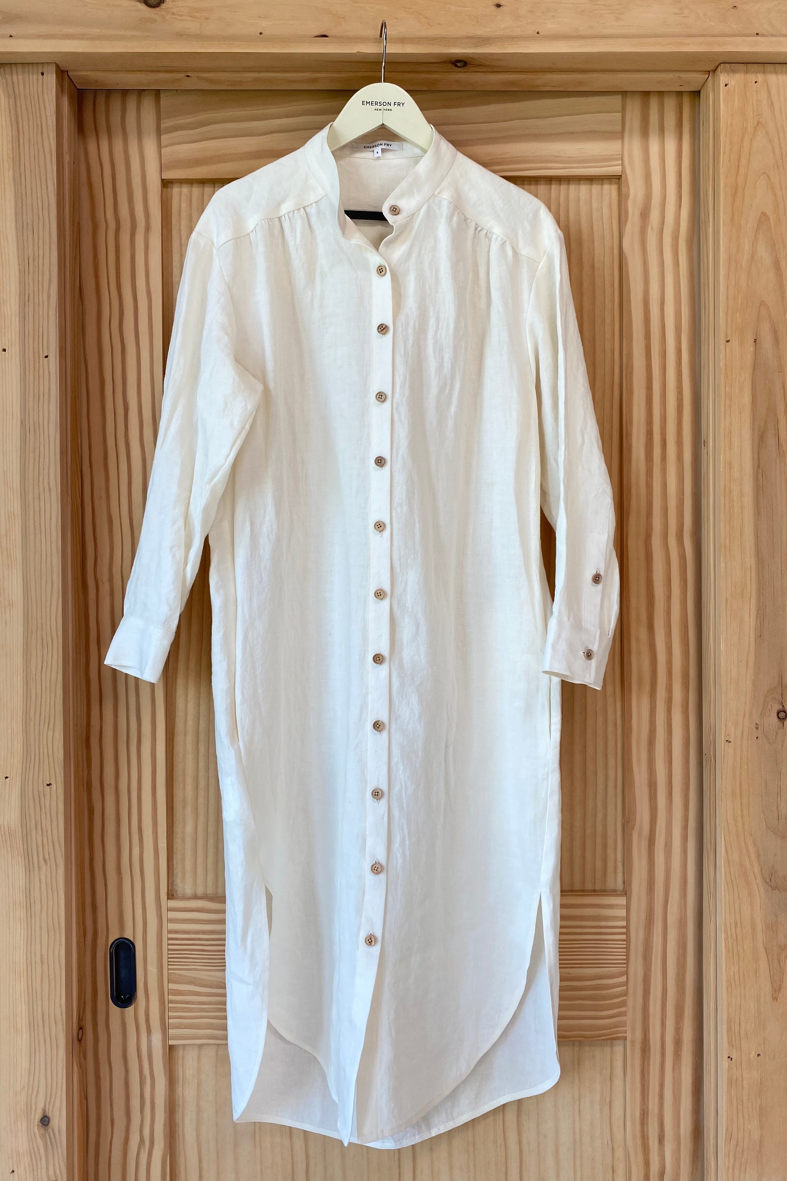 Eco Viscose Button front w/ drawstring waist Button closure at cuff Midi length dress 48" (size small) Inset little puff shoulder Gathers at collar and back yoke Model is wearing...