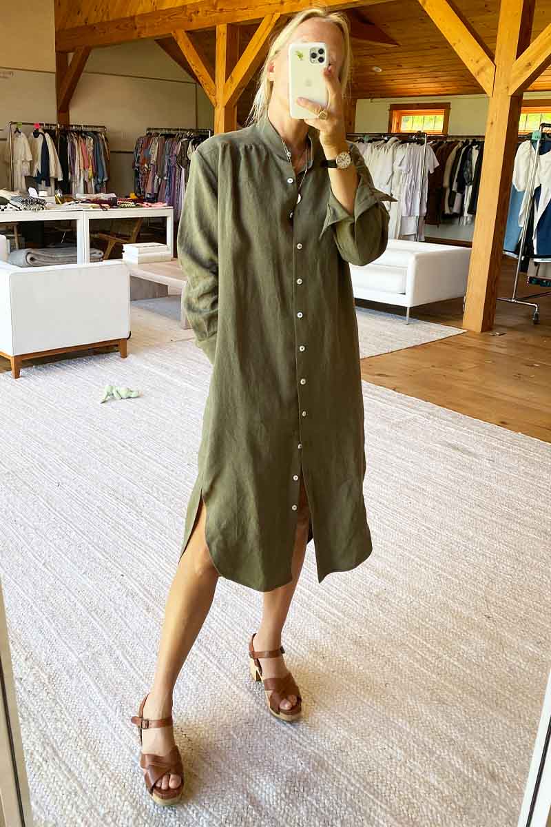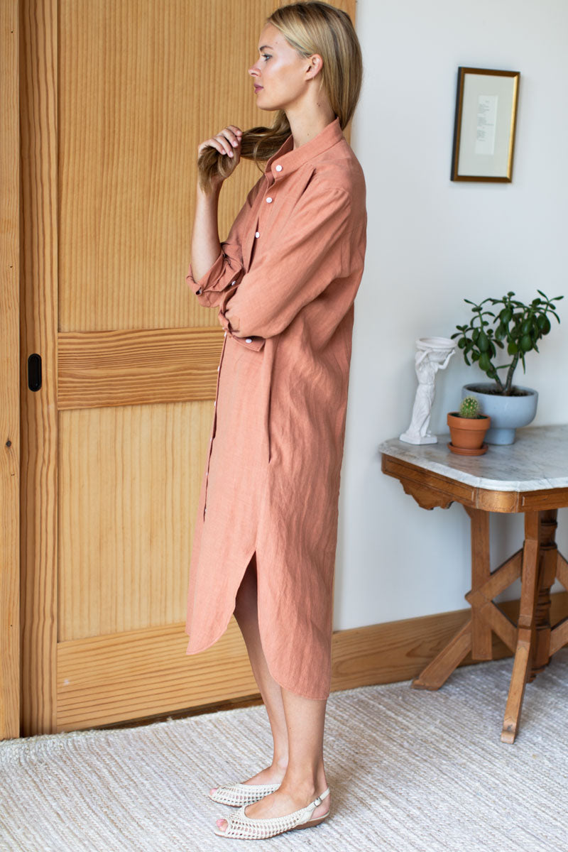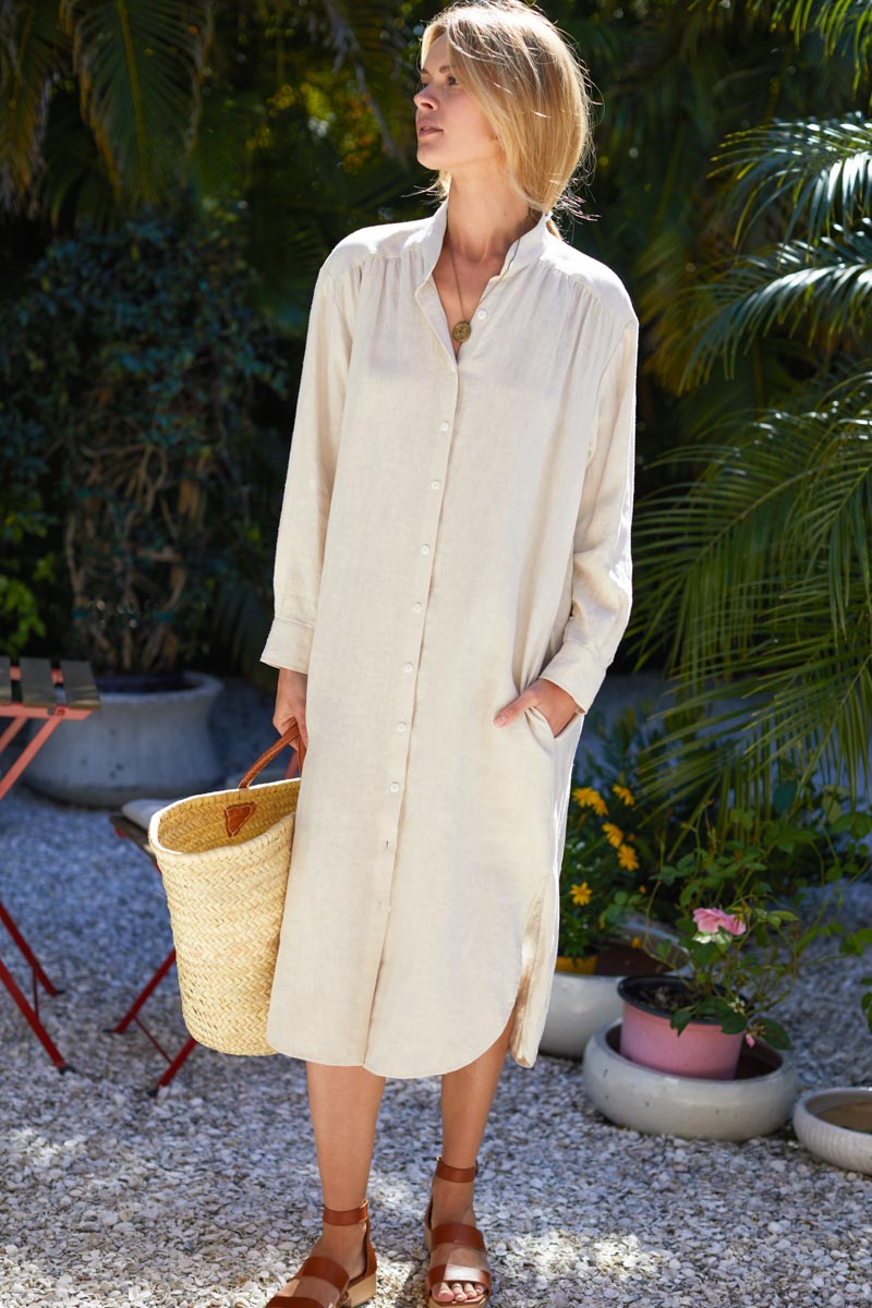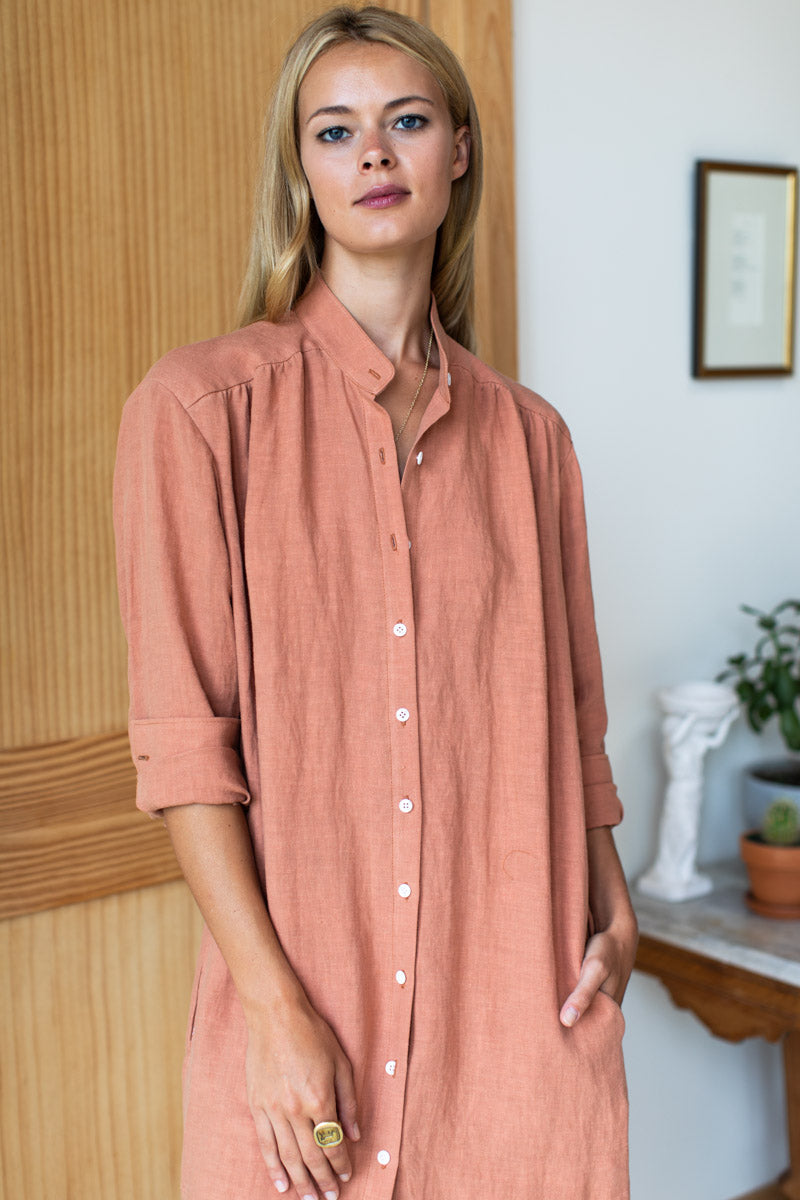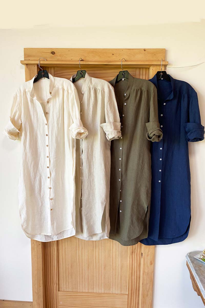Washed medium weight linen Suitable for every Season Button front Yoked shoulder with Shirring Mandarin style collar Full length sleeves with button closure at cuff Hidden side seam pockets Rounded...