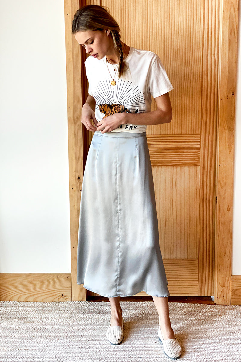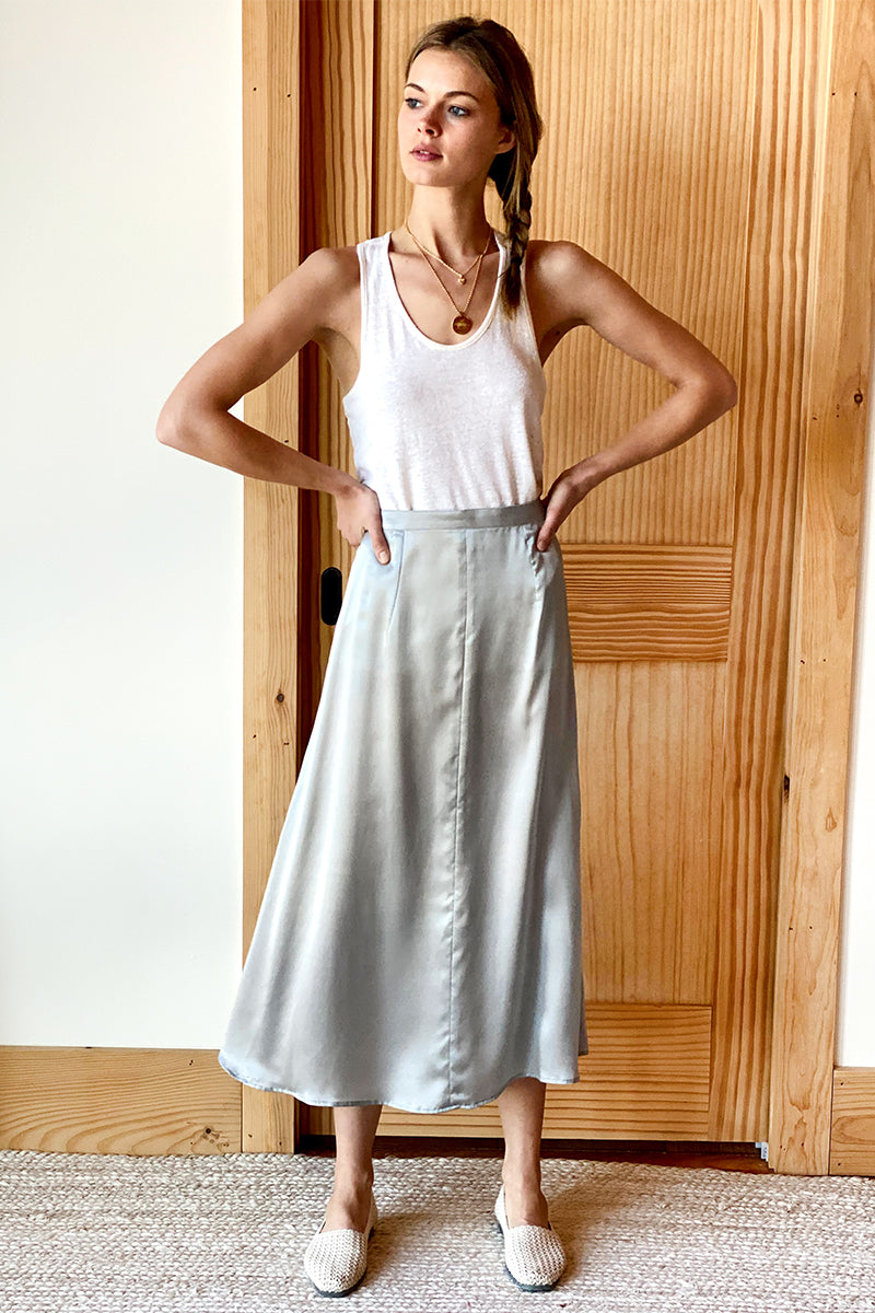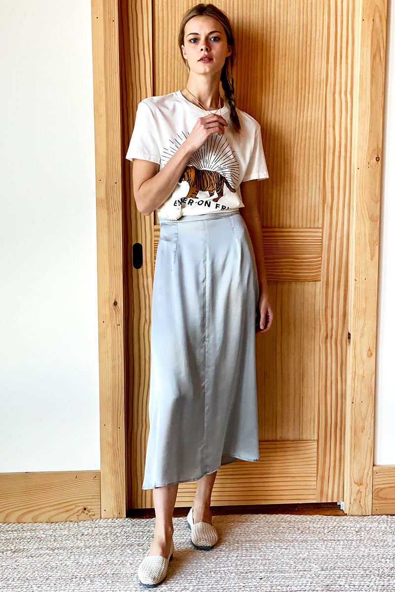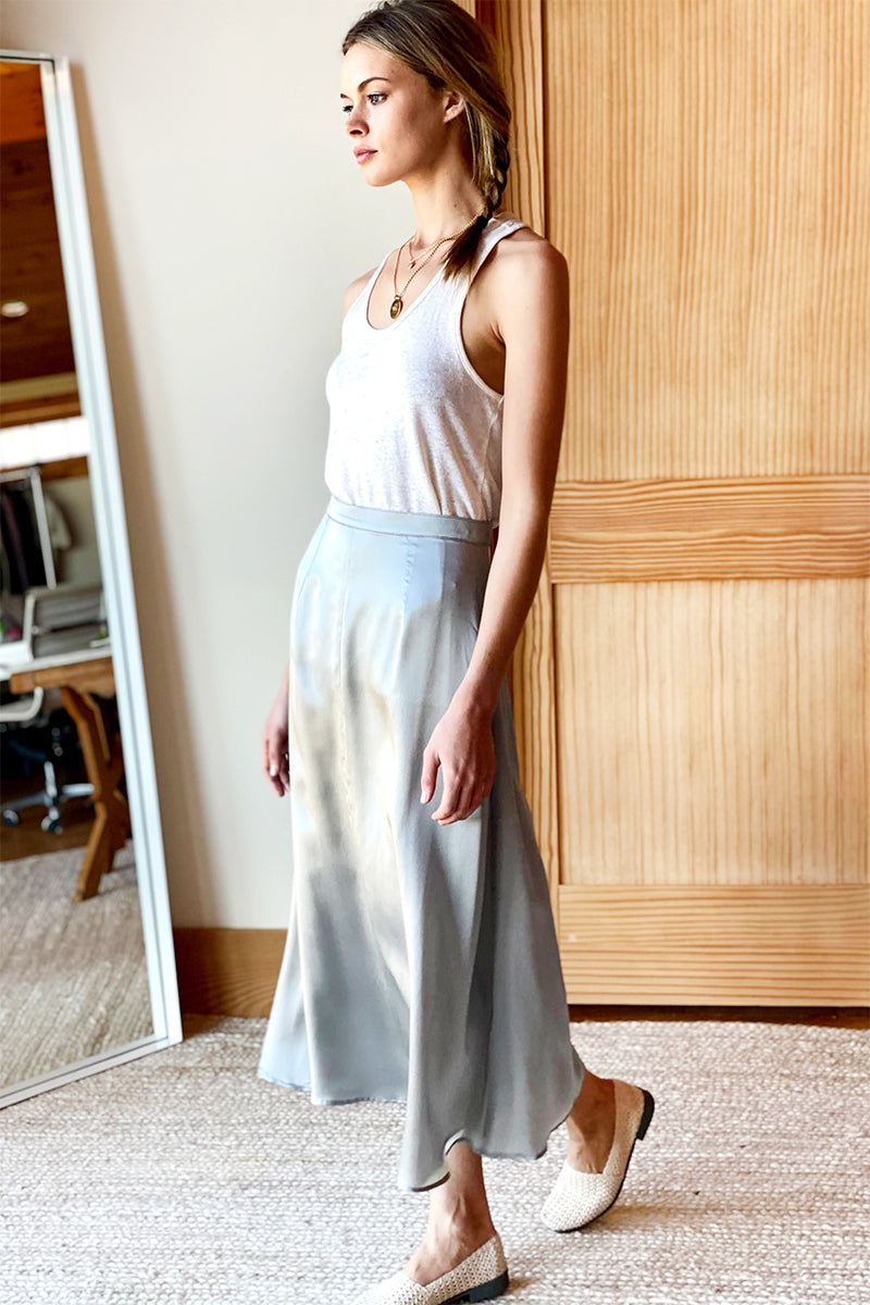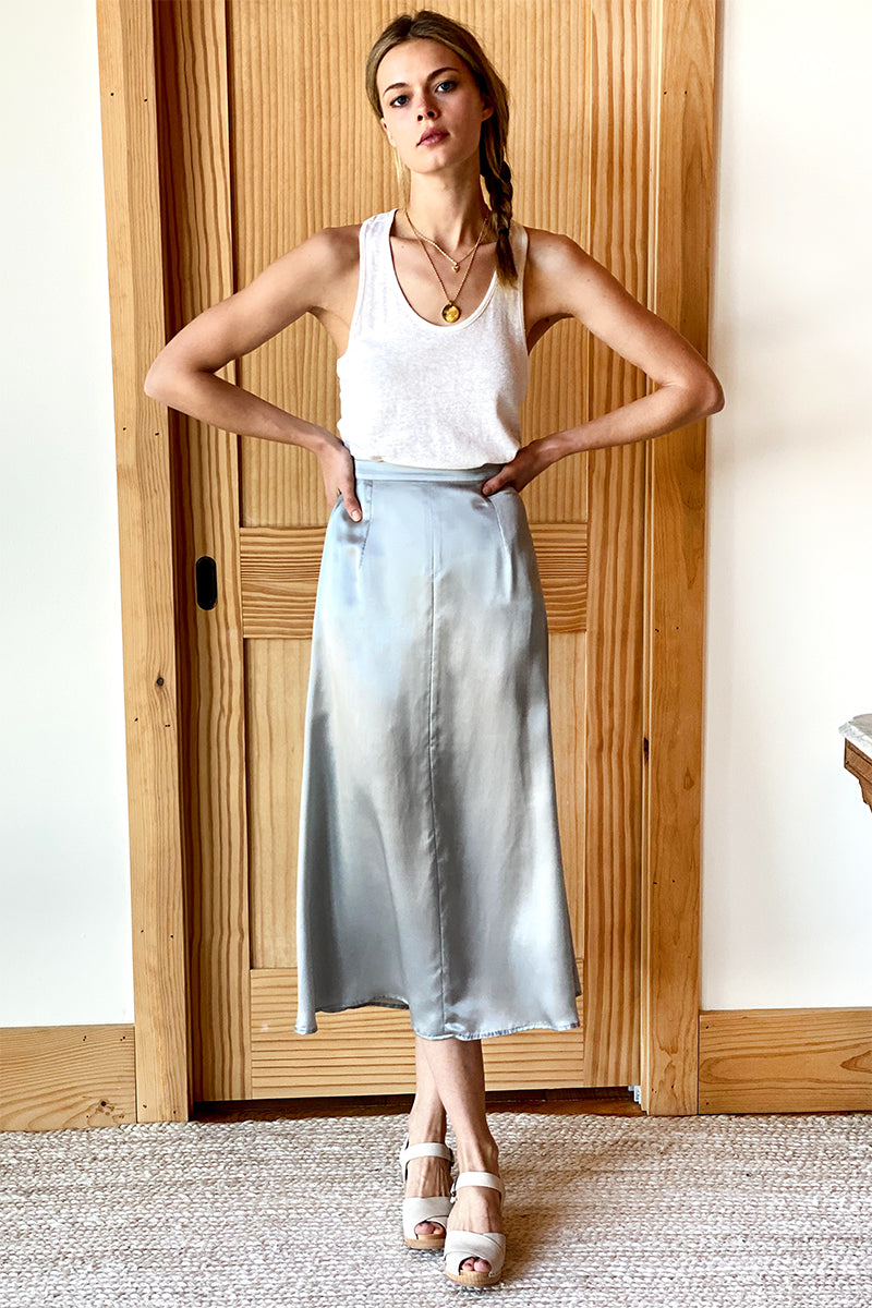 Updated fit. Elastic bands at side waist for easy fit 100% Silk Back zipper Hidden elastic bands at side waist for easy fit Model is wearing a size small Dry...