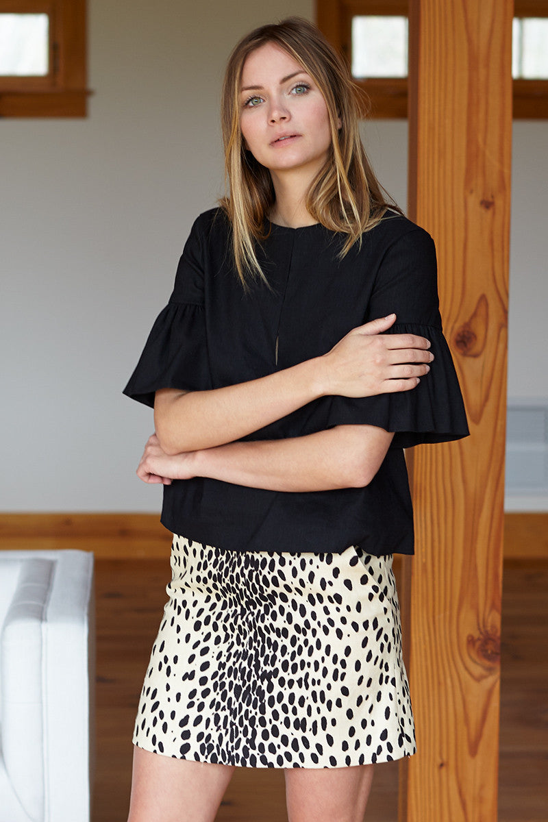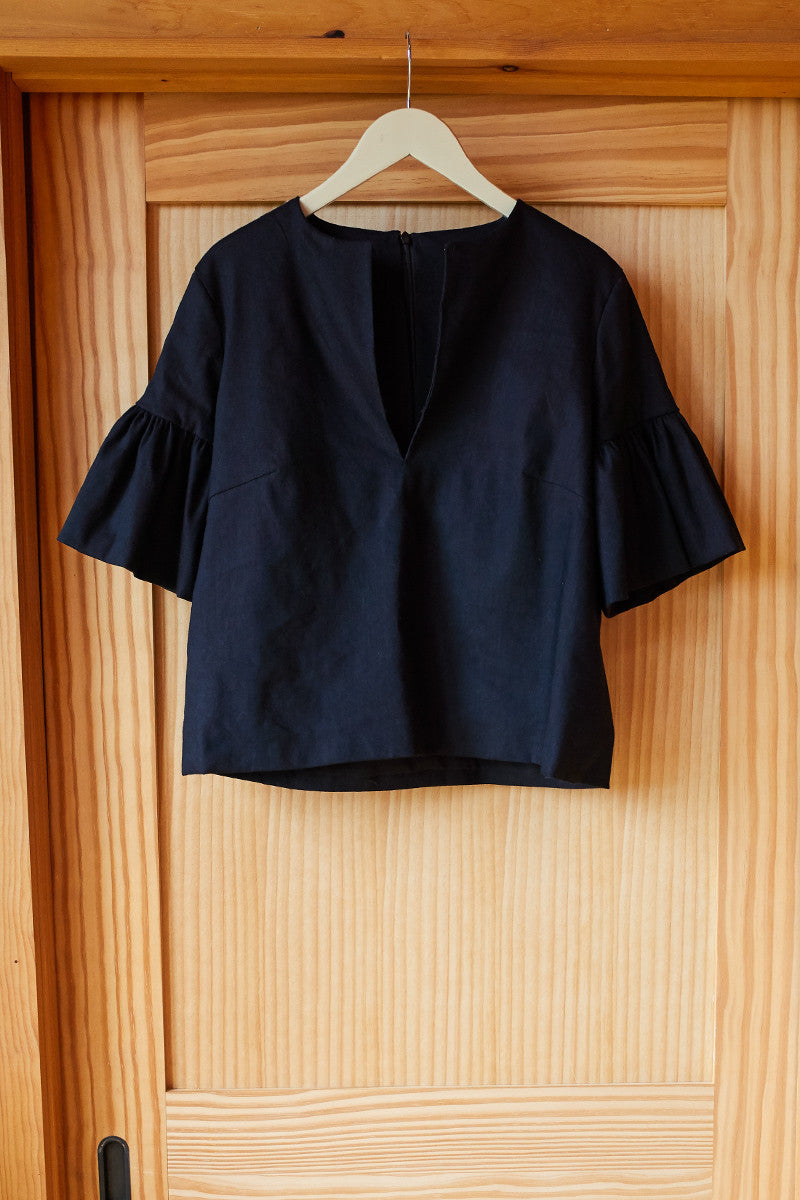 Wear to work, wear with jeans, a top defined by what you pair it with, adaptable, fun, unique, super comfortable. A t-shirt alternative. A 60s inspired shape with ruffled bell...