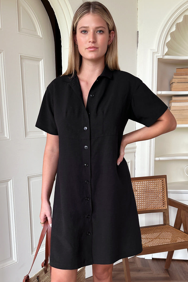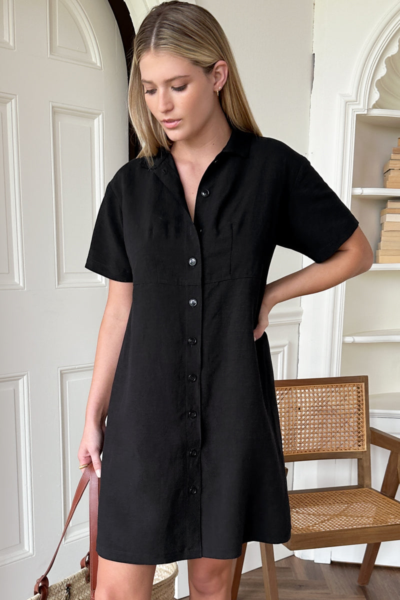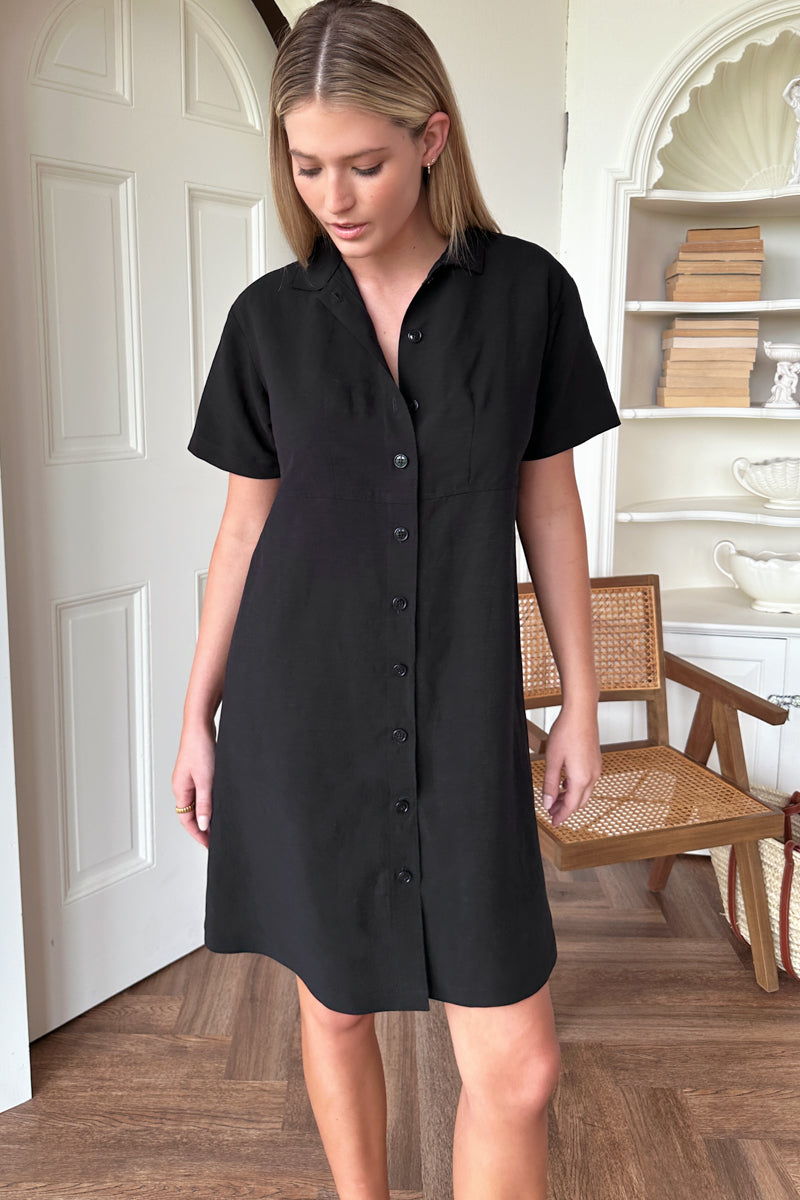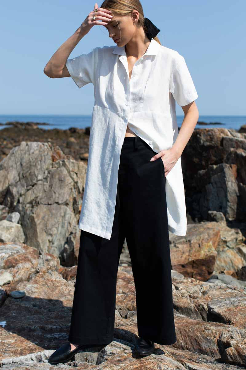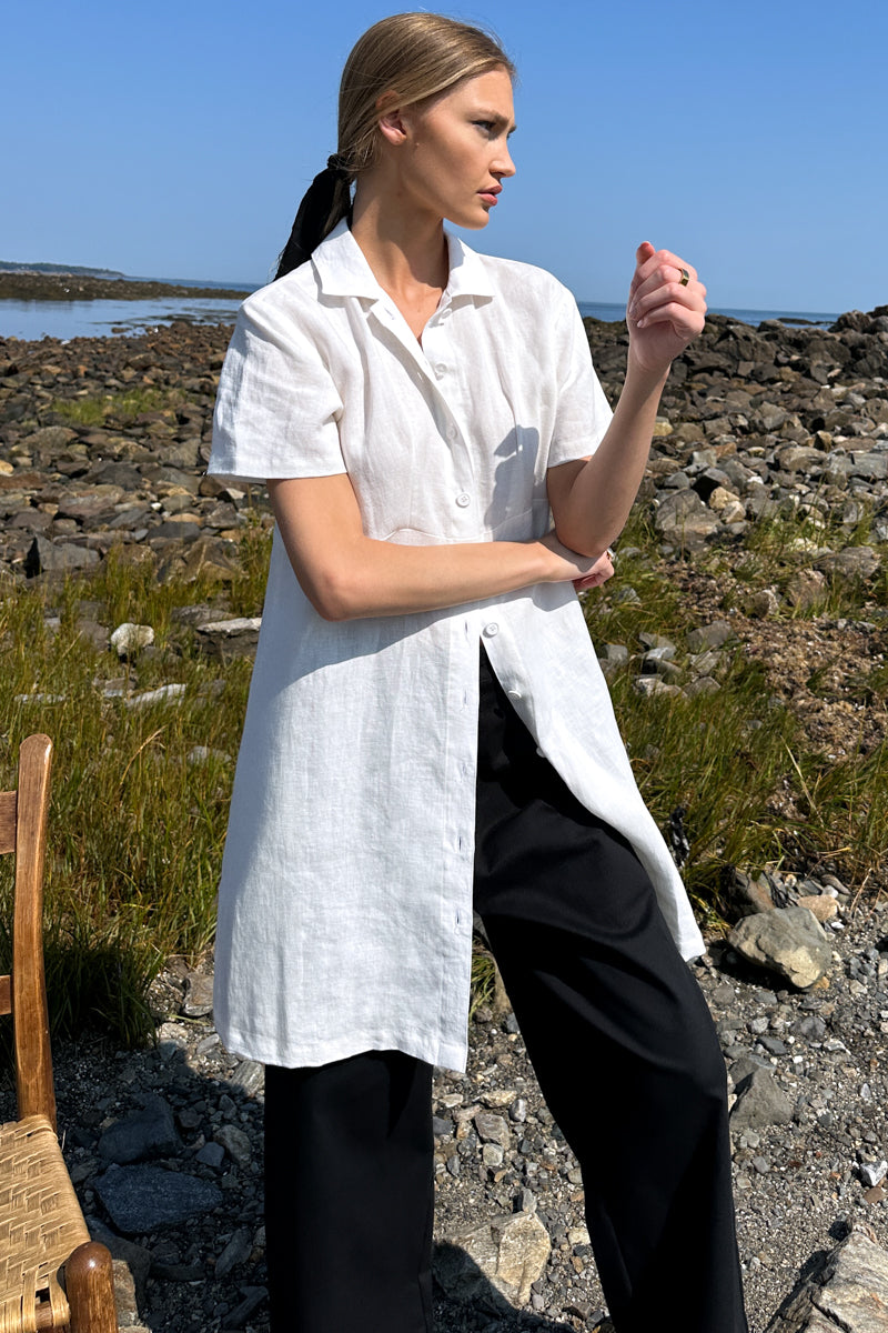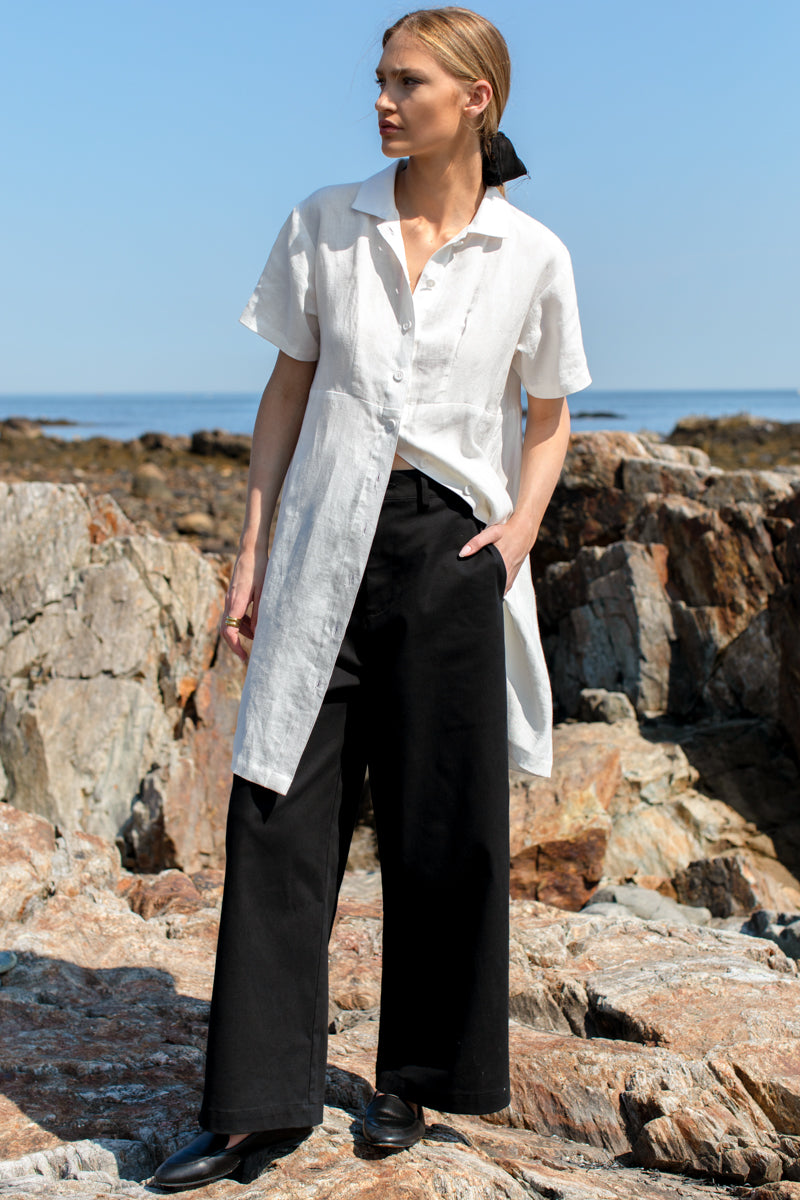 Linen Viscose Classic shirt collar Button closures at front Seamed waistline w/ darts for slight shaping Side seam ties Straight hem Made in NYC XXS: Bust 40", Sweep 53 3/4",...
