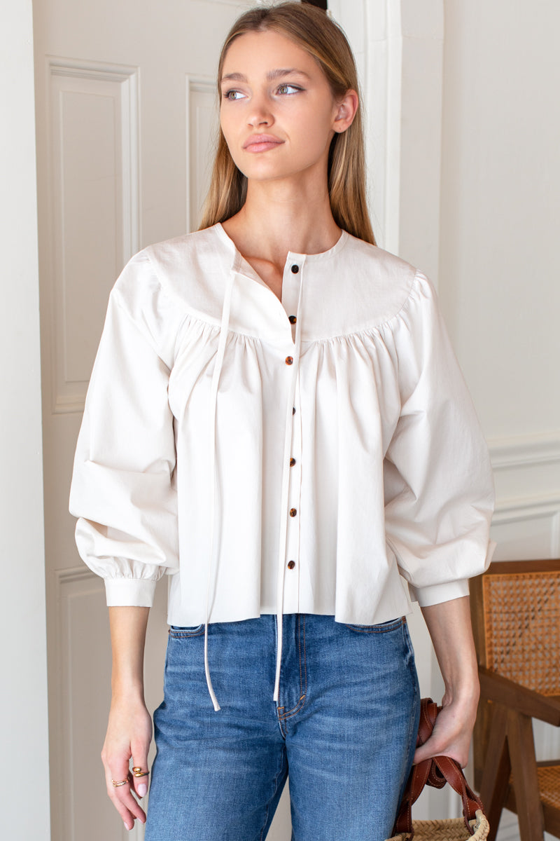 100% Organic Cotton with linen feel Yoked neckline with double ties Gathered little puff shoulder Elastic at cuff Lined Relaxed fit through body Hand wash cold, gentle + line dry...