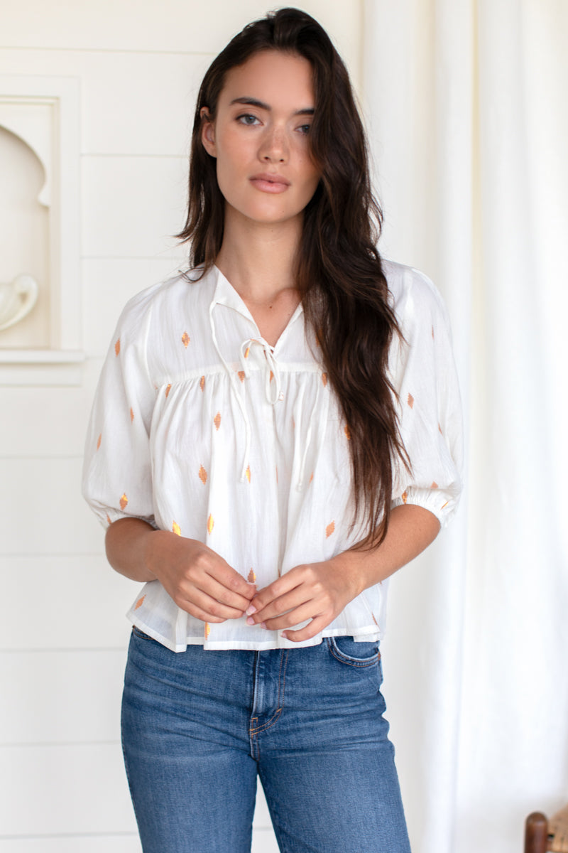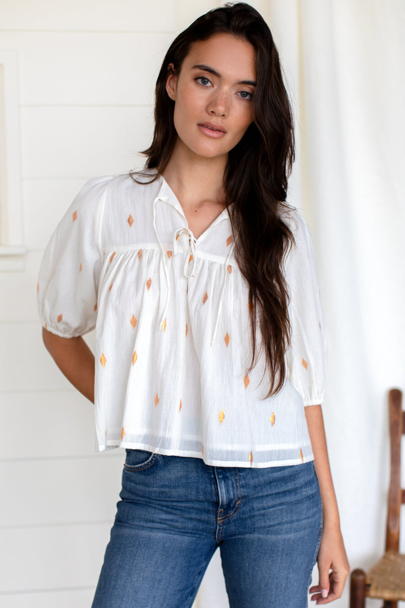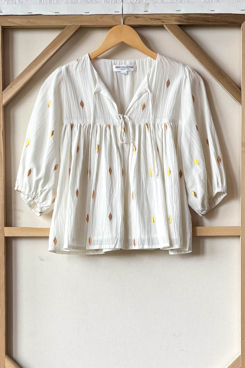 Cotton with gold lurex Yoked neckline with double ties Gathered little puff shoulder Elastic at cuff Lined Relaxed fit through body Hand wash cold, gentle + line dry Made in...