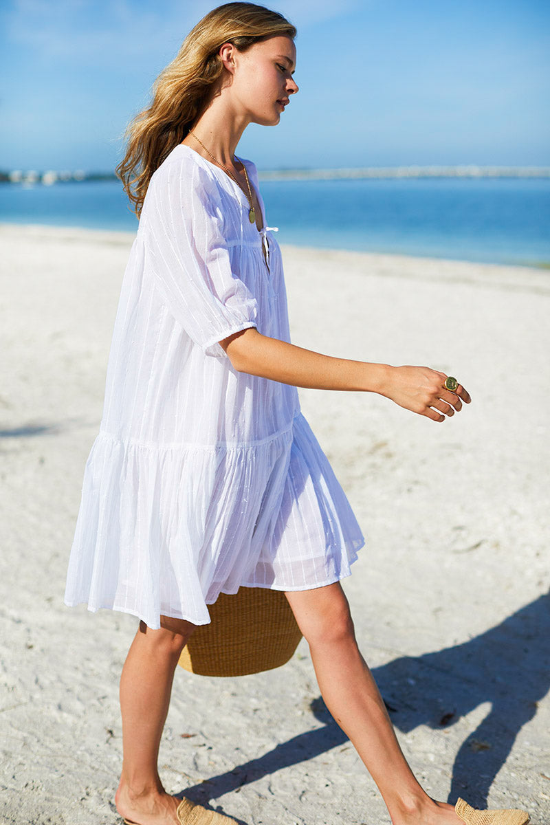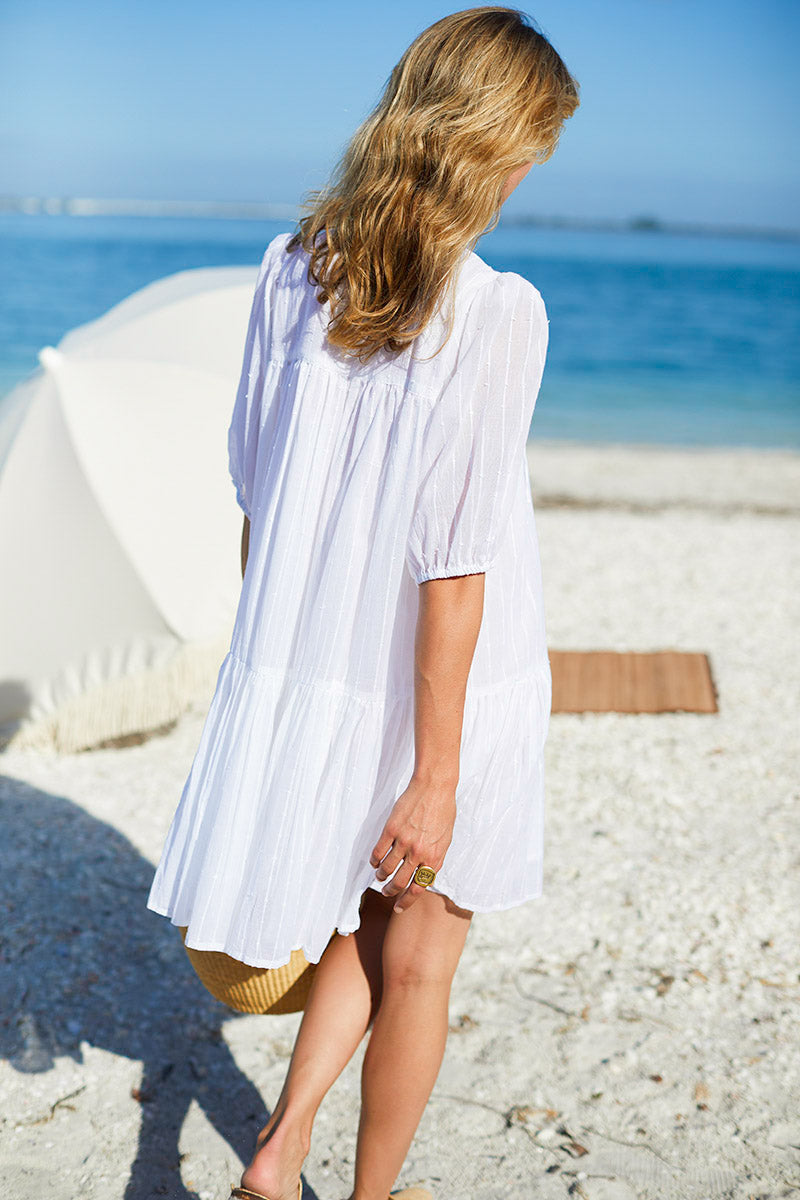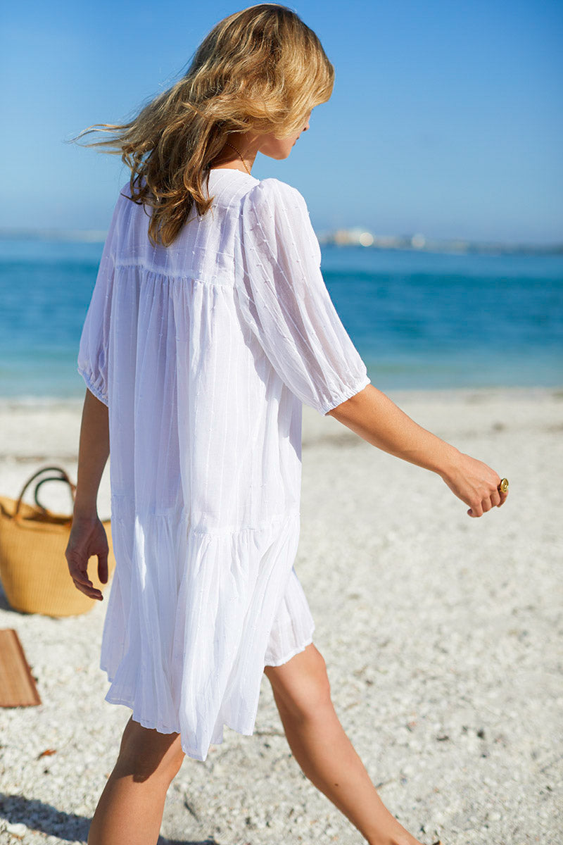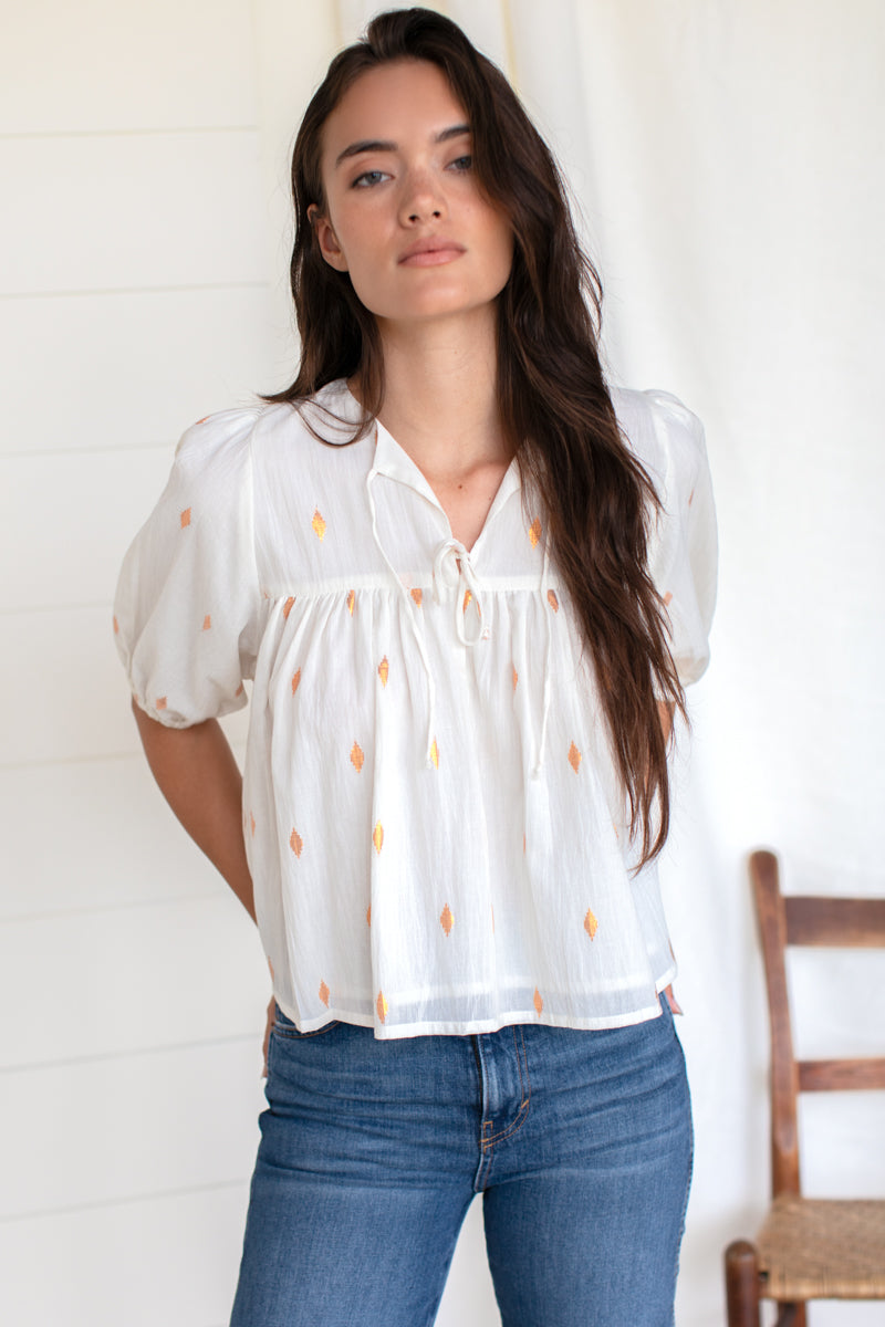 Cotton with gold lurex Yoked neckline with double ties Gathered little puff shoulder Elastic at cuff Lined Relaxed fit through body Hand wash cold, gentle + line dry Made in...