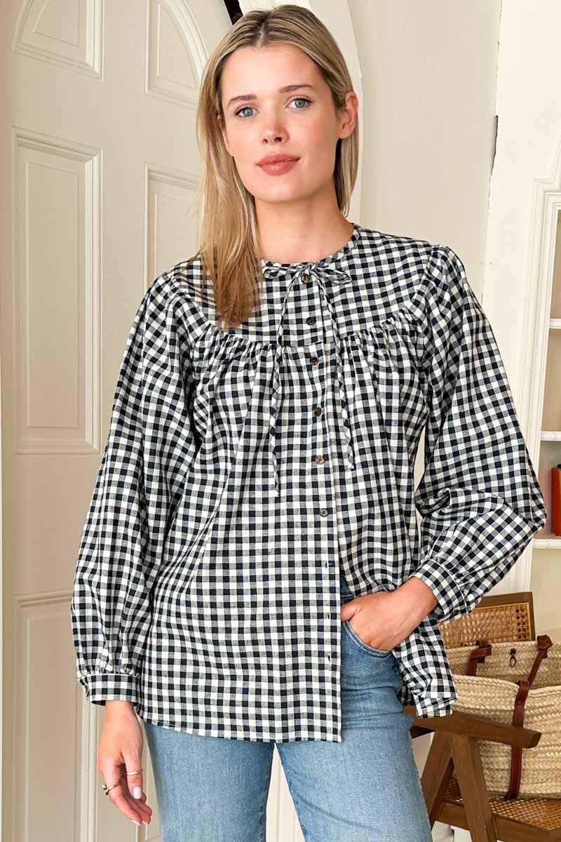 Cotton Decorative jacquard woven detailing Yoked neckline with double ties Gathered little puff shoulder Elastic at cuff Lined Relaxed fit through body Hand wash cold, gentle + line dry Made...