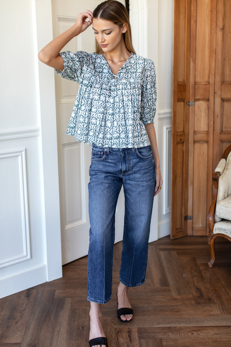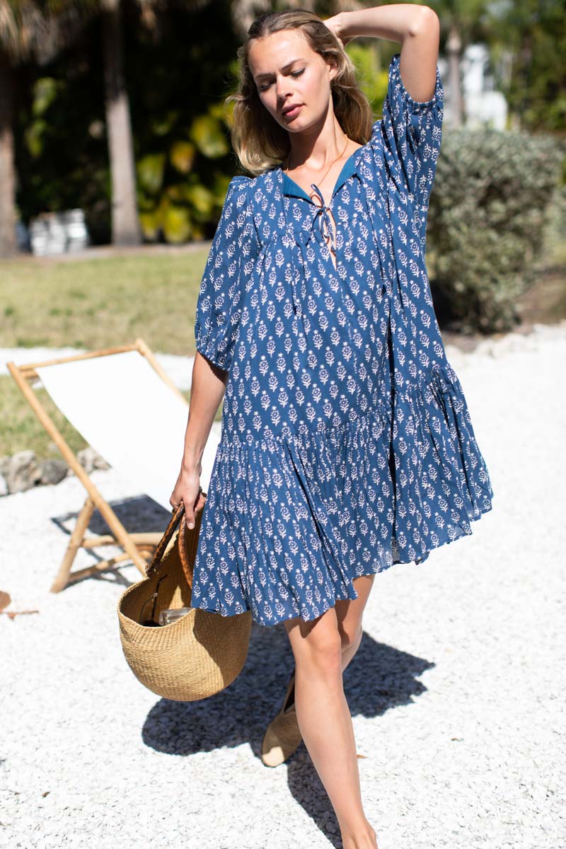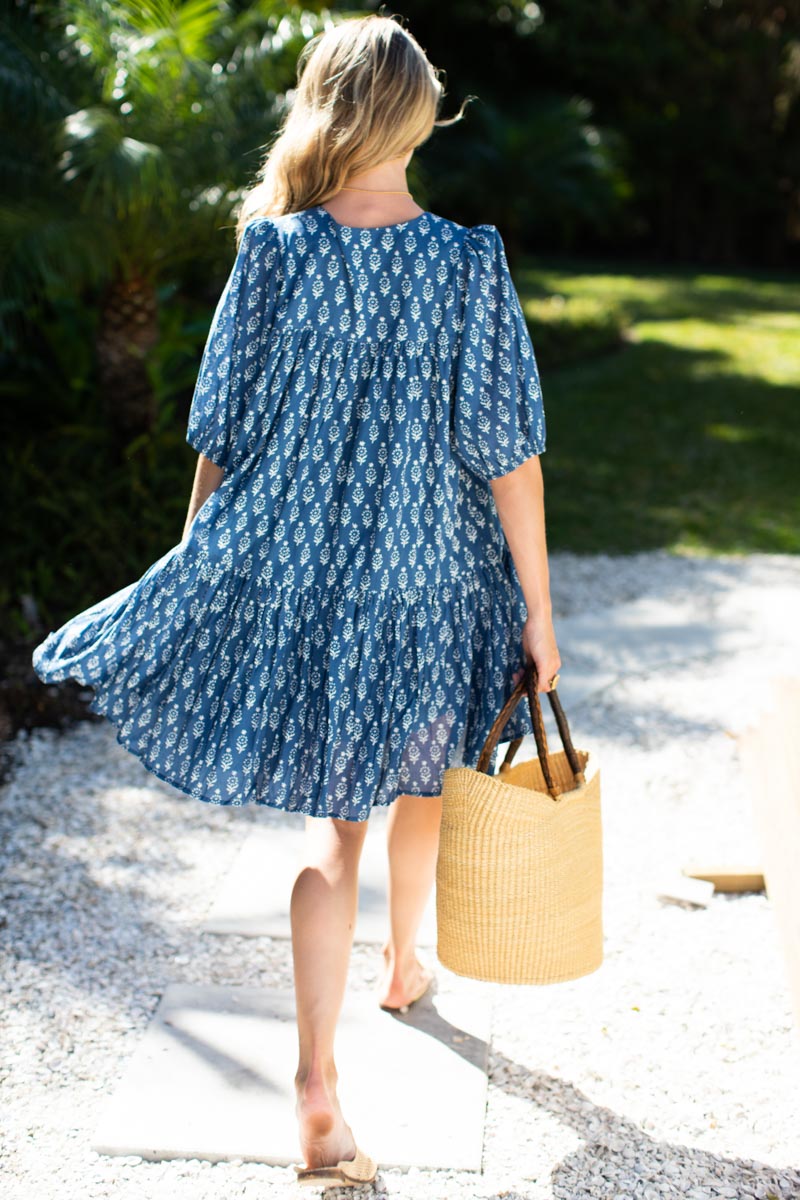 Made with 100% Organic Cotton Hand block printed Hand dyed using low impact dye Little puff shoulder Elastic cuff Yoked neckline with tie closure Easy, breezy fit though body Wide...