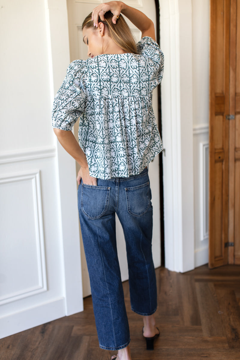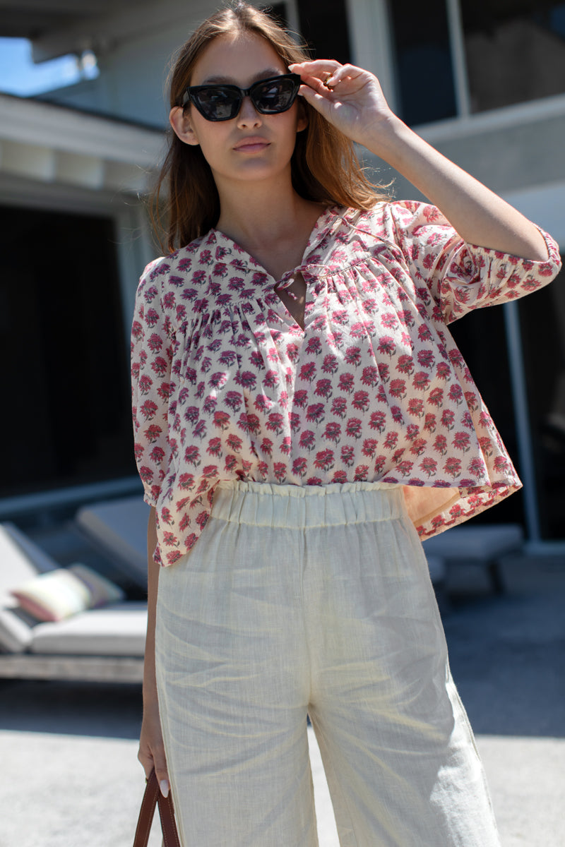 Linen Viscose Hand Block printed using low impact dye Yoked neckline with double ties Gathered little puff shoulder Elastic at cuff Lined Relaxed fit through body Made in Rajasthan, India...