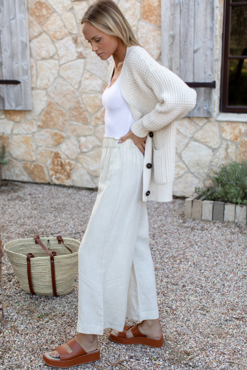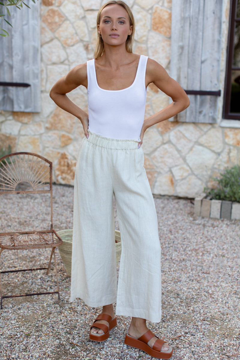 Washed Linen Elastic waist Wide leg Cropped fit Hand wash, line dry Made in Rajasthan, India XS:Waist 24", Hip 39", Length 37.5" S: Waist 26",Hip 41",Length 38" M:...