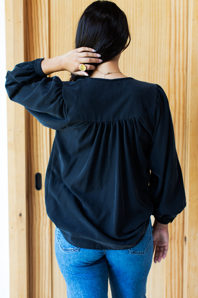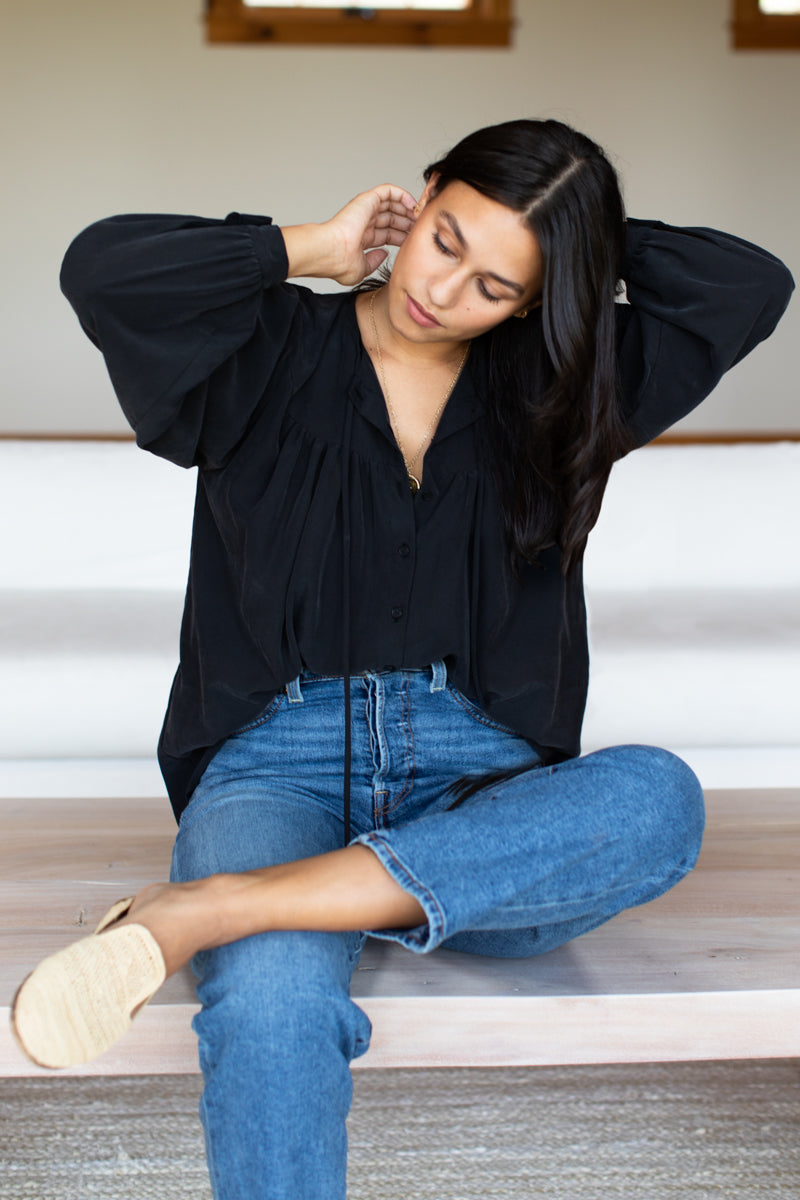 100% Organic Cotton Low impact dye Yoked neckline with double ties Gathered little puff shoulder Elastic at cuff Lined Relaxed fit through body Polar night is a washed black tone...