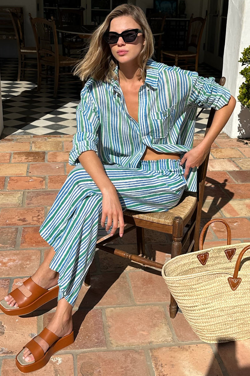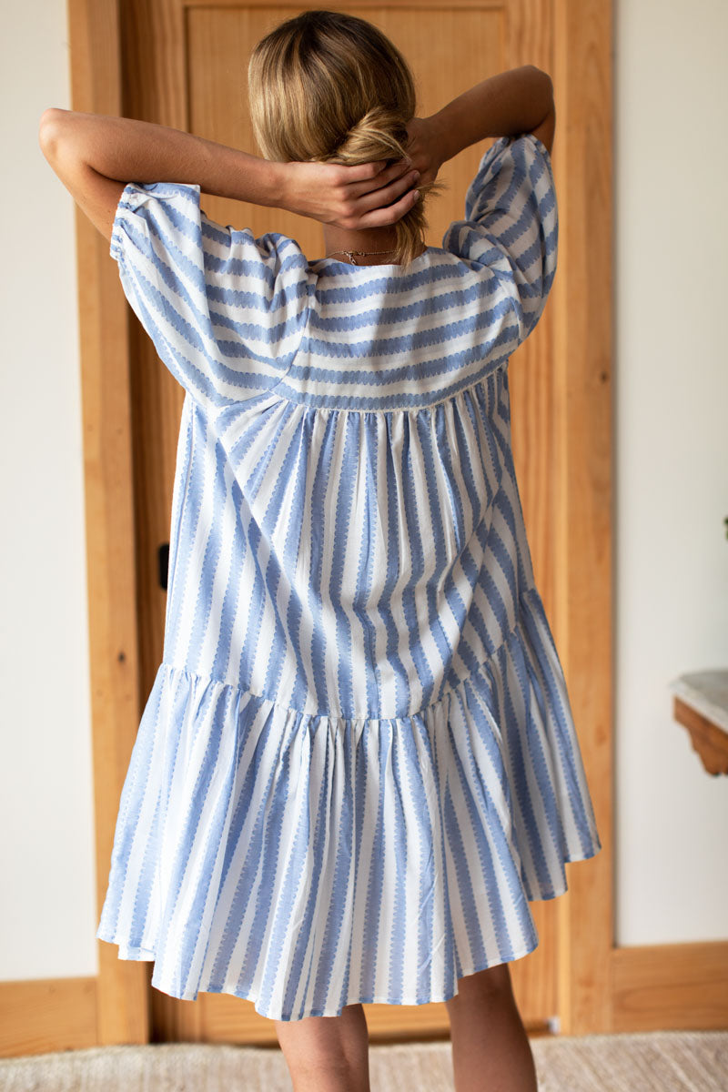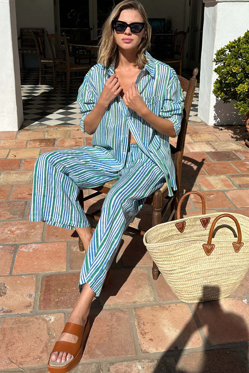 Cotton stripe Hand dyed using low impact dye Little puff shoulder Elastic cuff Yoked neckline with tie closure Easy, breezy fit though body Wide ruffled hem Lined Made in Rajastan,...