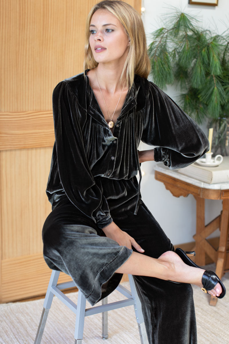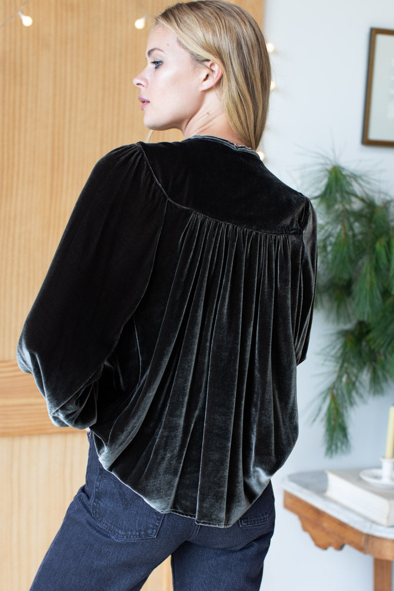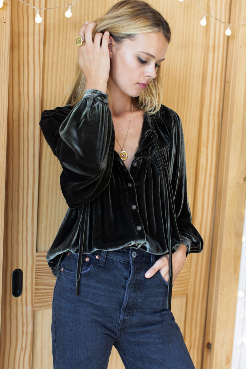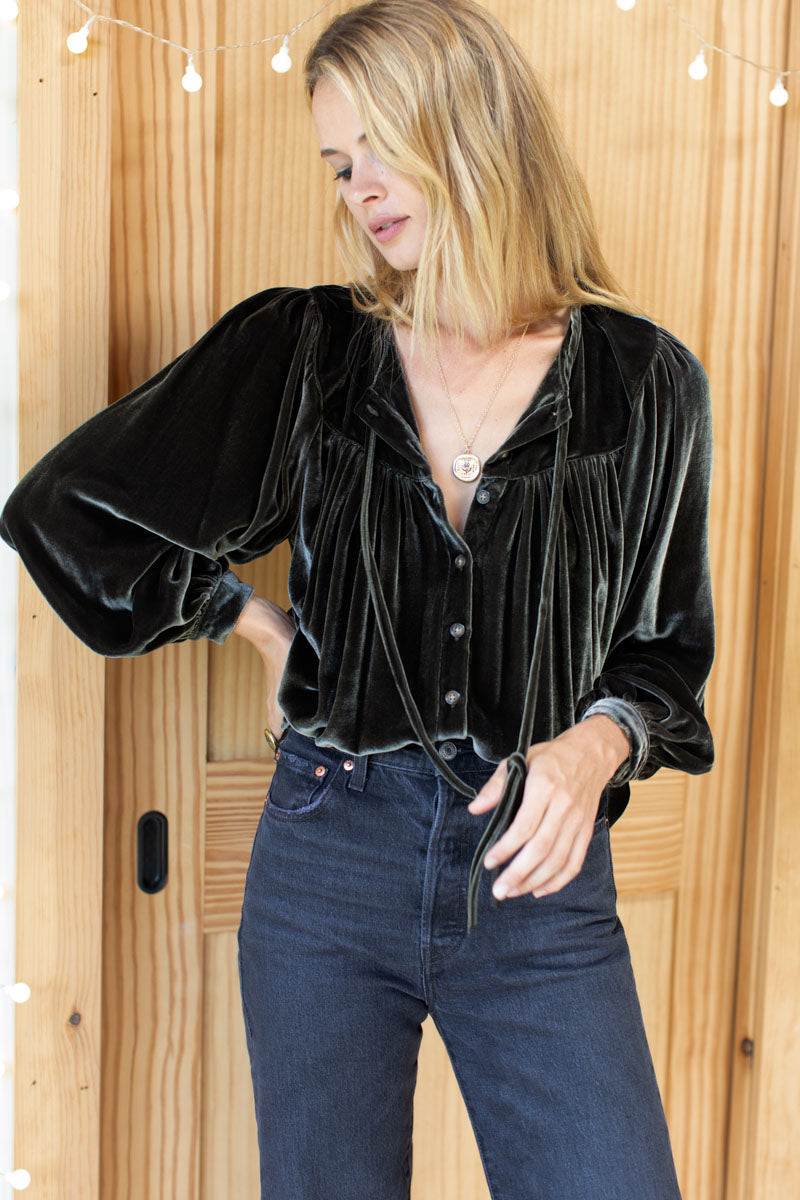 Silk Velvet blend Easy breezy fit Button Front w/ tie closure at neckline Yoke detail with shirred body Blouson sleeves with button cuff Model is wearing a size small Green...