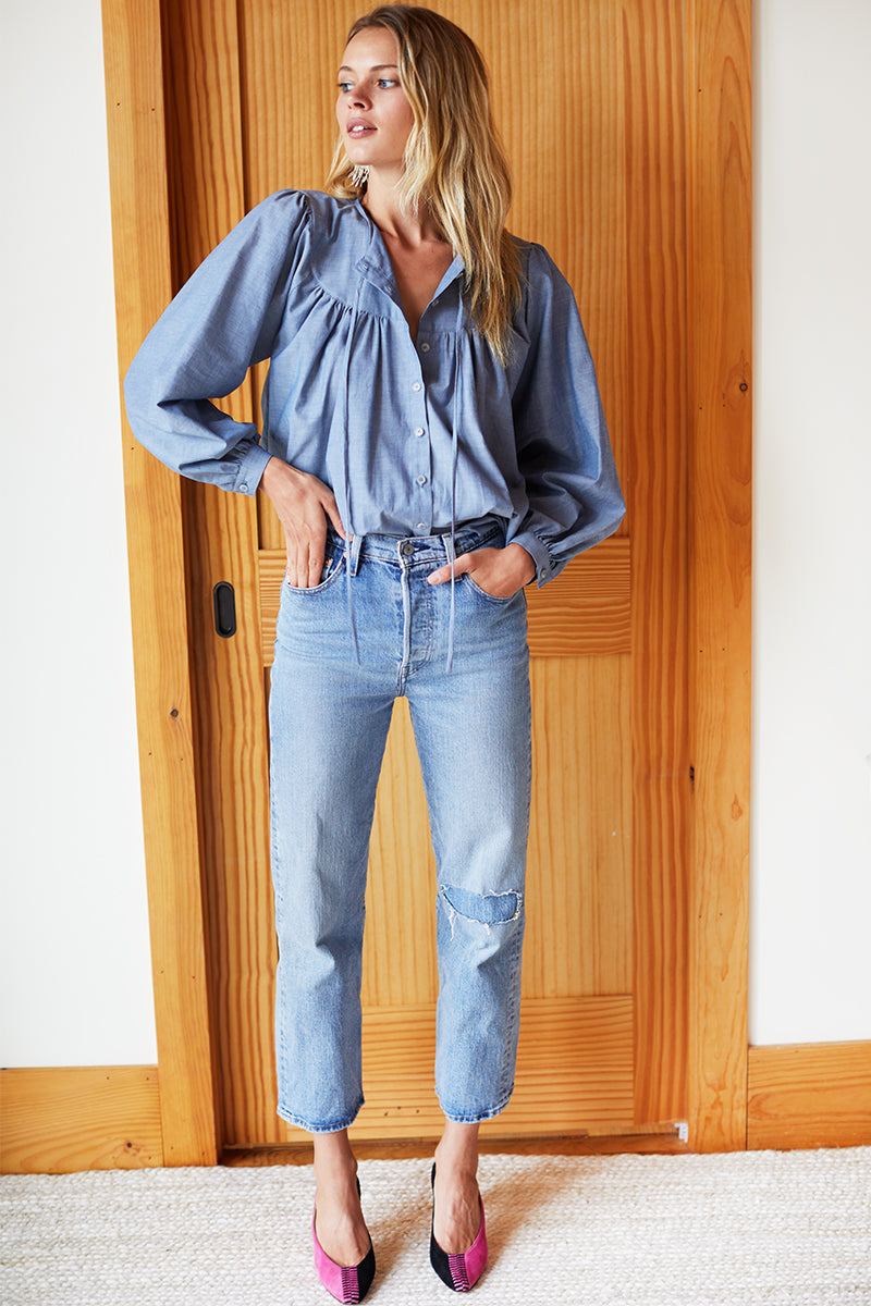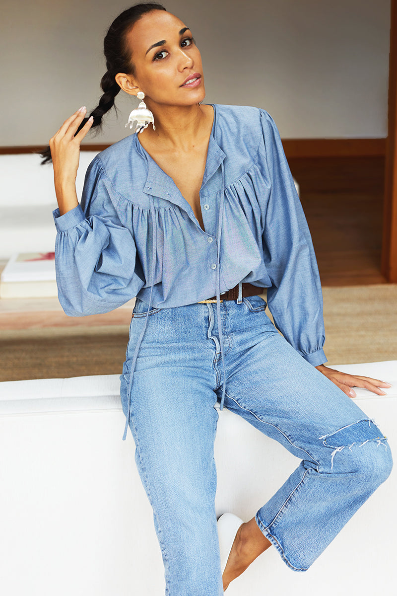 Cotton chambray Easy breezy fit Button Front w/ tie closure at neckline Yoke detail with shirred body Blouson sleeves with button cuff Model is wearing a size small Hand wash...