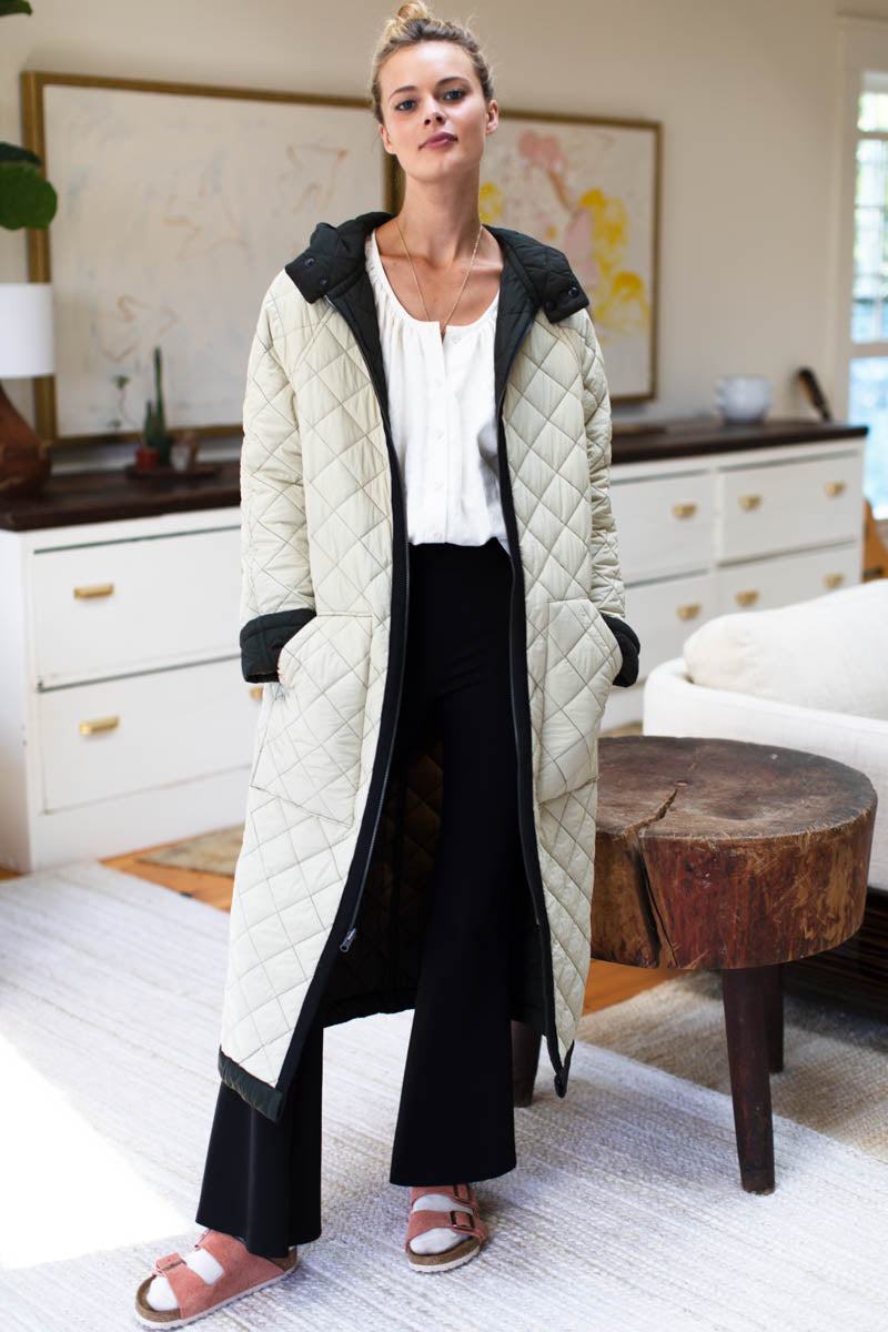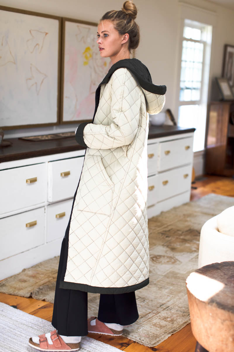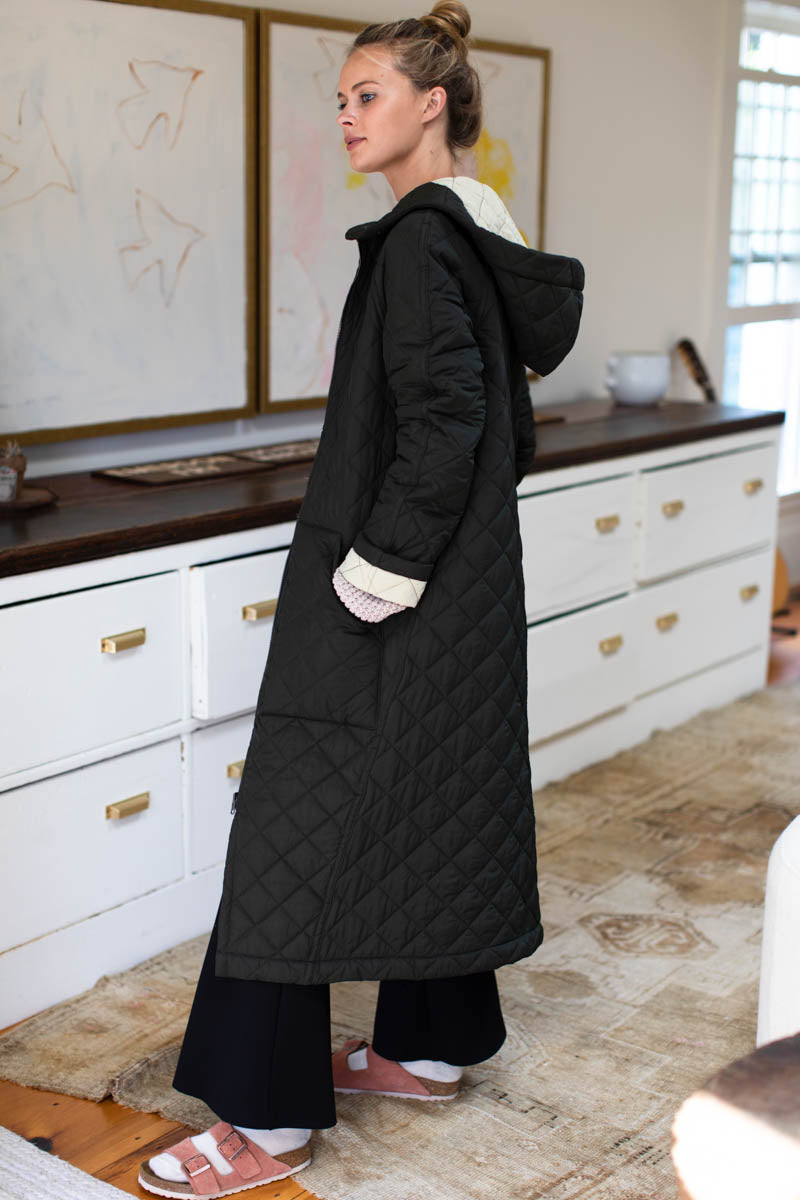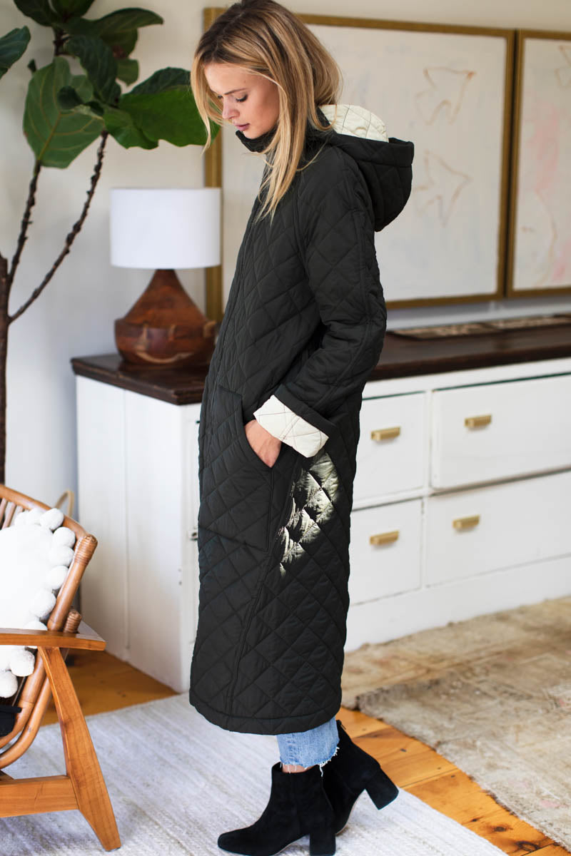 Reversible long line hooded Midi coat is a cozy closet staple - Perfect for easy styling and comfort. Fully Reversible in black or parchment Classic diamond pattern puffer coat with...