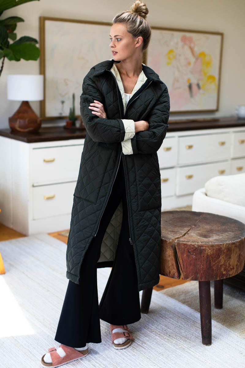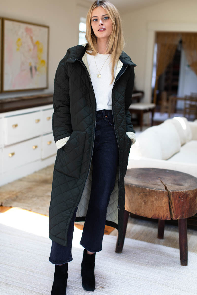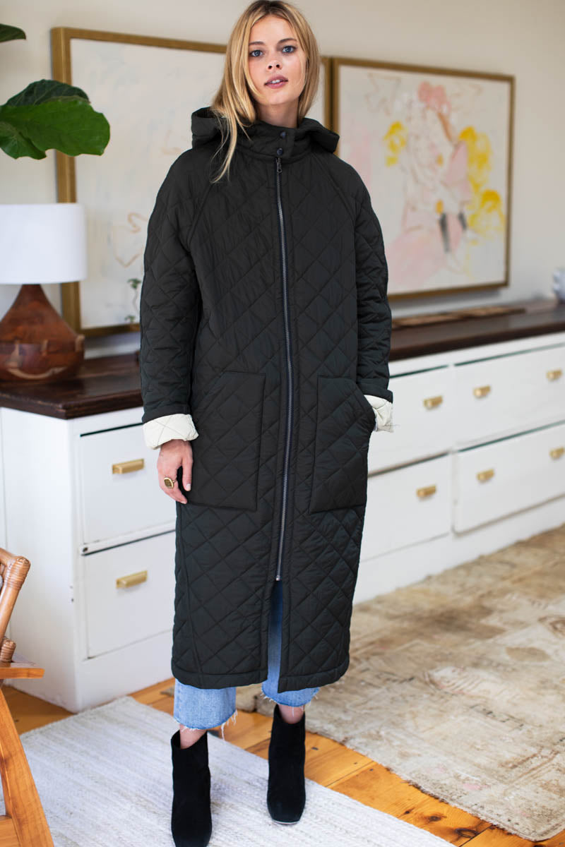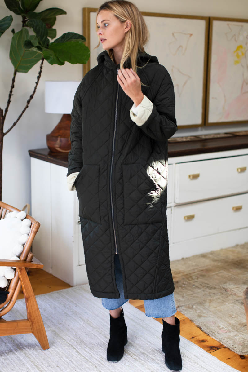 Reversible long line hooded Midi coat is a cozy closet staple - Perfect for easy styling and comfort. Fully Reversible in black or parchment Classic diamond pattern puffer coat with...