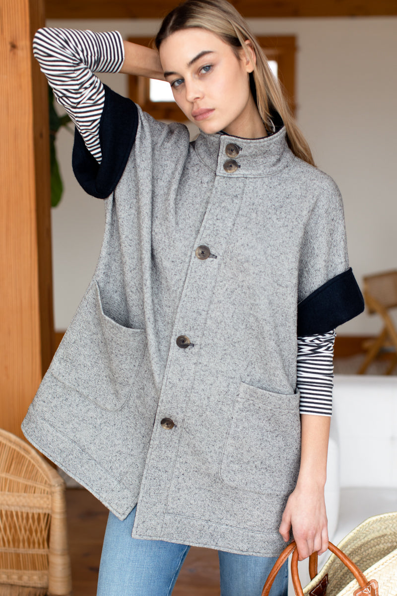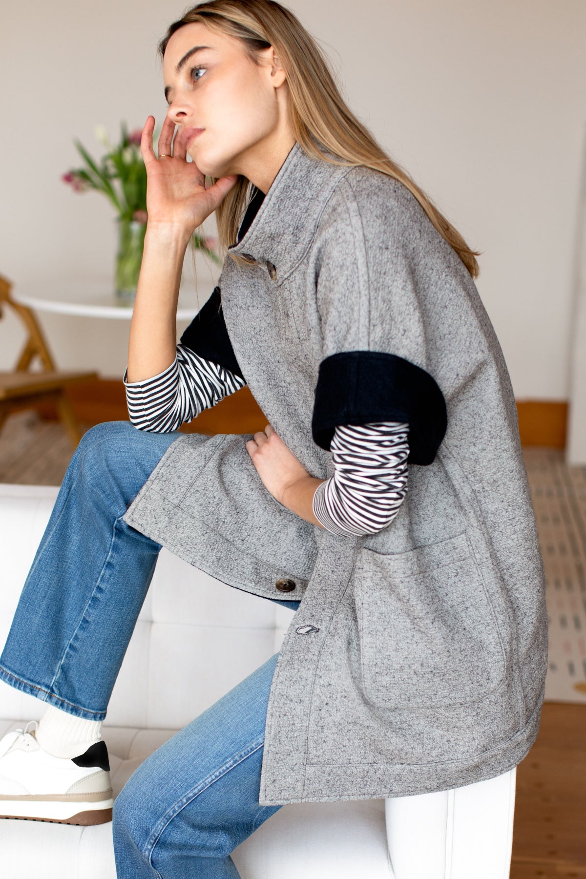 Fully reversible Wool Cashmere Button closures on front Large Patch Pockets Topstitch detail High collar Oversized fit Sleeves can be styled rolled or unrolled Made in NYC XXS: Bust 45"...