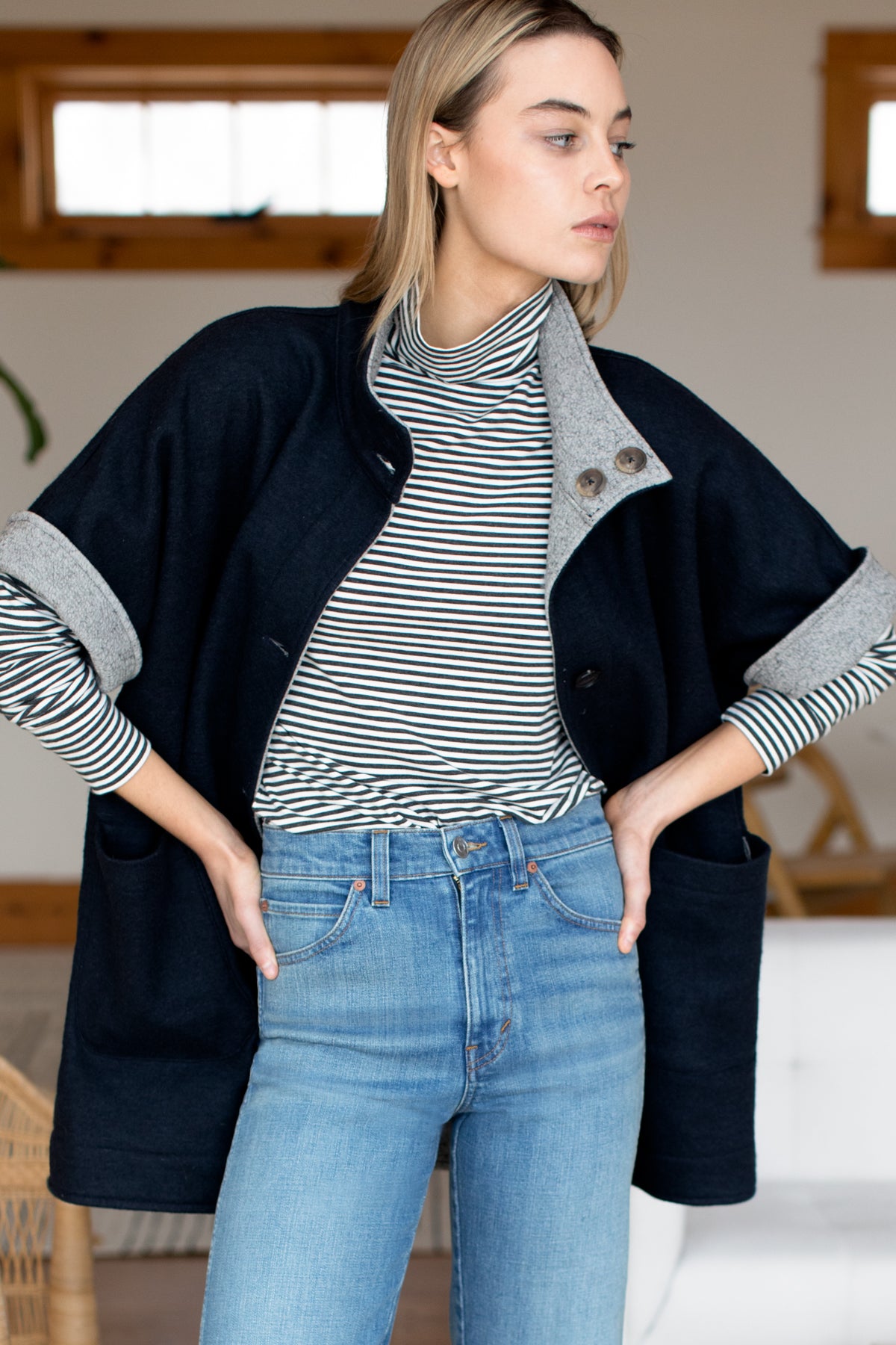 Fully reversible Cotton/wool Button closures on front Large Patch Pockets Topstitch detail High collar Oversized fit Sleeves can be styled rolled or unrolled Model is wearing a size small Made...