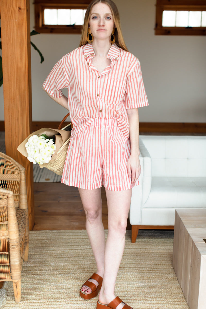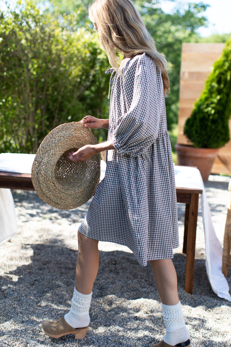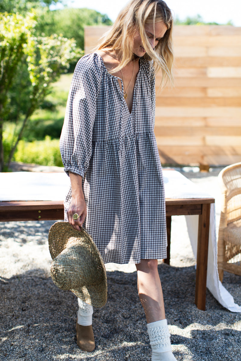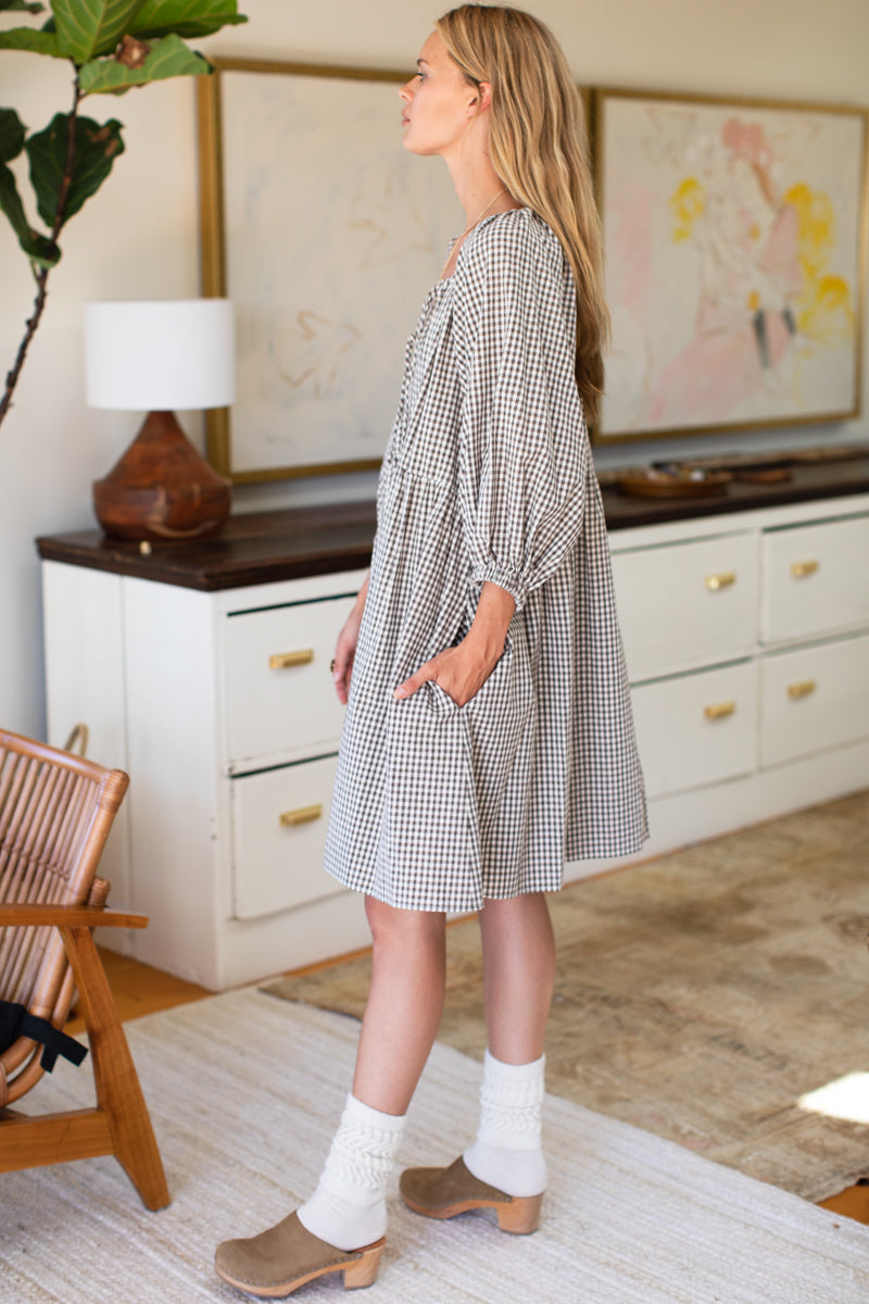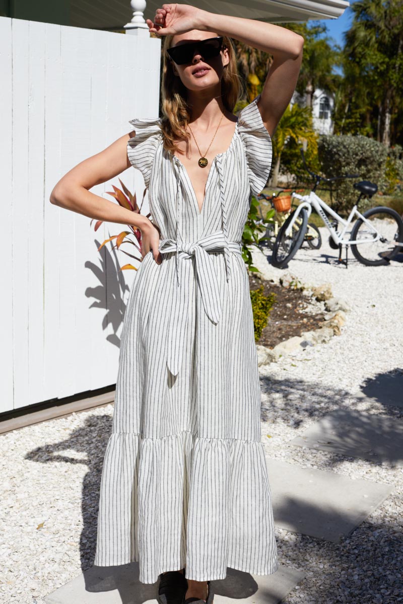 Linen with charcoal stripe Shirred, bound keyhole neckline with tie closure Flutter ruffle at shoulder Shirred bodice with two tier gathered skirt 2" wide removable sash Lined Side seam pockets...