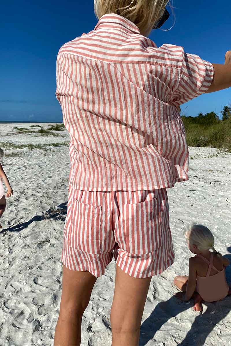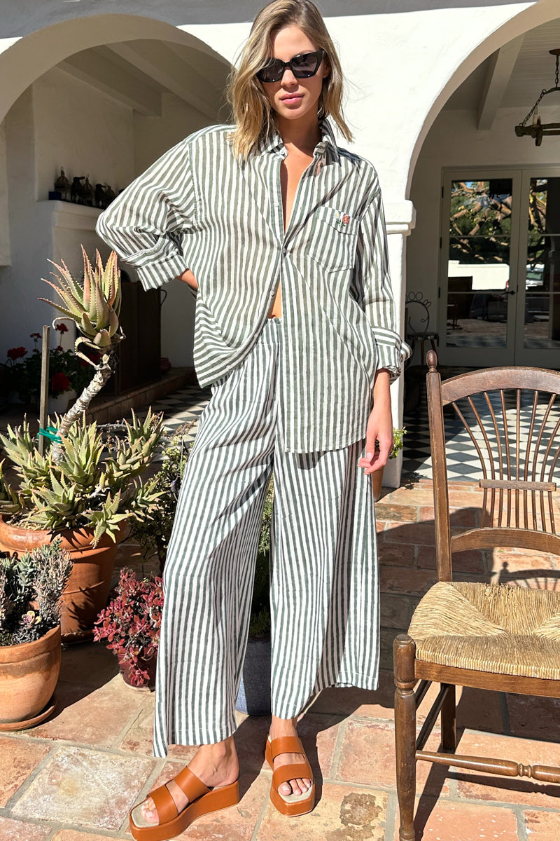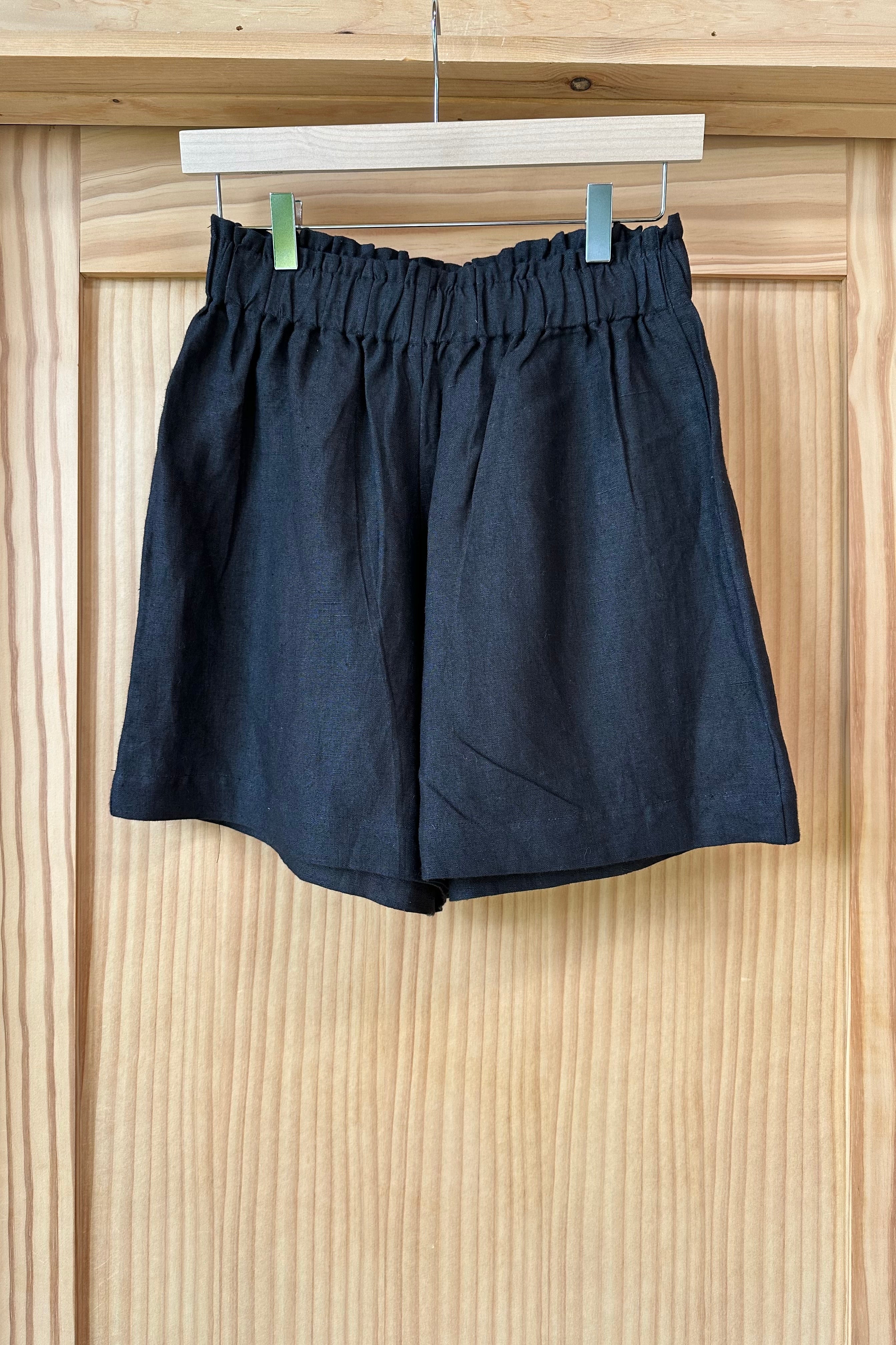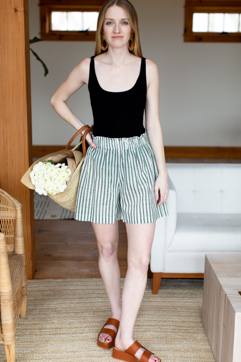 Linen with charcoal stripe Shirred, bound keyhole neckline with tie closure Flutter ruffle at shoulder Shirred bodice with two tier gathered skirt 2" wide removable sash Lined Side seam pockets...