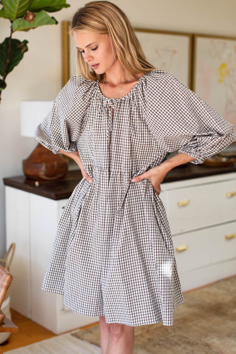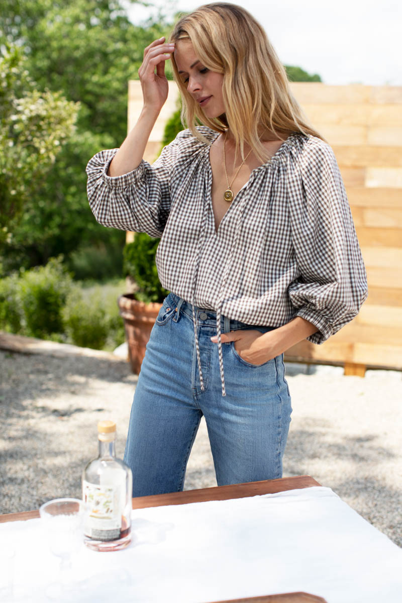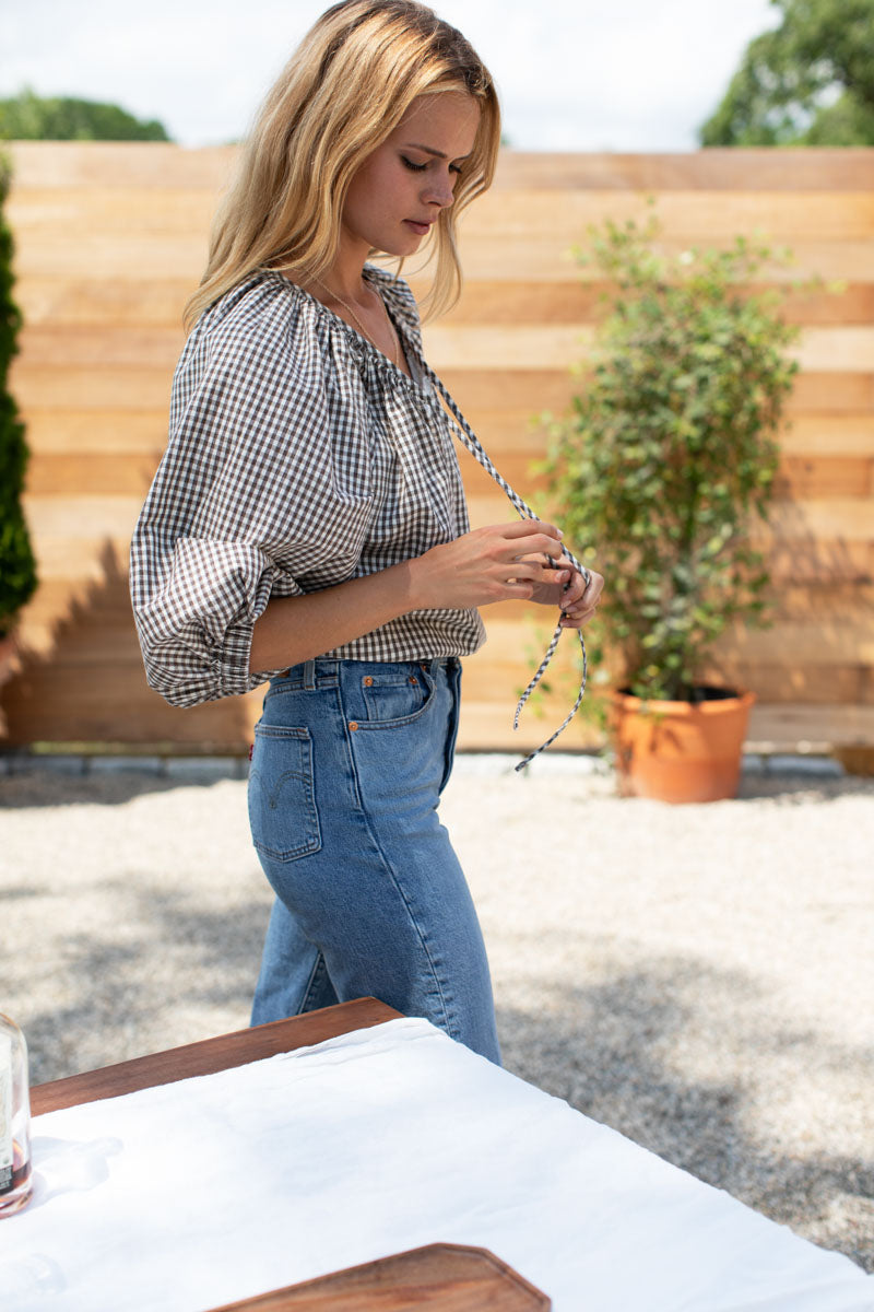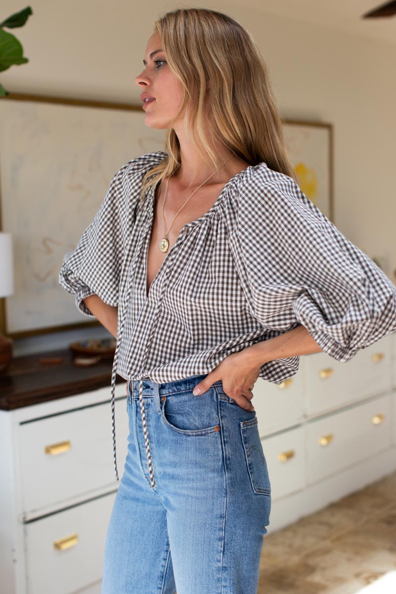 100% Cotton Gingham Shirred, bound neckline Keyhole and tie detail Blouson style full sleeves Gathered elastic cuff Model is a size XS/S and wearing a size Small for a more...