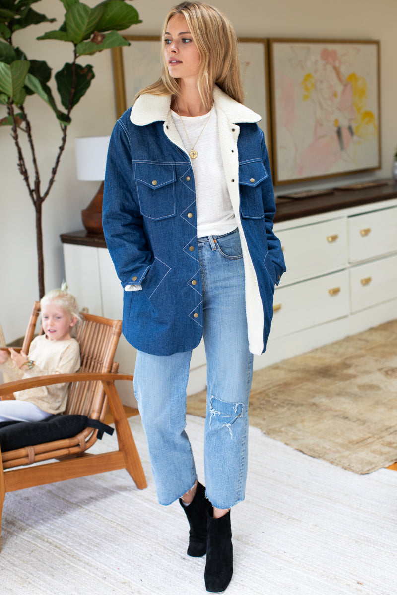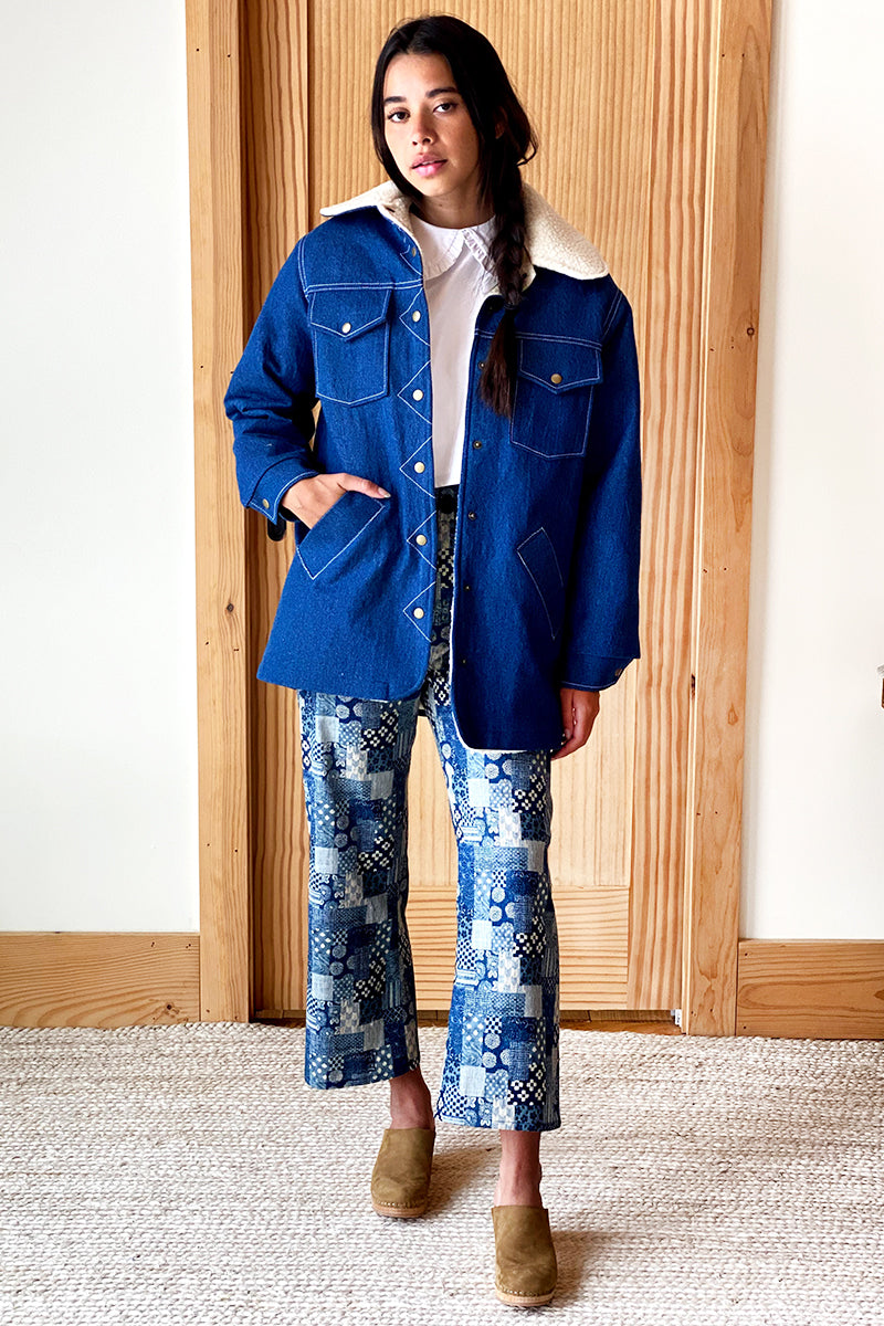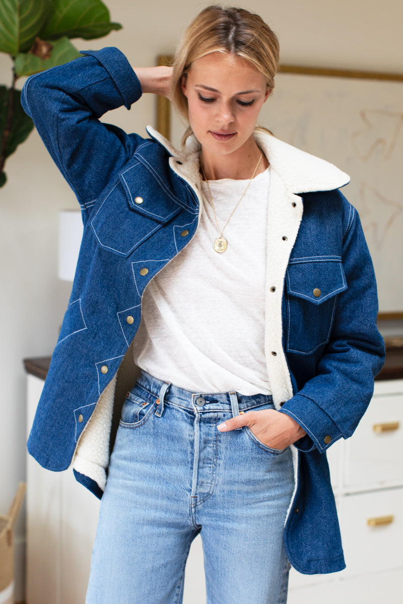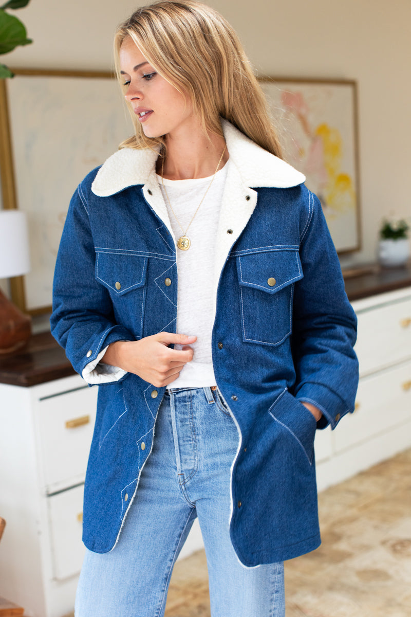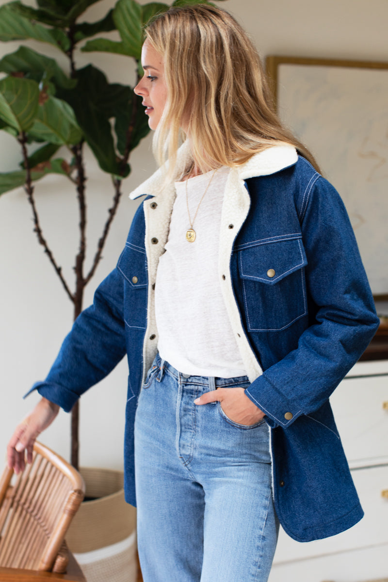 Vintage inspired 100% Cotton Chemical free Indigo denim Recycled poly sherpa lined Contrasting stitch detail Brass snap closures on front and cuff Flap and angled welt pockets on front Everyday...