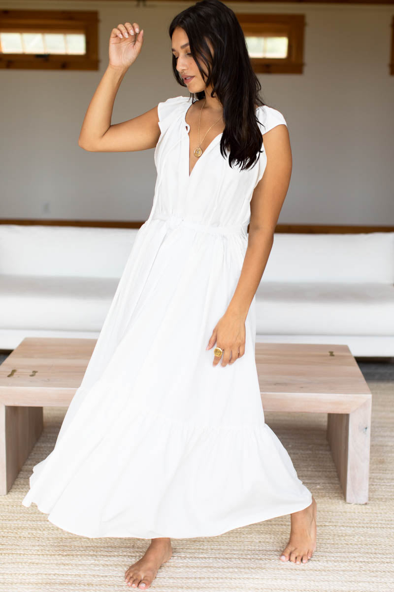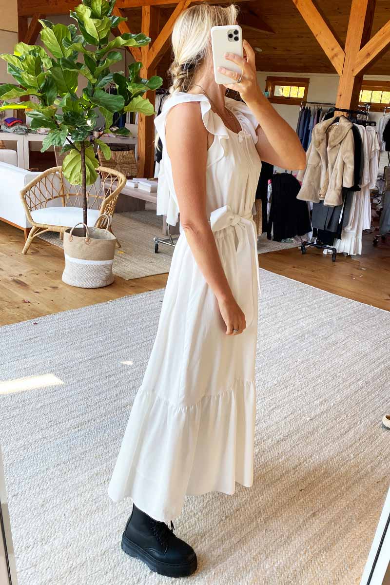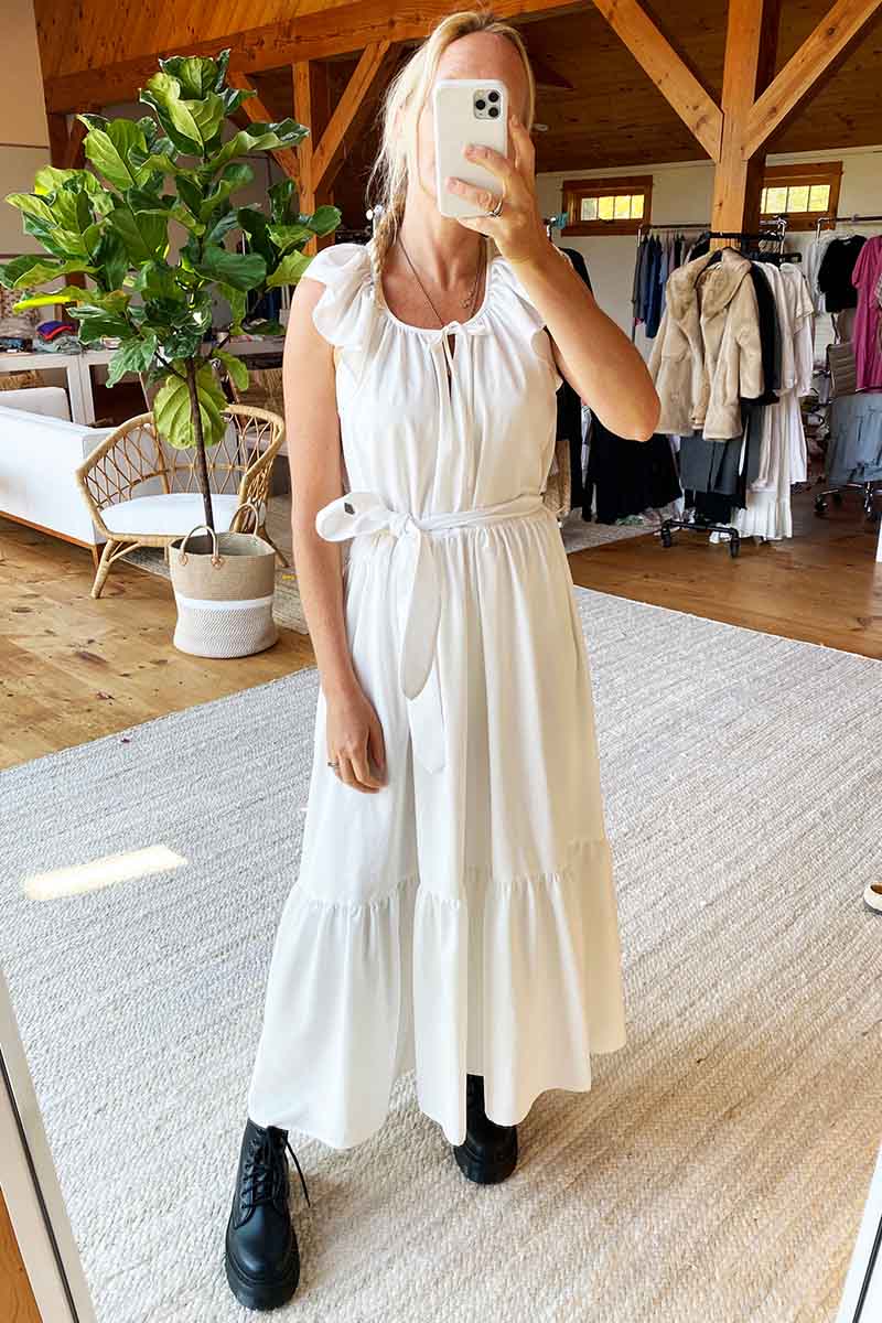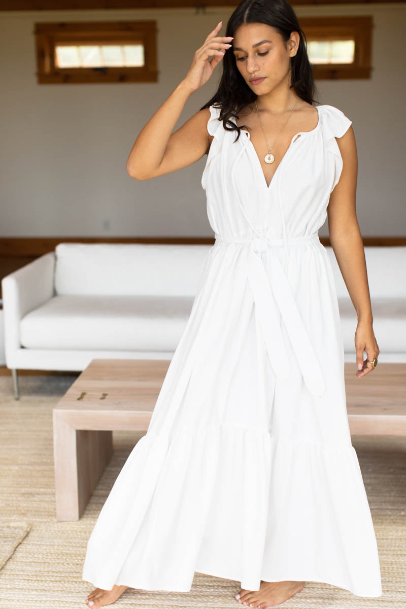 Tencel Shirred, bound keyhole neckline with tie closure Flutter ruffle at shoulder Shirred bodice with two tier gathered skirt 2" wide removable sash Lined Hand wash cold, line dry Made...