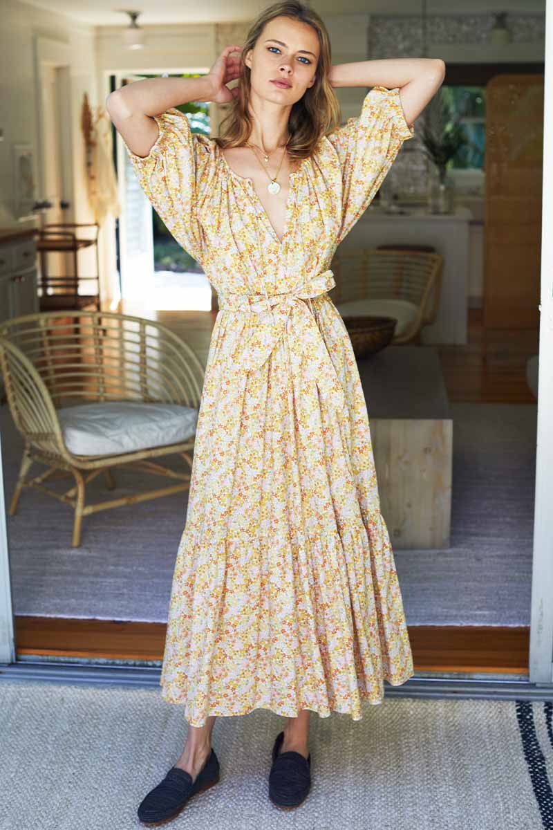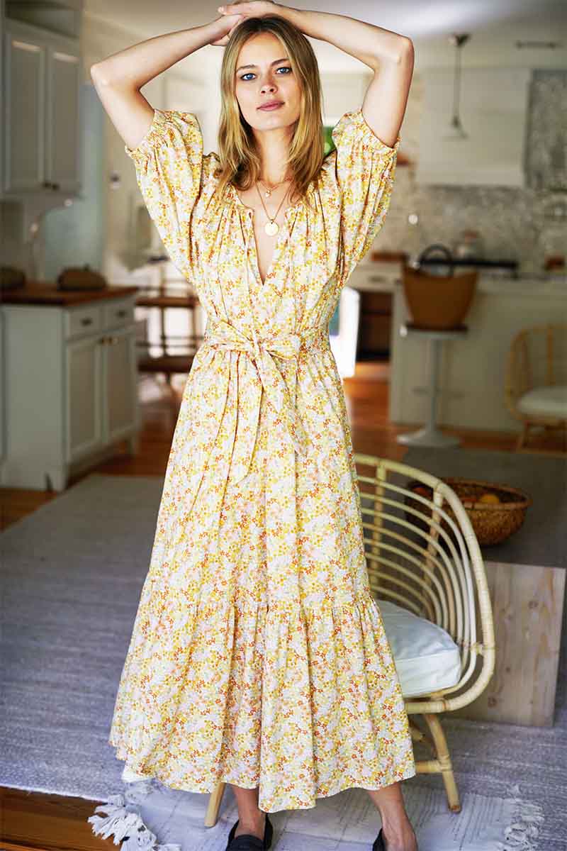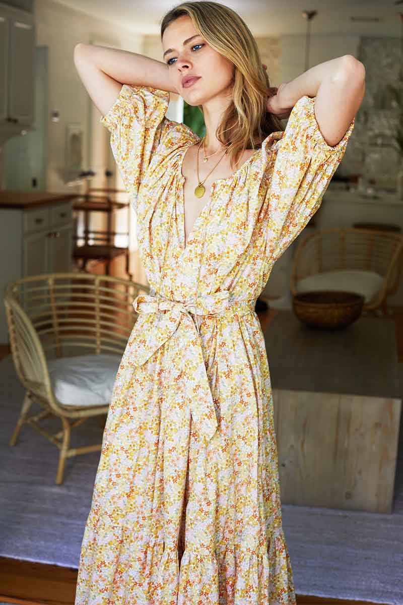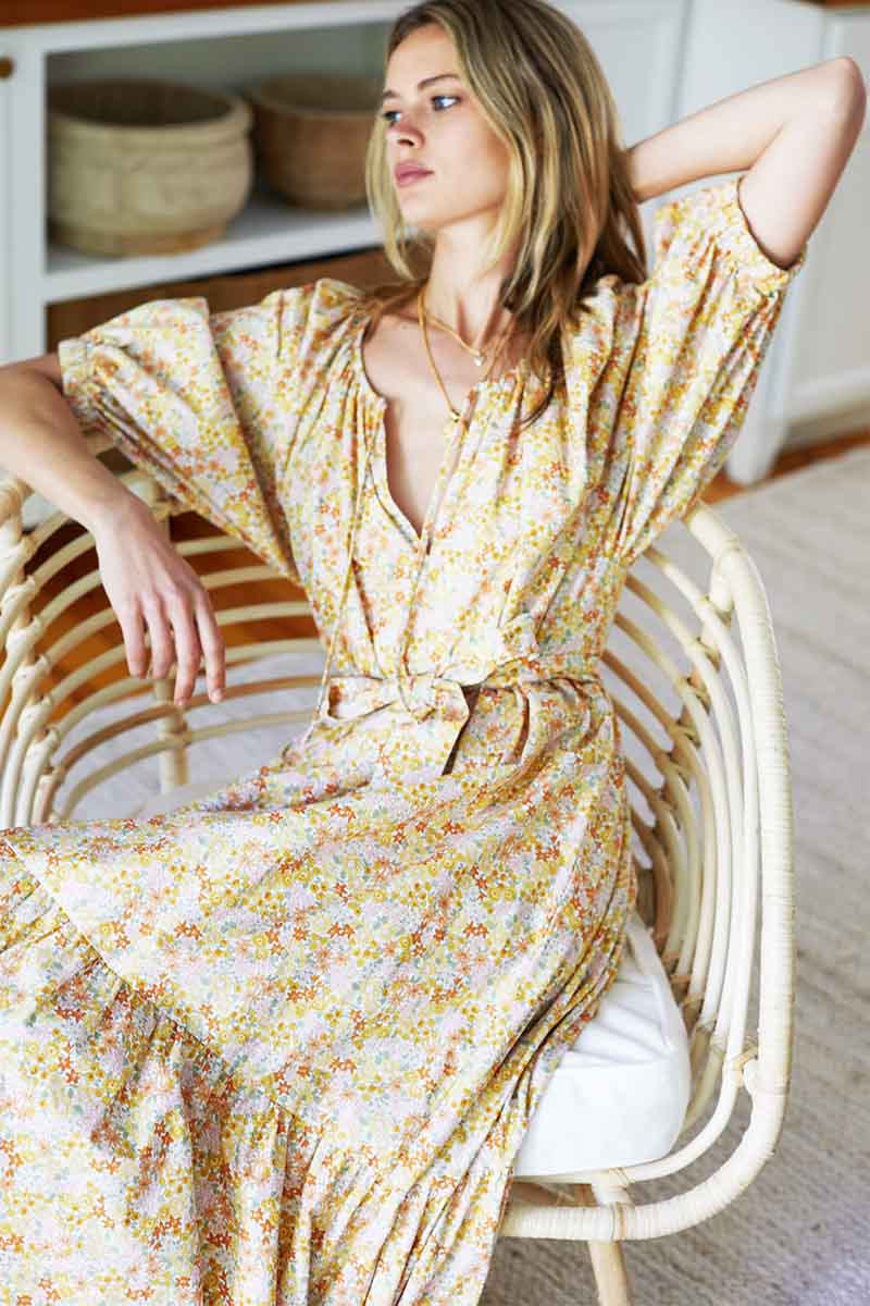 Tencel Shirred, bound keyhole neckline with tie closure Flutter ruffle at shoulder Shirred bodice with two tier gathered skirt 2" wide removable sash Lined Hand wash cold, line dry Made...