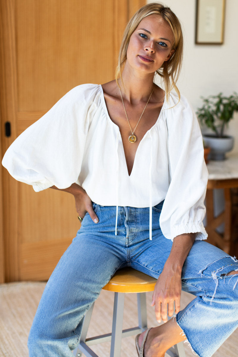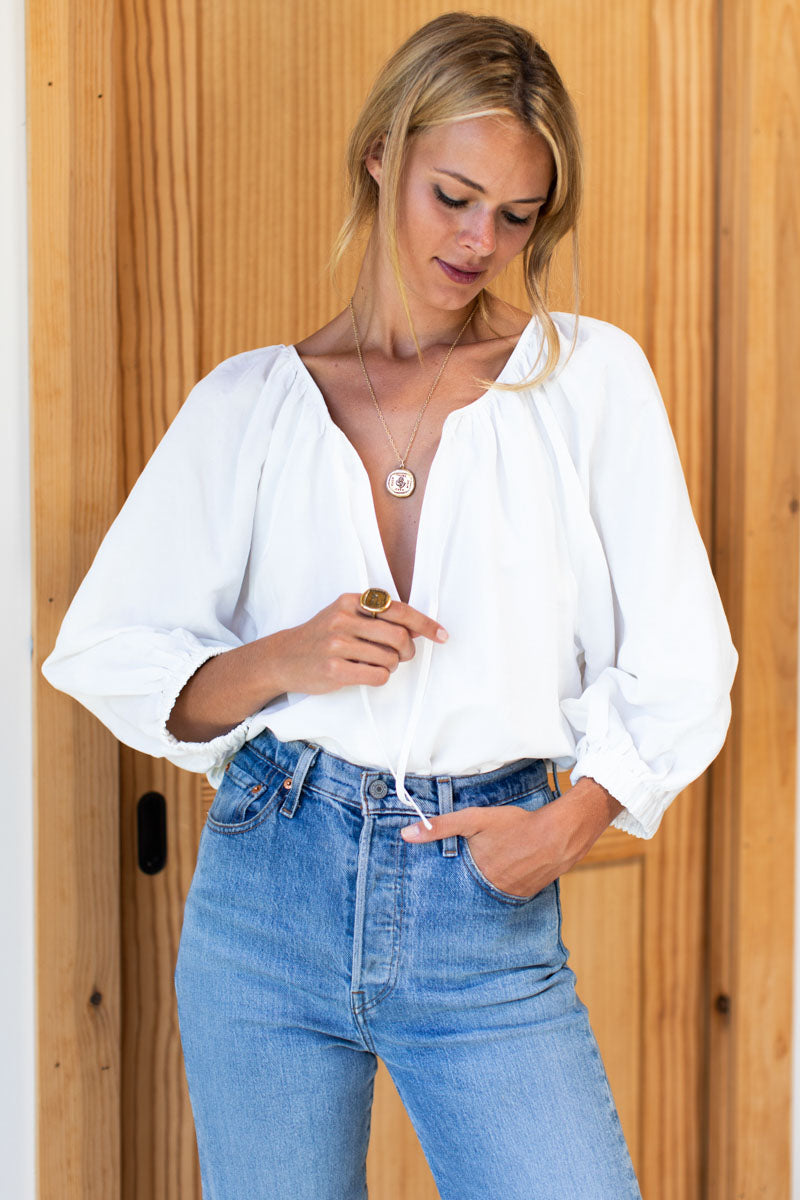 100% Cotton Poplin Shirred, bound neckline Blouson style full sleeves Gathered elastic cuff Lined Made in NYC