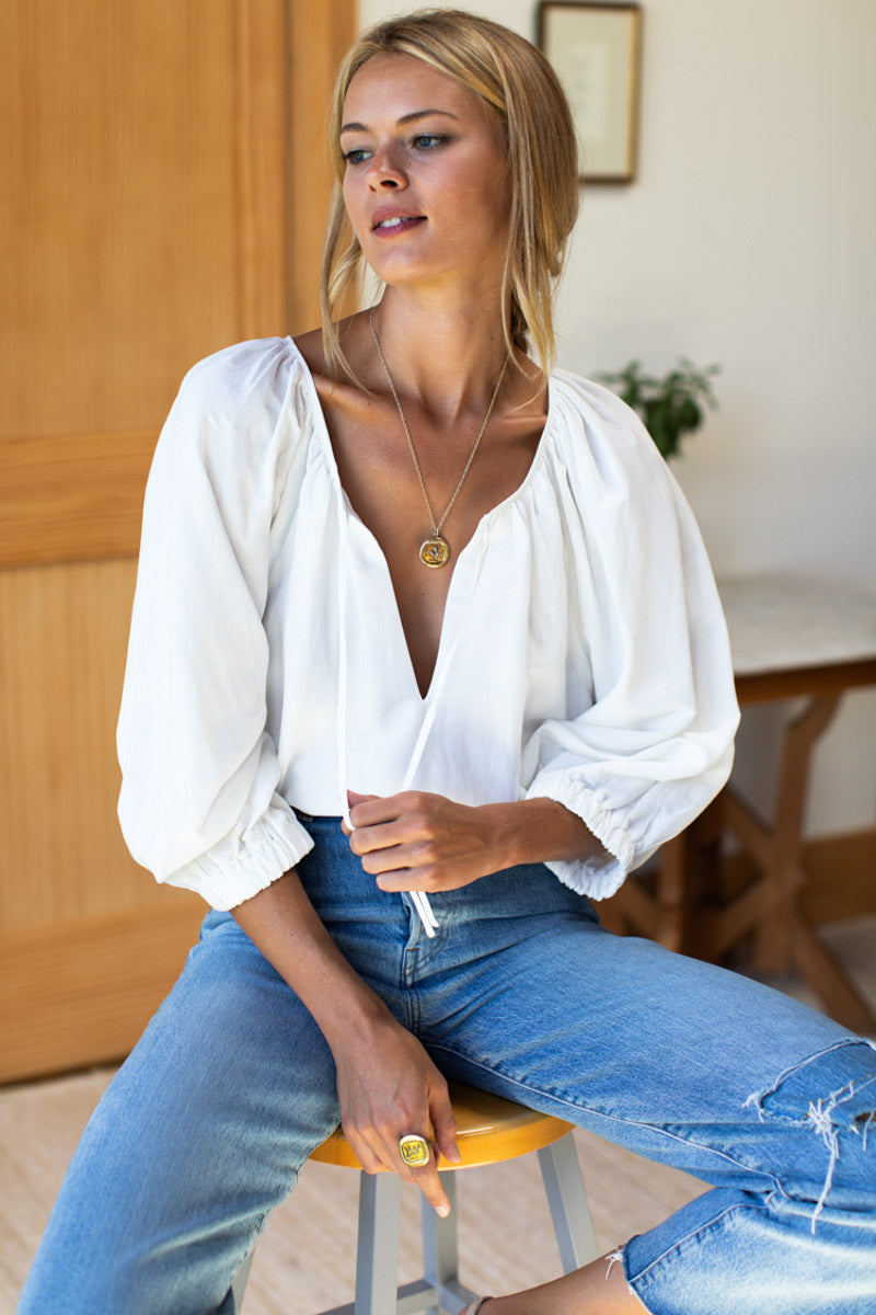 Linen, Viscose blend Shirred, bound neckline Keyhole and tie detail Blouson style full sleeves Gathered elastic cuff Lined Model is a size XS/S and wearing a size Small for a...