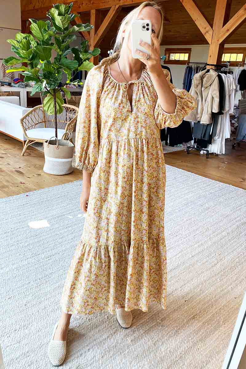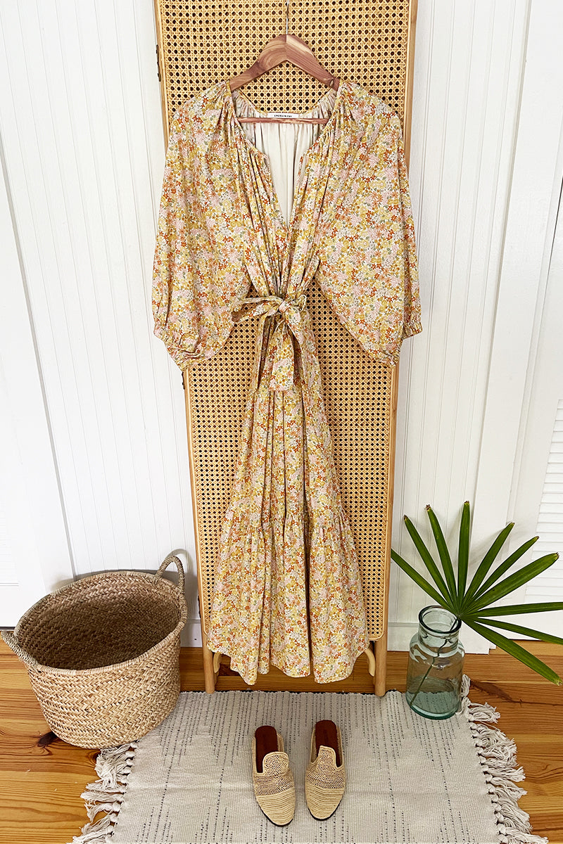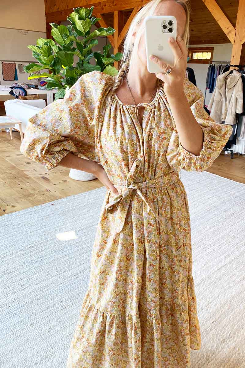 100% Cotton Calico Shirred, bound keyhole neckline with tie closure Blouson style full length sleeves Gathered elastic cuff Shirred bodice with two tier gathered skirt 2" wide removable sash Lined...