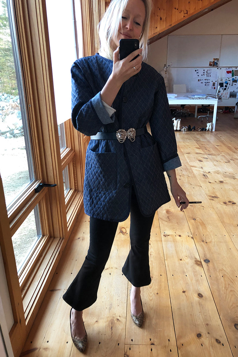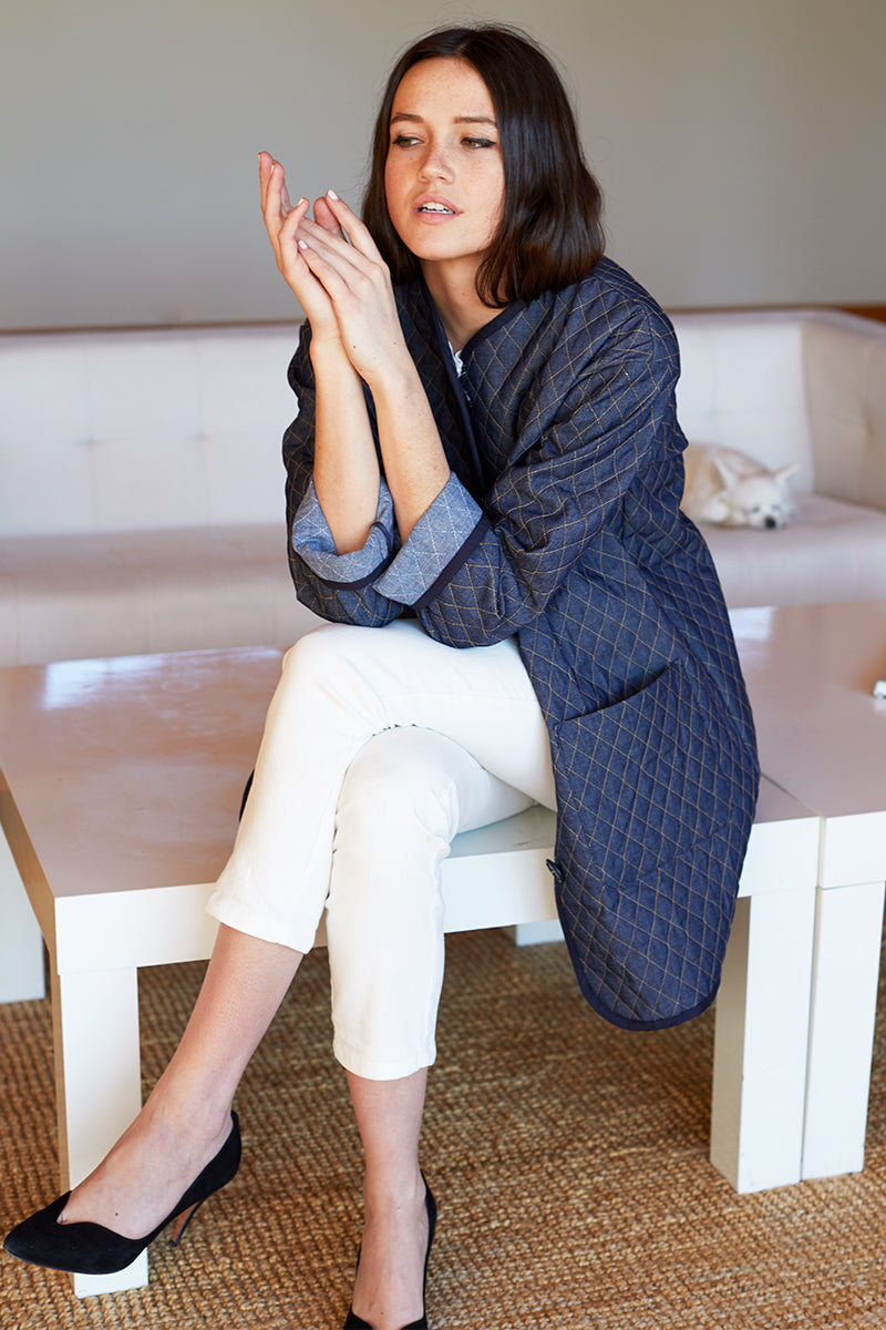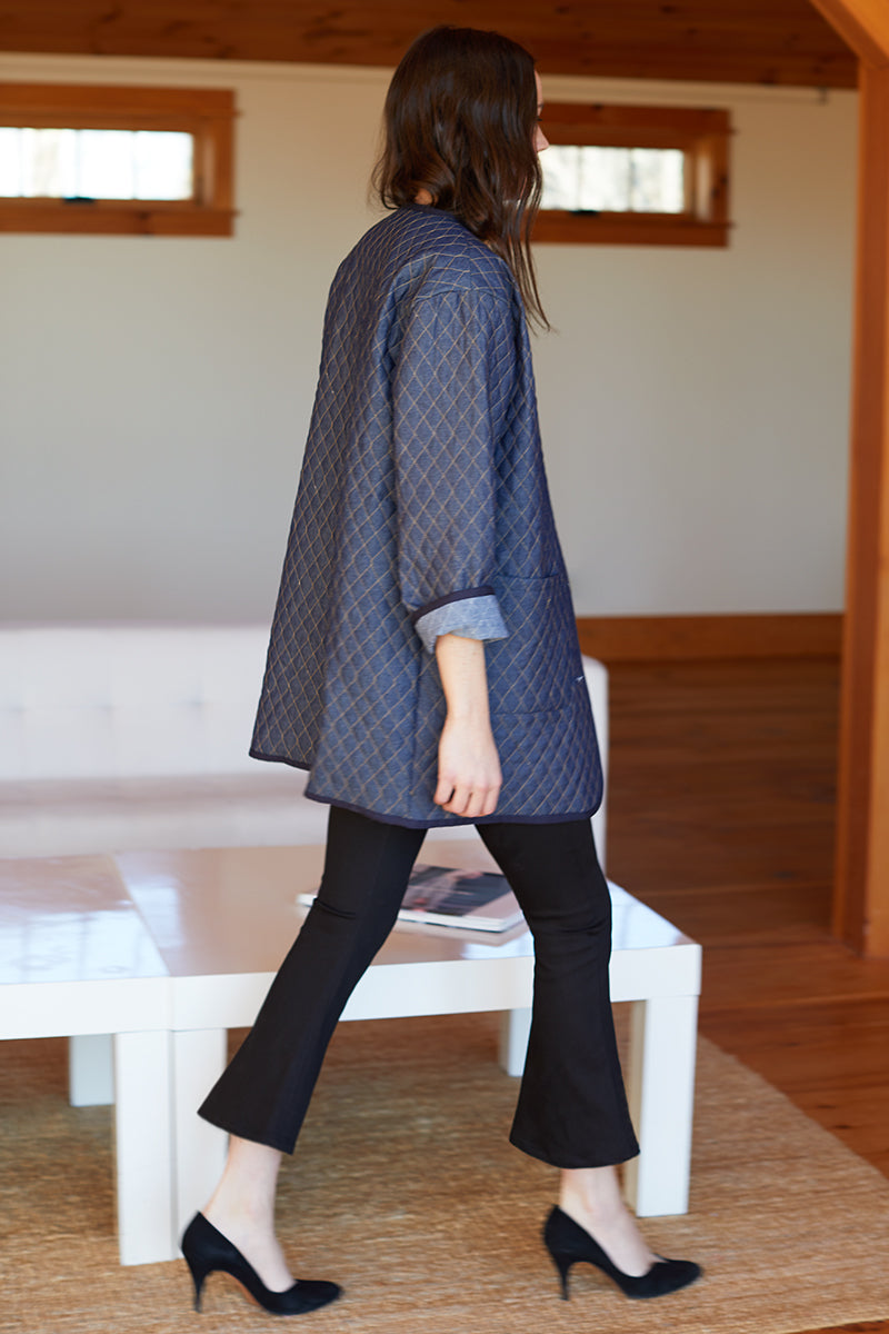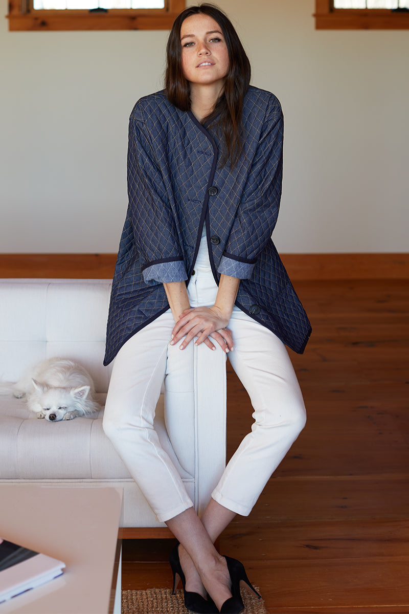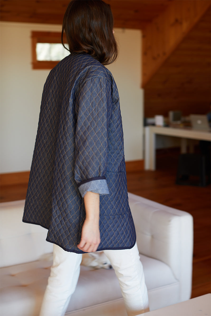 Cotton Quilted denim shell Bound seams Front patch pockets 5 button front closure Full length sleeves shown rolled up Model is wearing a size medium for an oversized...