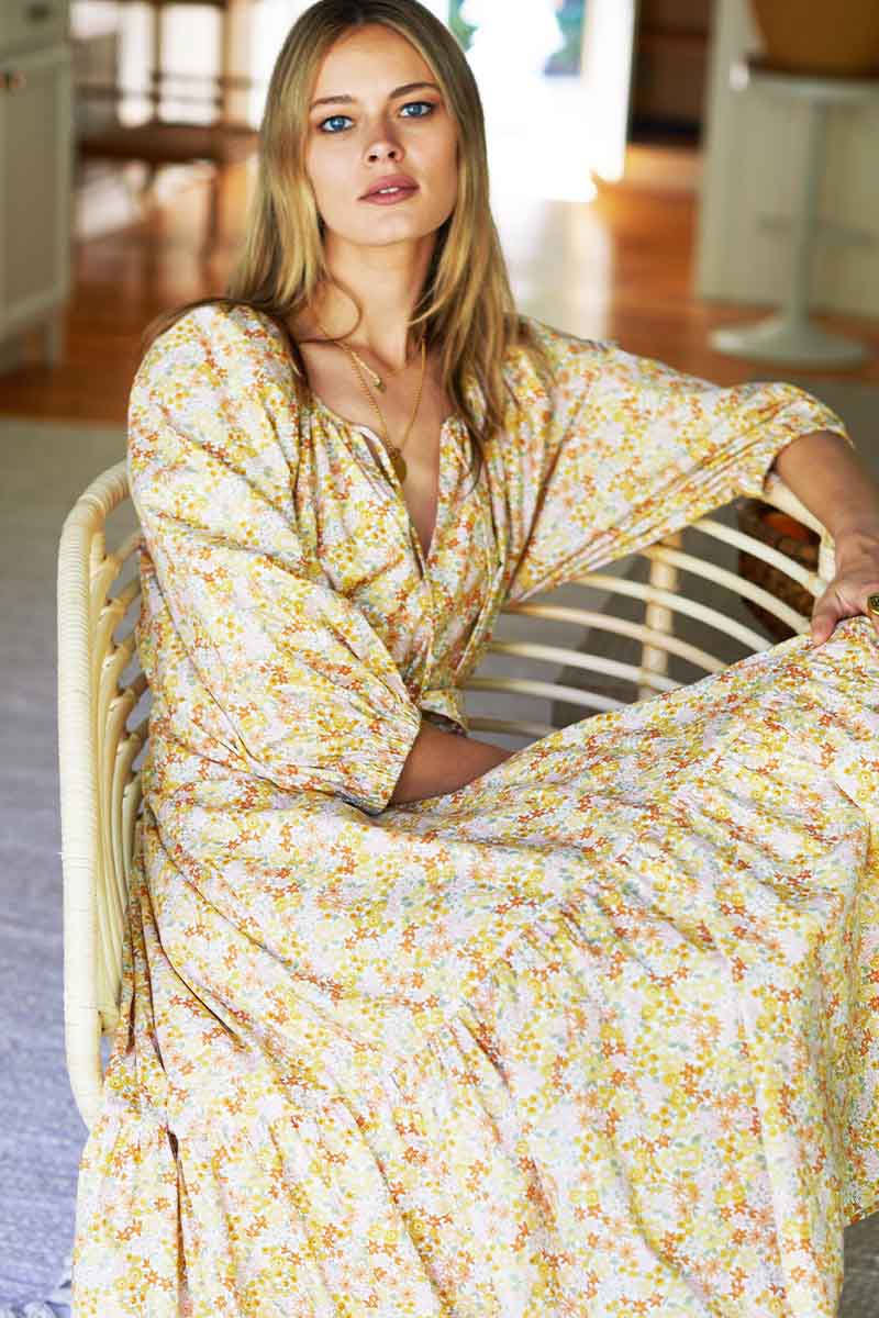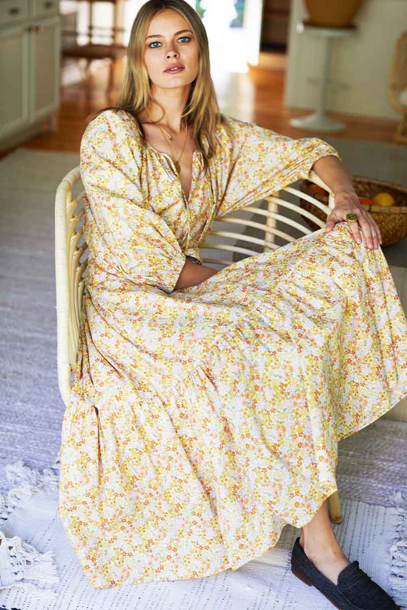 100% Cotton Shirred, bound keyhole neckline with tie closure Blouson style full length sleeves Gathered elastic cuff Shirred bodice with gathered skirt 2" wide removable sash Side seam pockets Model...