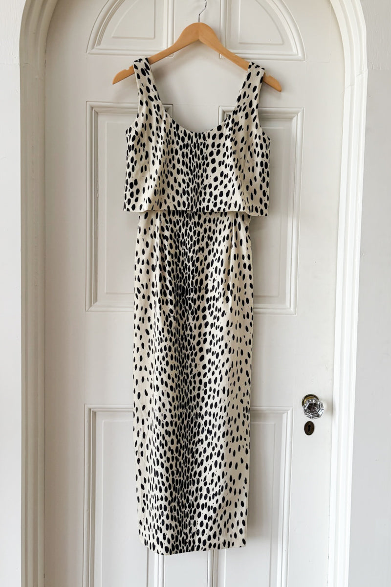 Party-ready & timelessly unique, a one piece dress that emulates separates. A modern take on a vintage concept. Made in our signature leopard linen print. Stretch Linen Sleeveless Scoop neckline...