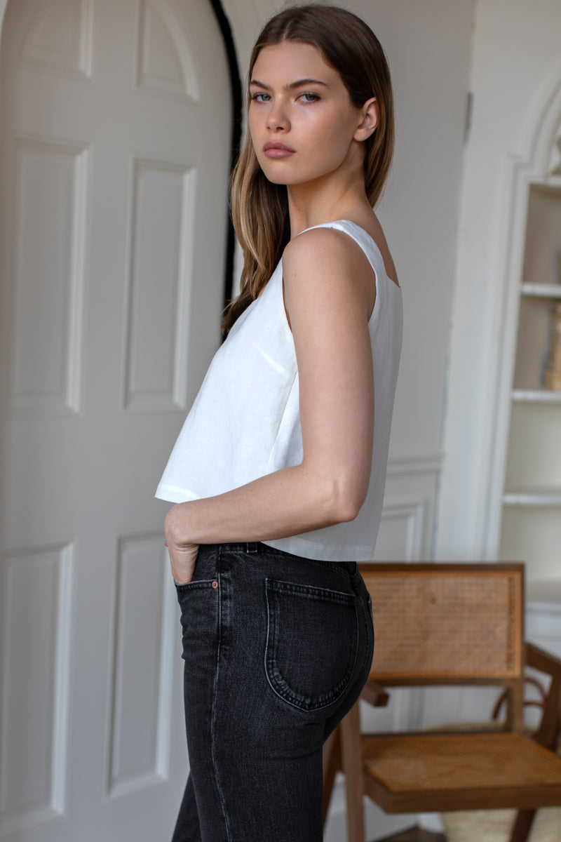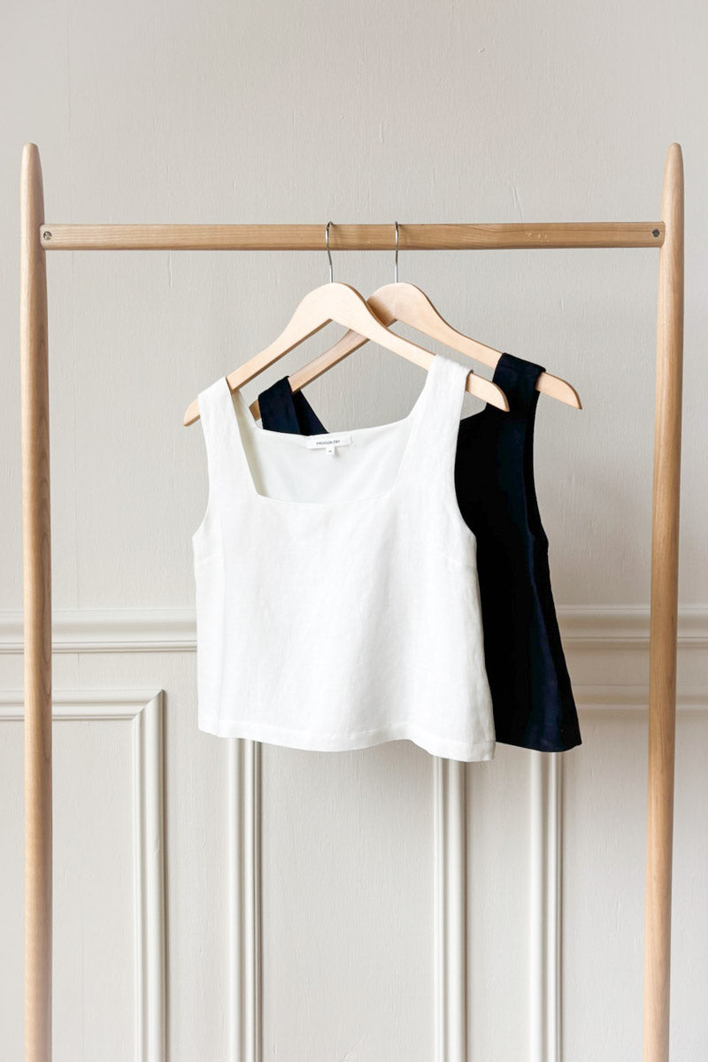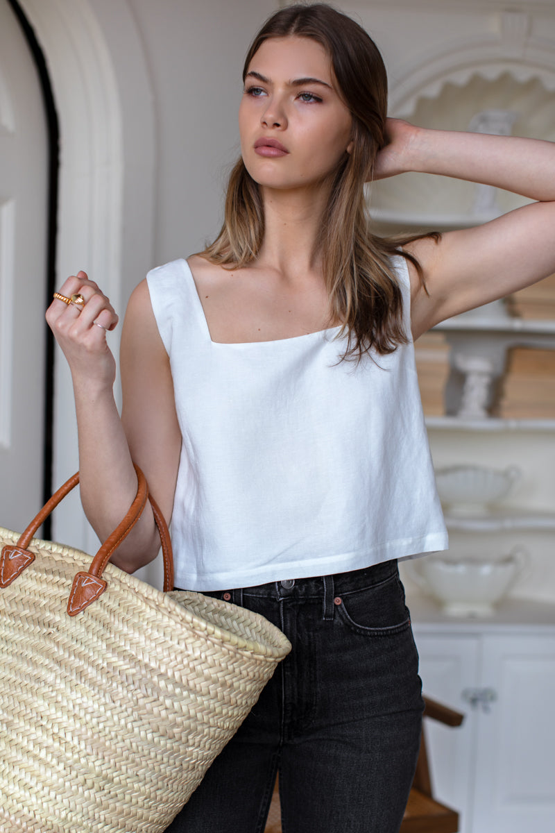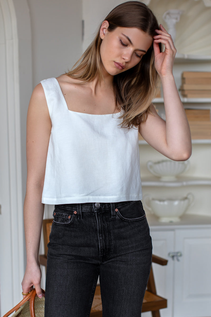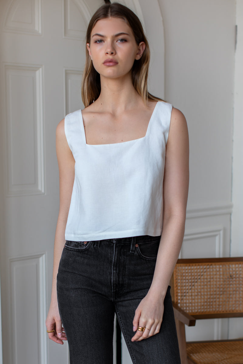 Linen viscose blend Square neckline Boxy fit Cropped fit Lined Made in NYC XXS: 33" Bust, 18" Length XS: 35" Bust, 18.5" Length S: 37" Bust, 19" Length M: 39"...