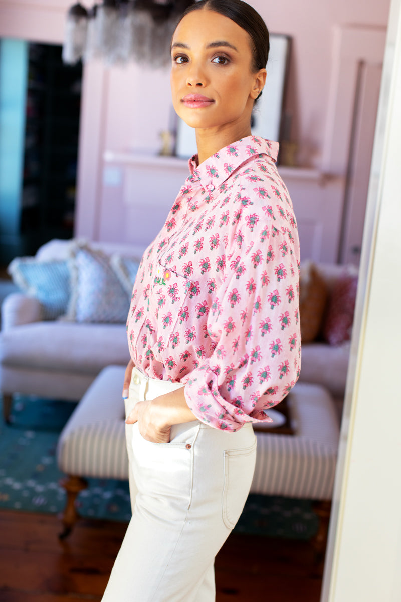 Made with 100% Organic Cotton Hand block printed using low impact dye Menswear inspired button down Hand embroidered chest pocket detail Button closure at cuff Full length sleeves Subtle shirt...