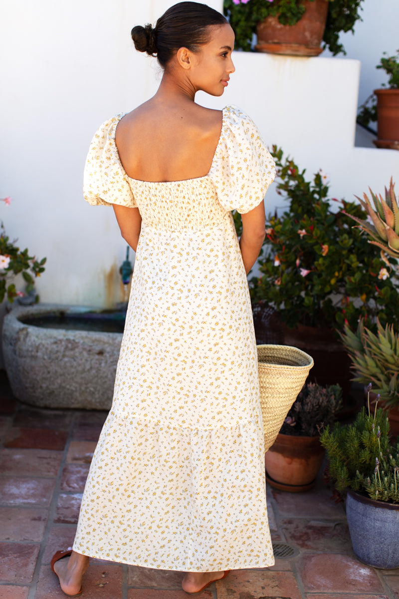 Favorite perfect fit maxi dress with updated size range and longer shirred bodice. Cotton Shirred elastic bodice Button front Square neckline Elastic at shoulder and cuff Puff sleeve Ruffle hem...