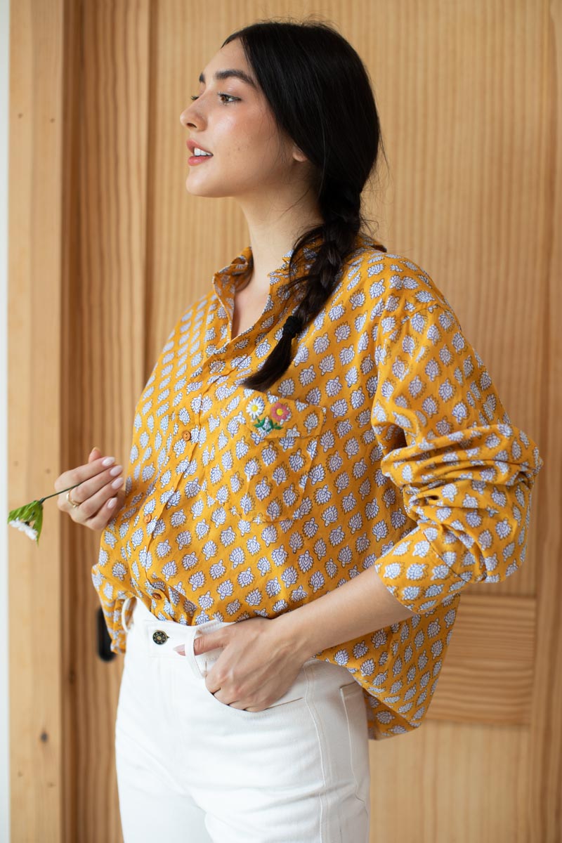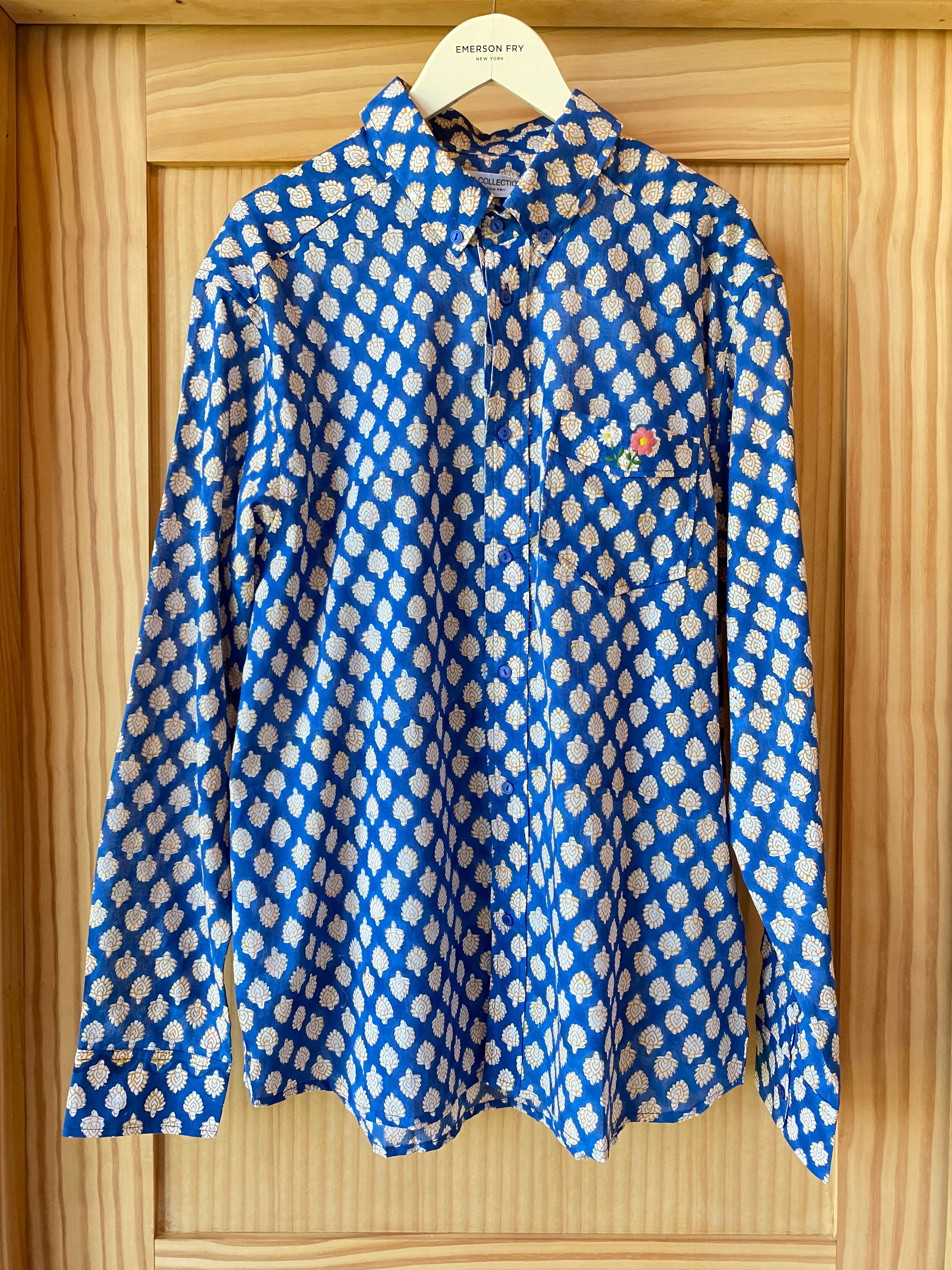 100% Light-weight Cotton Hand block printed using low impact dye Menswear inspired button down Classic shirt collar Chest pocket with embroidered detail Full length sleeves with button closure at cuff...
