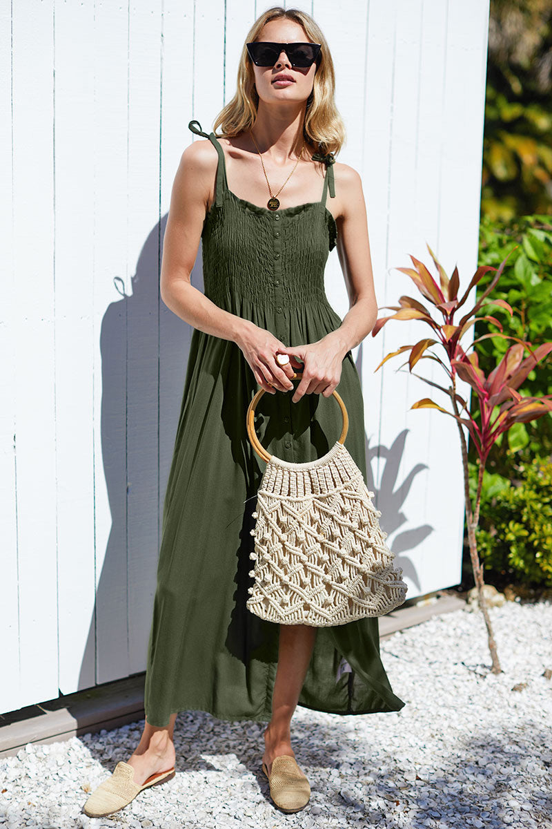 Modal Elastic shirred bust with adjustable tie shoulders Button front skirt Model is 5'9" wearing a size xs/s Hand wash, line dry Made in Rajasthan, India XS/S: Bust 27”, Low Hip...