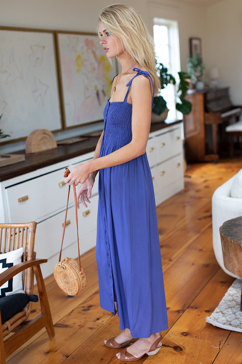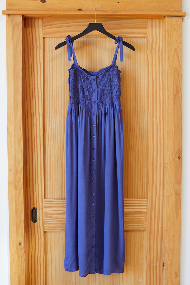 Modal Elastic shirred bust Adjustable tie shoulders Button front skirt Lined Hand wash, line dry Made in Rajasthan, India XS/S: Bust 27”, Low Hip 54.5”, Center Back Length 44”MED/LRG: Bust...