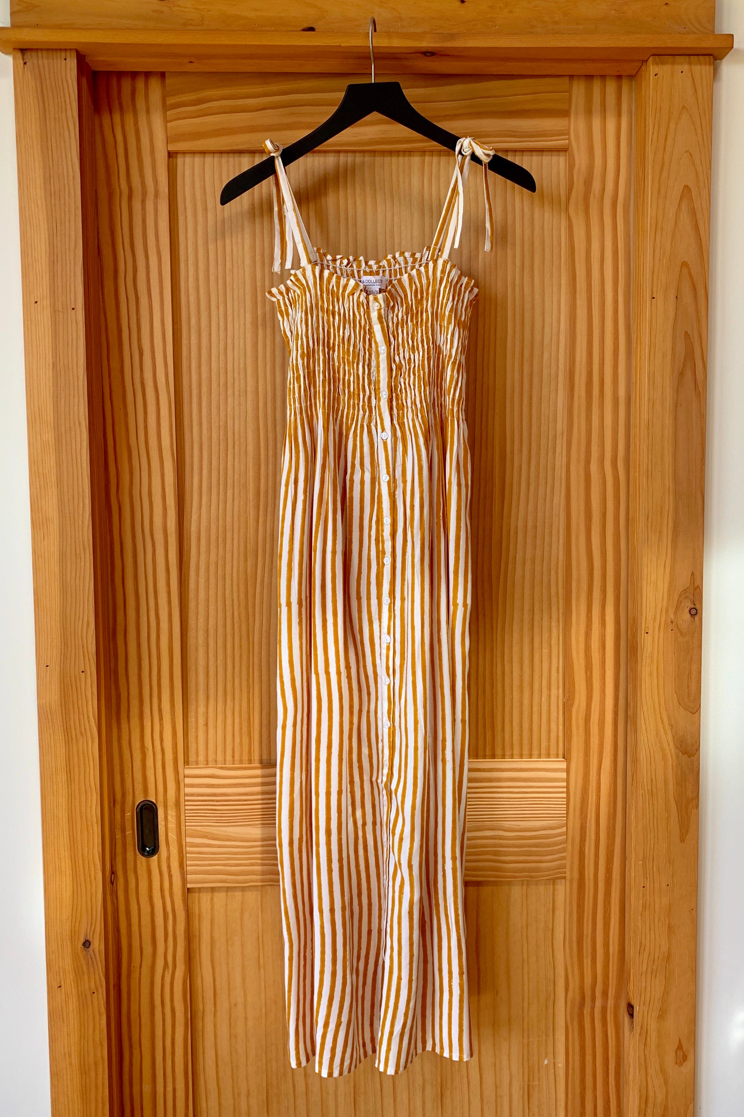 Flax Stripe Elastic shirred bust with adjustable tie shoulders Button front skirt Lined Hand wash, line dry Made in Rajasthan, India