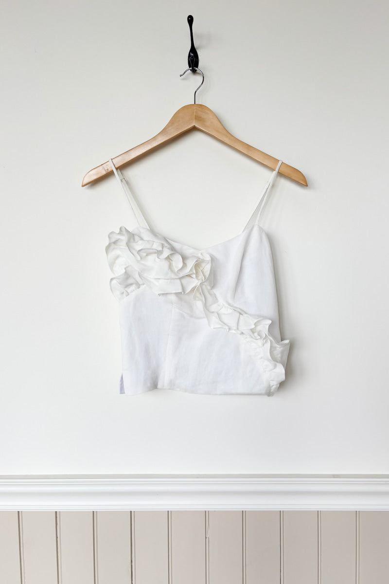 Linen Viscose Sweetheart neckline Shirred elastic panel at back Invisible side zip Layered ruffled detailing across front Cropped silhouette Princess seams w/ boning for structure Lined